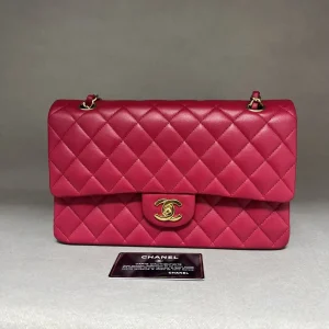 The CHANEL Classic Flap Jumbo in pink lambskin features iconic diamond quilting, a gold chain strap, and the signature CC turn-lock closure, exuding timeless elegance.