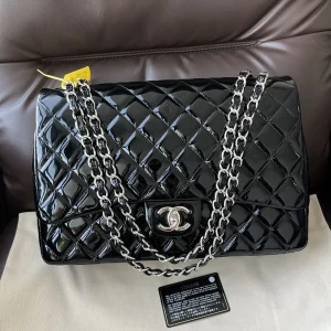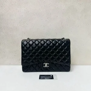 The CHANEL Maxi Classic Flap Bag in black lambskin showcases the iconic diamond quilting, signature CC turn-lock closure, and a luxurious silver chain strap, representing timeless elegance and sophistication.