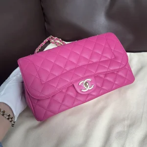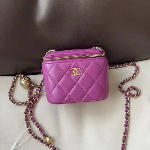 The CHANEL Mini Vanity on Pearl Chain in pink lambskin combines a delicate pearl-detailed strap with the iconic quilted design for a modern, elegant look.