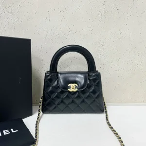 The CHANEL Black Quilted Aged Calfskin Mini Nano Kelly Bag features iconic quilted leather, a brushed gold turnlock clasp, and a versatile top handle with chain.