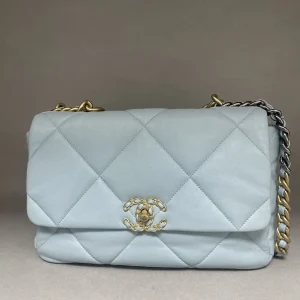 Product details • 16 x 26 x 9 cm • Baby Blue lambskin leather • Gold and Ruthenium-tone hardware • Twistlock closure • Signature CC Clasp in interwoven chain effect • Shoulder...