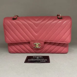 Product Details • The iconic CHANEL Handbag • Medium Size • Material: Lambskin & Gold-Tone Meta • Colour: Pink • Hardware: Gold • Height: 15.5 cm • Width: 25.5 cm...