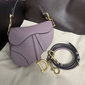 The DIOR Mini Saddle Bag in purple grained calfskin showcases the iconic saddle silhouette with a modern twist, complete with an adjustable strap for versatile styling.