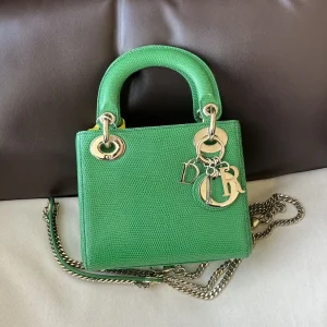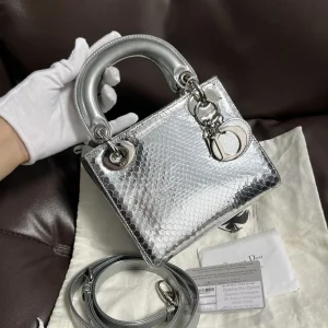 The DIOR Mini Lady Dior Bag in limited edition python leather features the iconic Cannage quilting and metal 'D.I.O.R.' charm, making it an elegant and exclusive collector's piece.