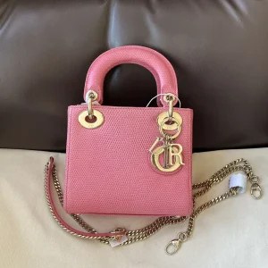 The DIOR Mini Lady Dior Pink Python Leather Bag features the iconic Cannage quilting and metal 'D.I.O.R.' charm, making it an elegant and exclusive collector's piece.