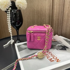 The CHANEL Mini Vanity on Pearl Chain in pink lambskin combines a delicate pearl-detailed strap with the iconic quilted design for a modern, elegant look.