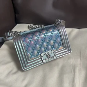 The Chanel Boy bag in iridescent purple quilted calfskin with silver-tone hardware is a captivating piece, where the collection’s signature structured silhouette is transformed by a luminous, color-shifting finish and...