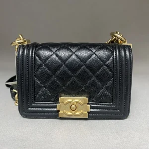The Chanel Mini Boy Bag in black quilted leather with gold hardware is a modern emblem of edgy sophistication, reinterpreting the collection’s signature structured silhouette and double C closure in...