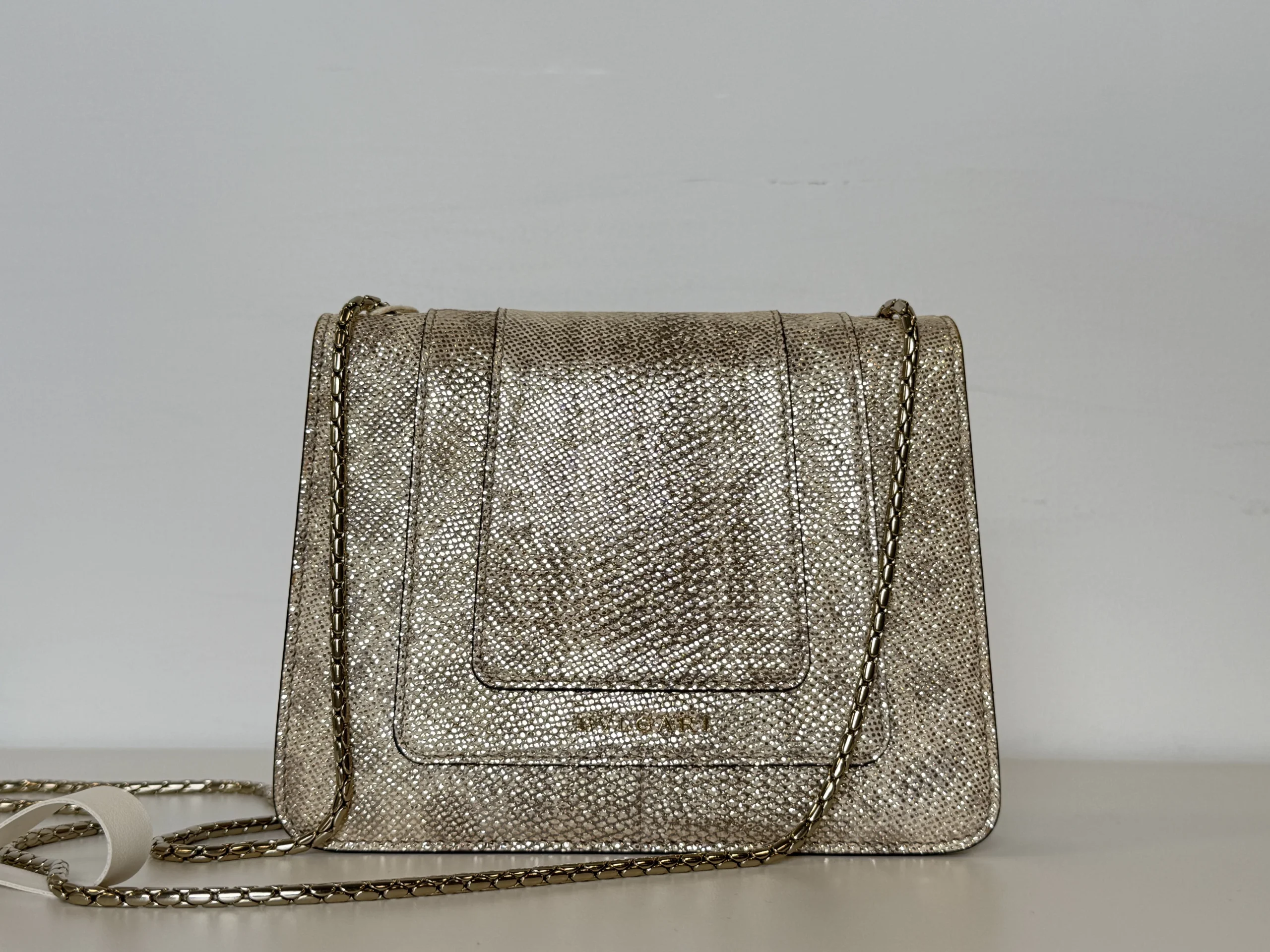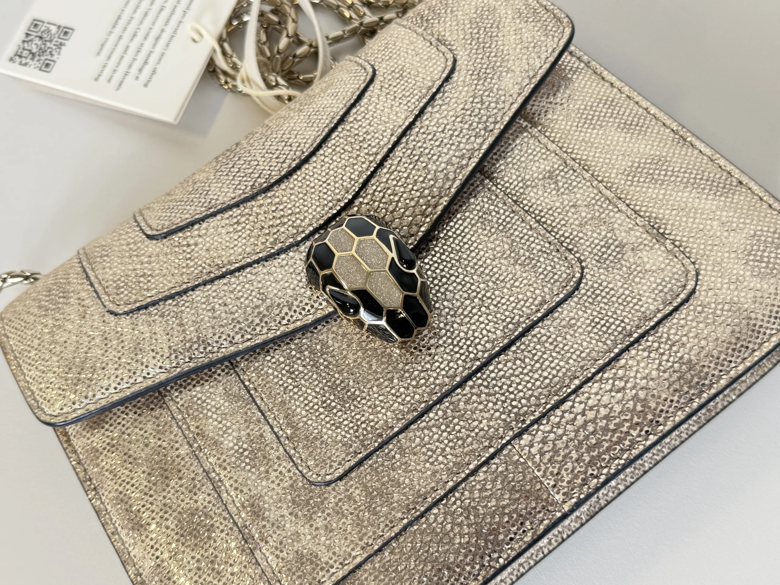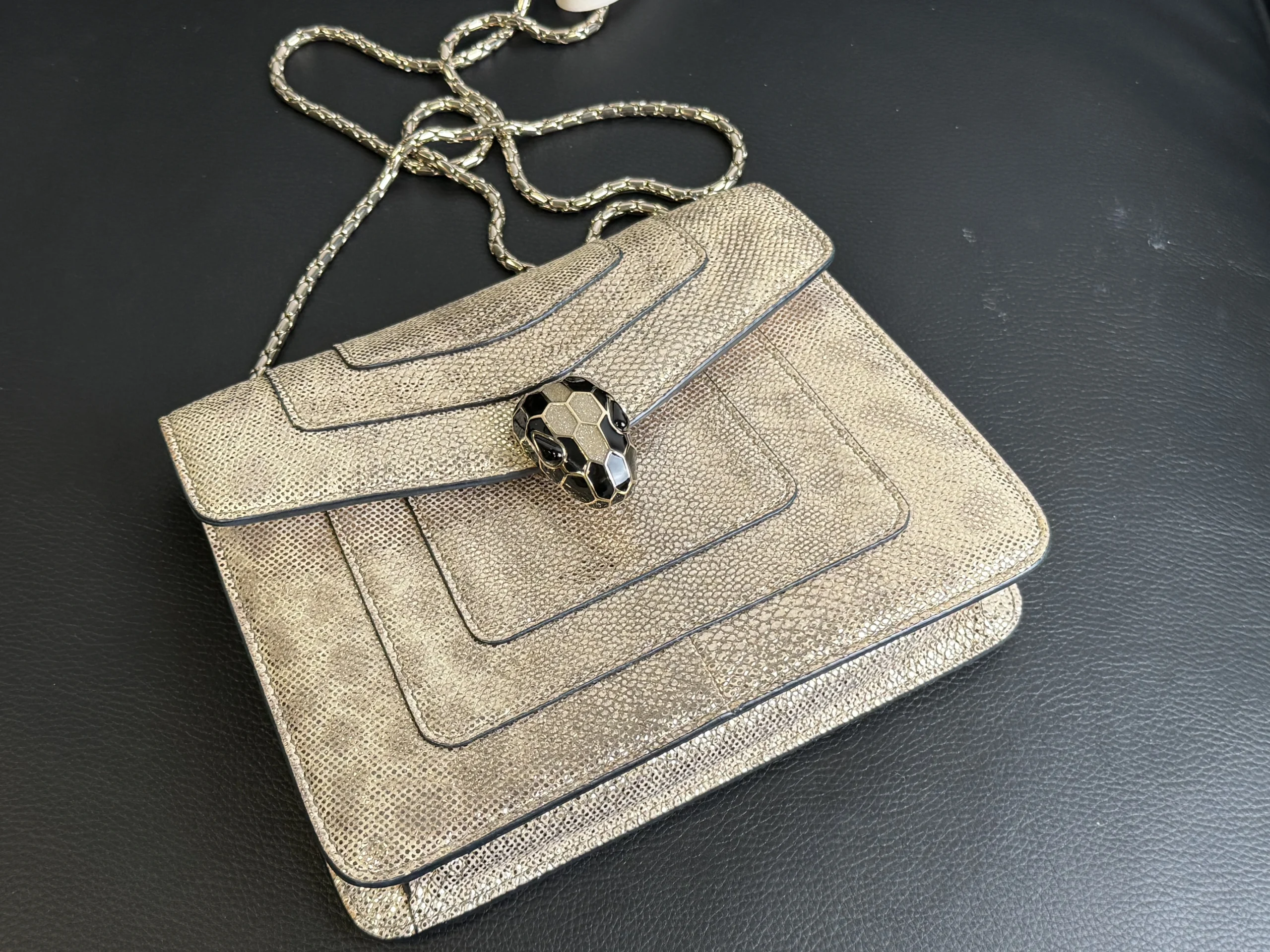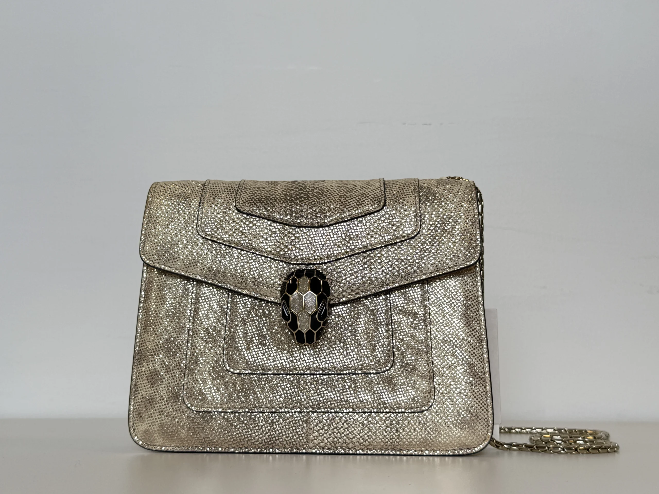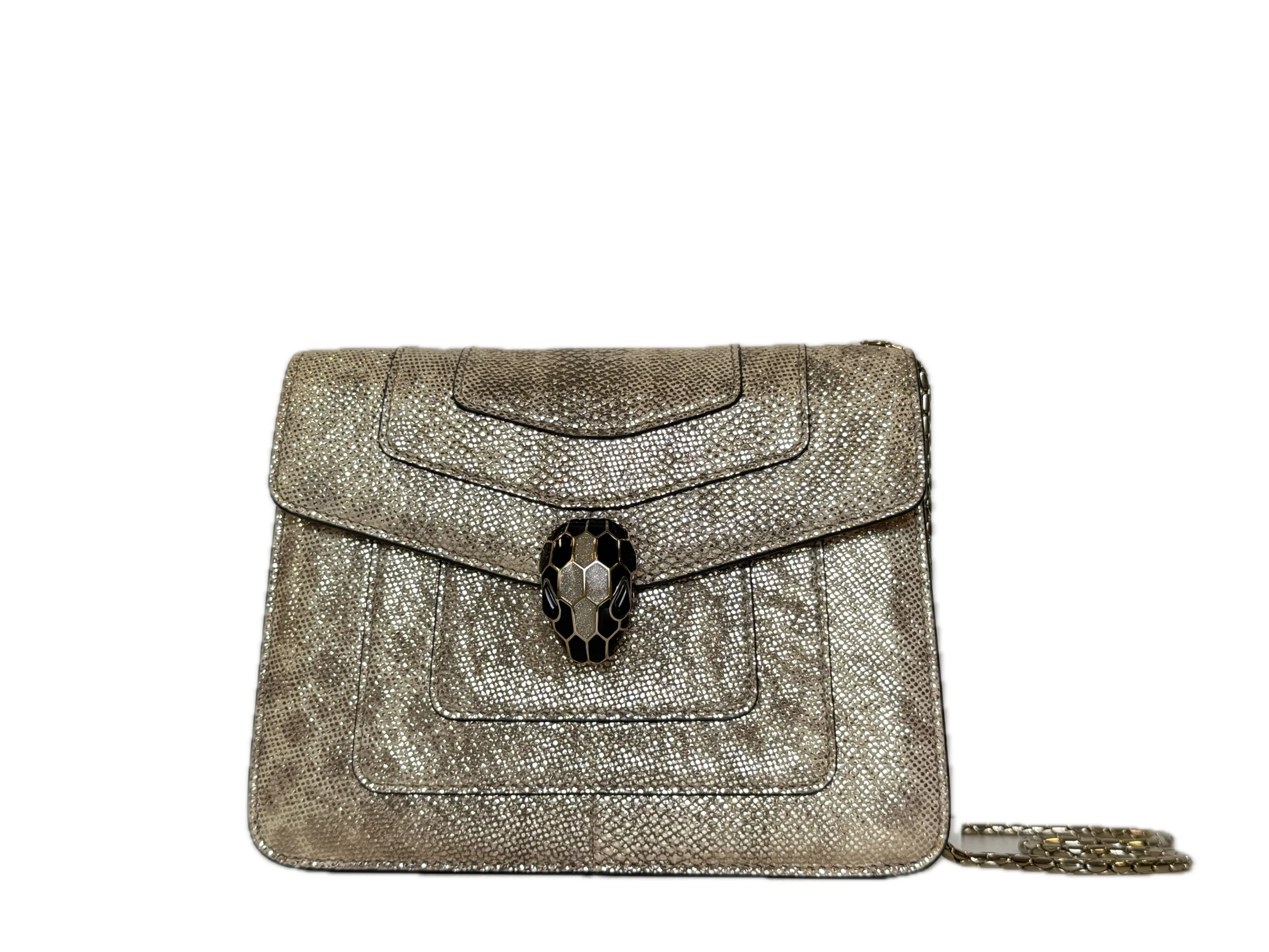 BVLGARI Serpenti Forever Shoulder Bag showcases the house’s iconic serpent motif in a refined and contemporary design.Crafted from shimmering light gold striated calf leather, the bag features a unique textured finish reminiscent of natural mineral inclusions. The signature snakehead magnetic closure is adorned with black zirconia pavé scales and black onyx eyes, delivering a bold yet elegant statement. Designed with a sliding chain strap, it can be worn both as a shoulder bag or crossbody. The interior is lined in soft nappa leather and includes practical compartments, making it ideal for both day and evening use.