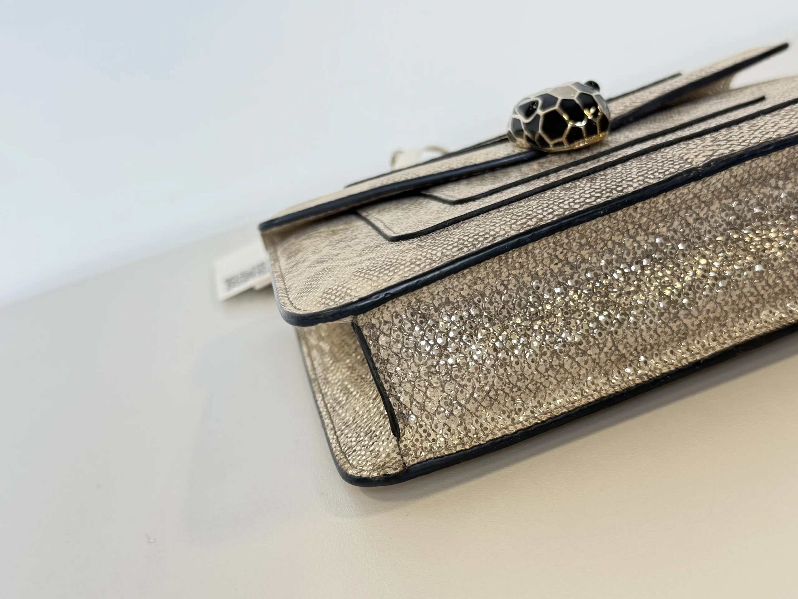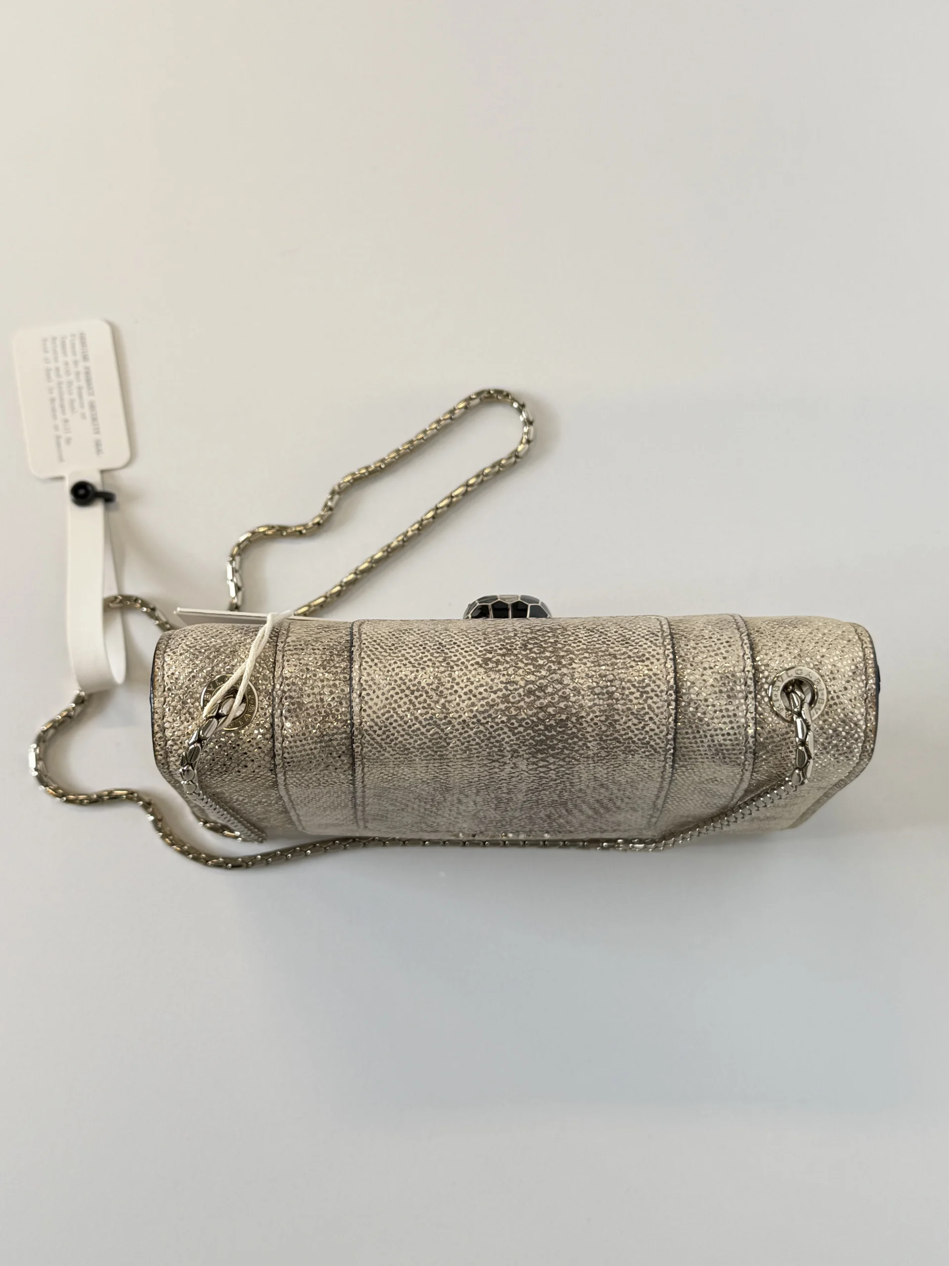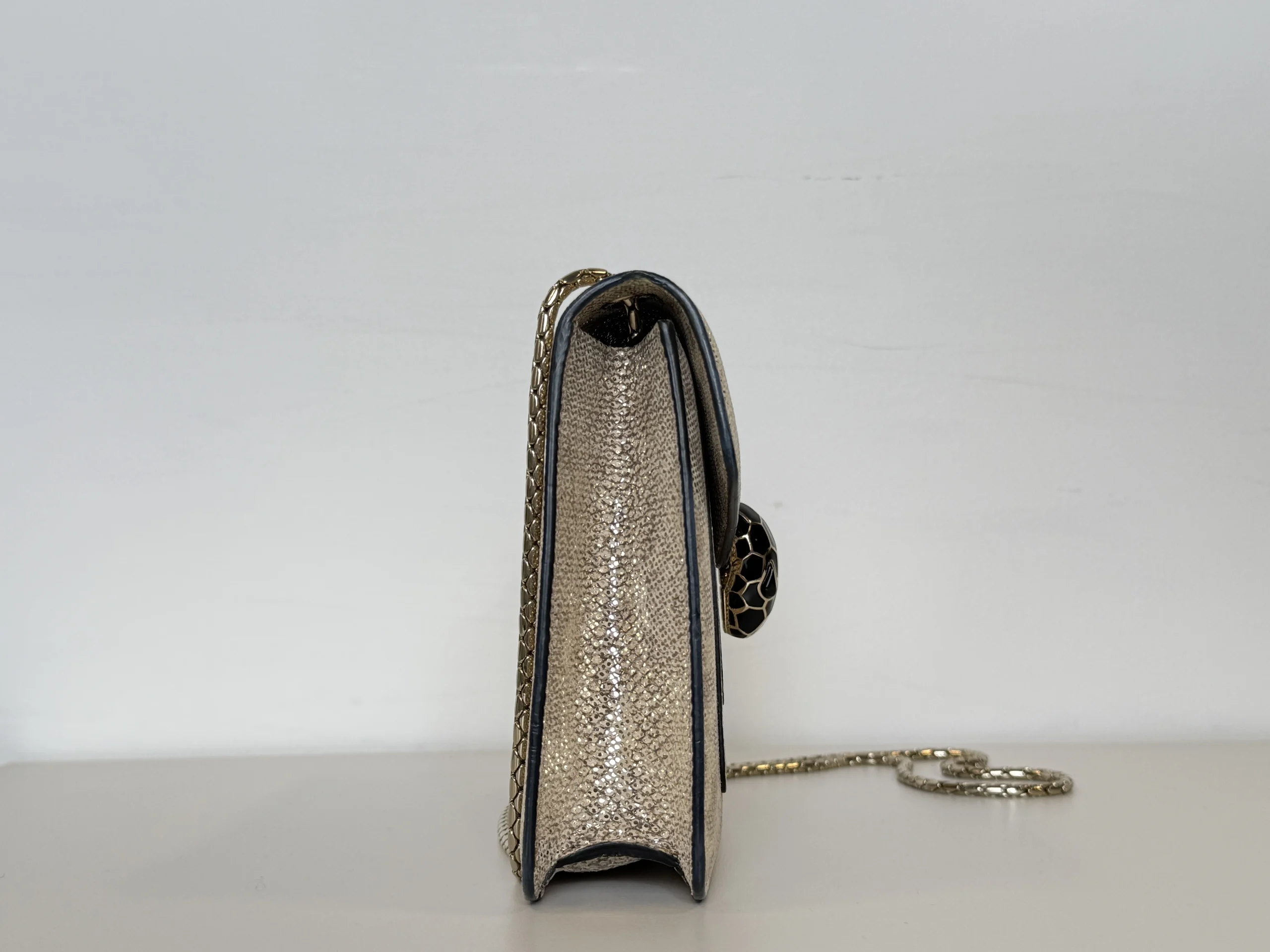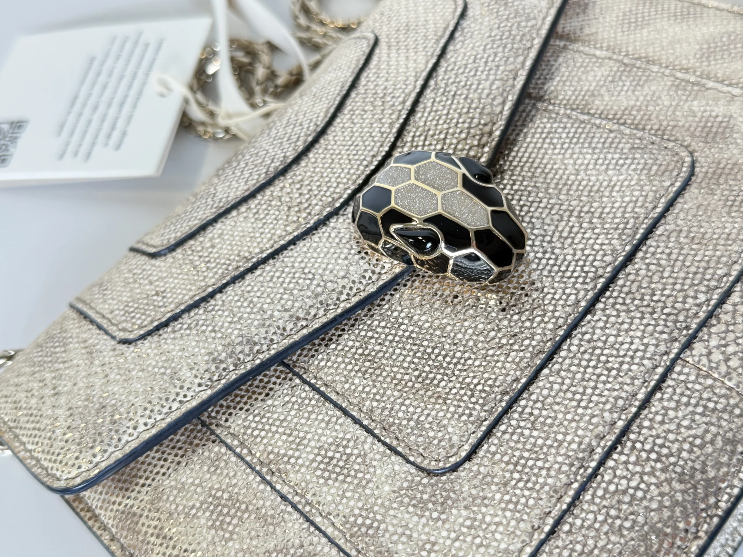 BVLGARI Serpenti Forever Shoulder Bag showcases the house’s iconic serpent motif in a refined and contemporary design.Crafted from shimmering light gold striated calf leather, the bag features a unique textured finish reminiscent of natural mineral inclusions. The signature snakehead magnetic closure is adorned with black zirconia pavé scales and black onyx eyes, delivering a bold yet elegant statement. Designed with a sliding chain strap, it can be worn both as a shoulder bag or crossbody. The interior is lined in soft nappa leather and includes practical compartments, making it ideal for both day and evening use.