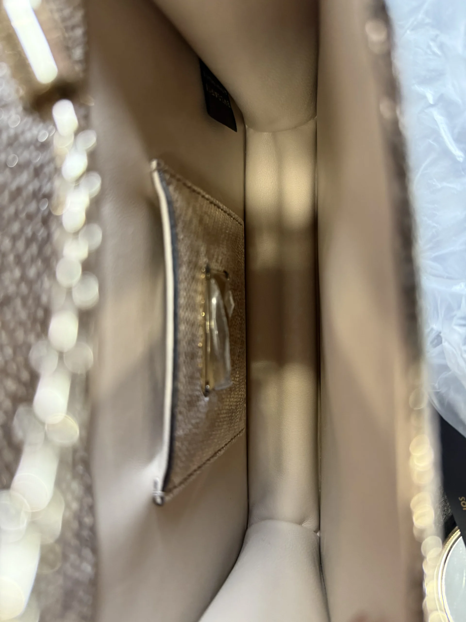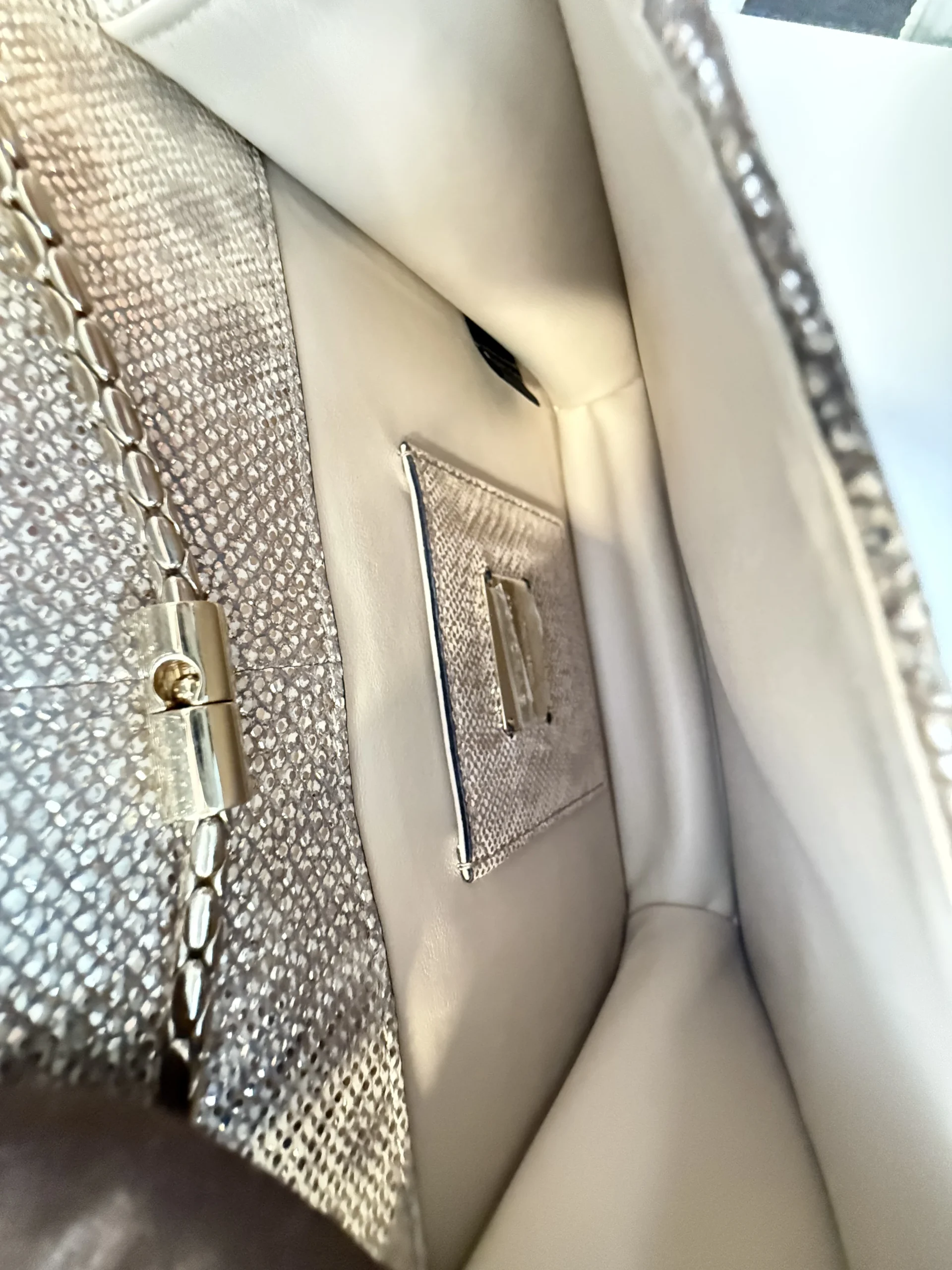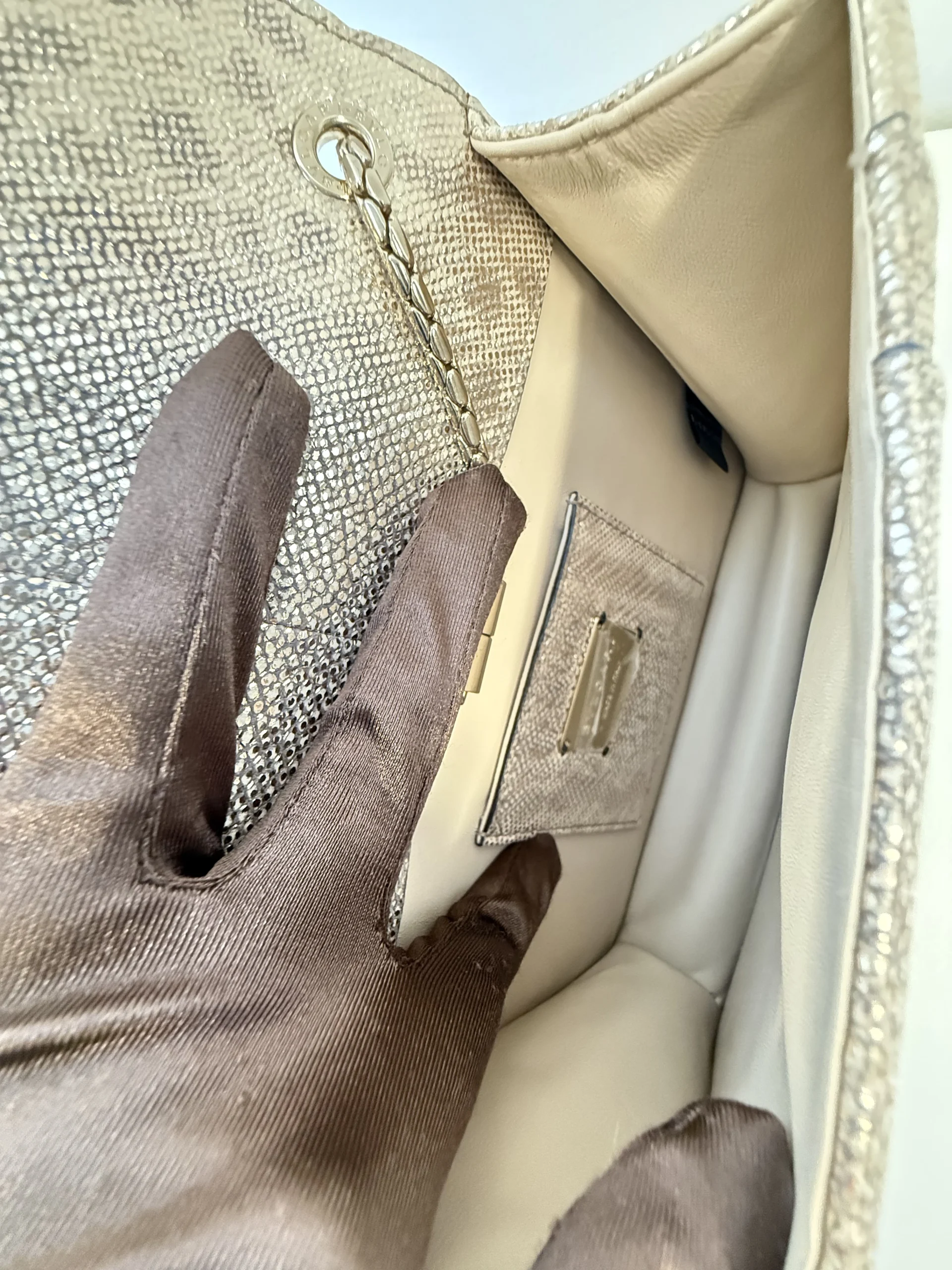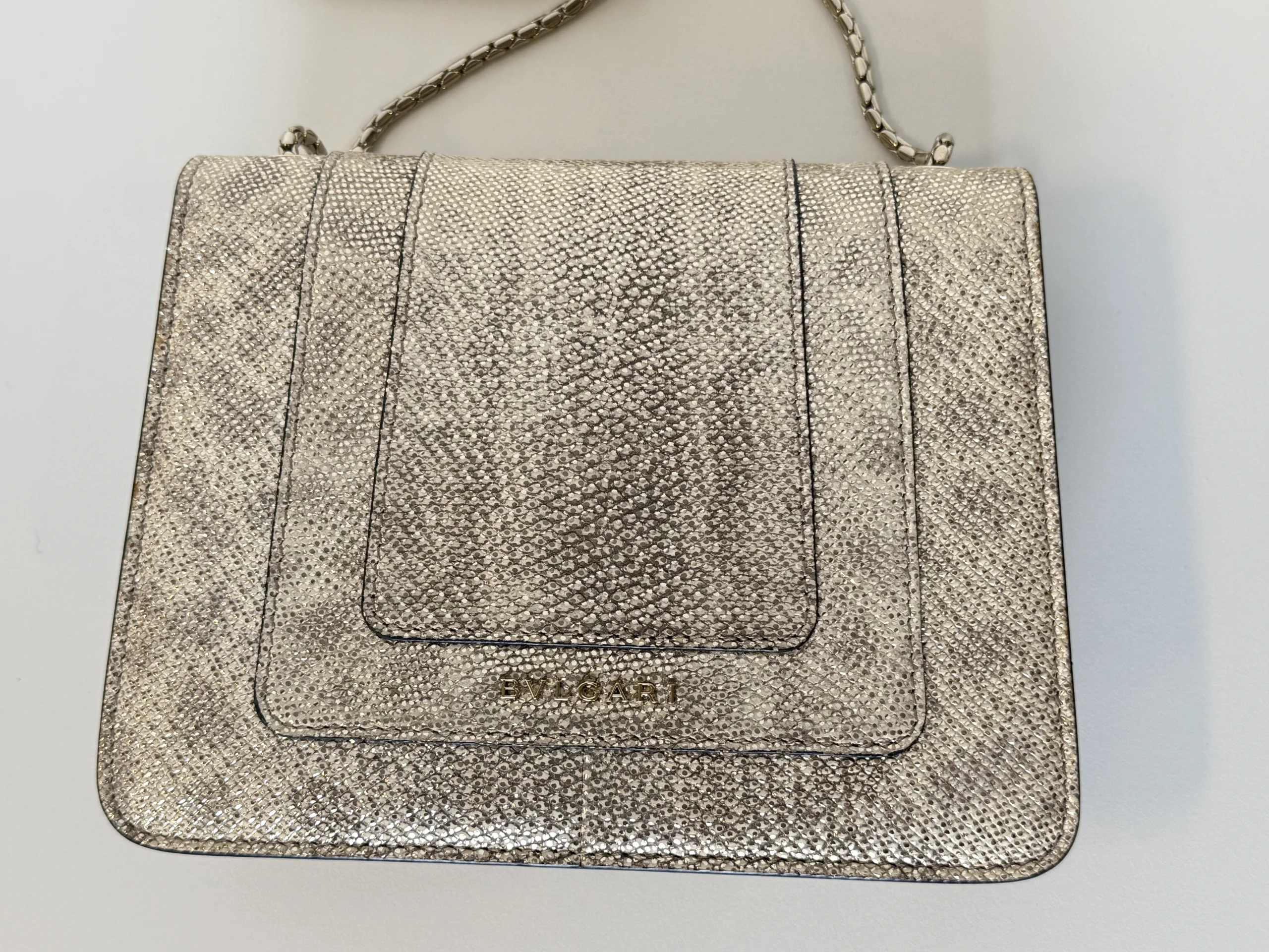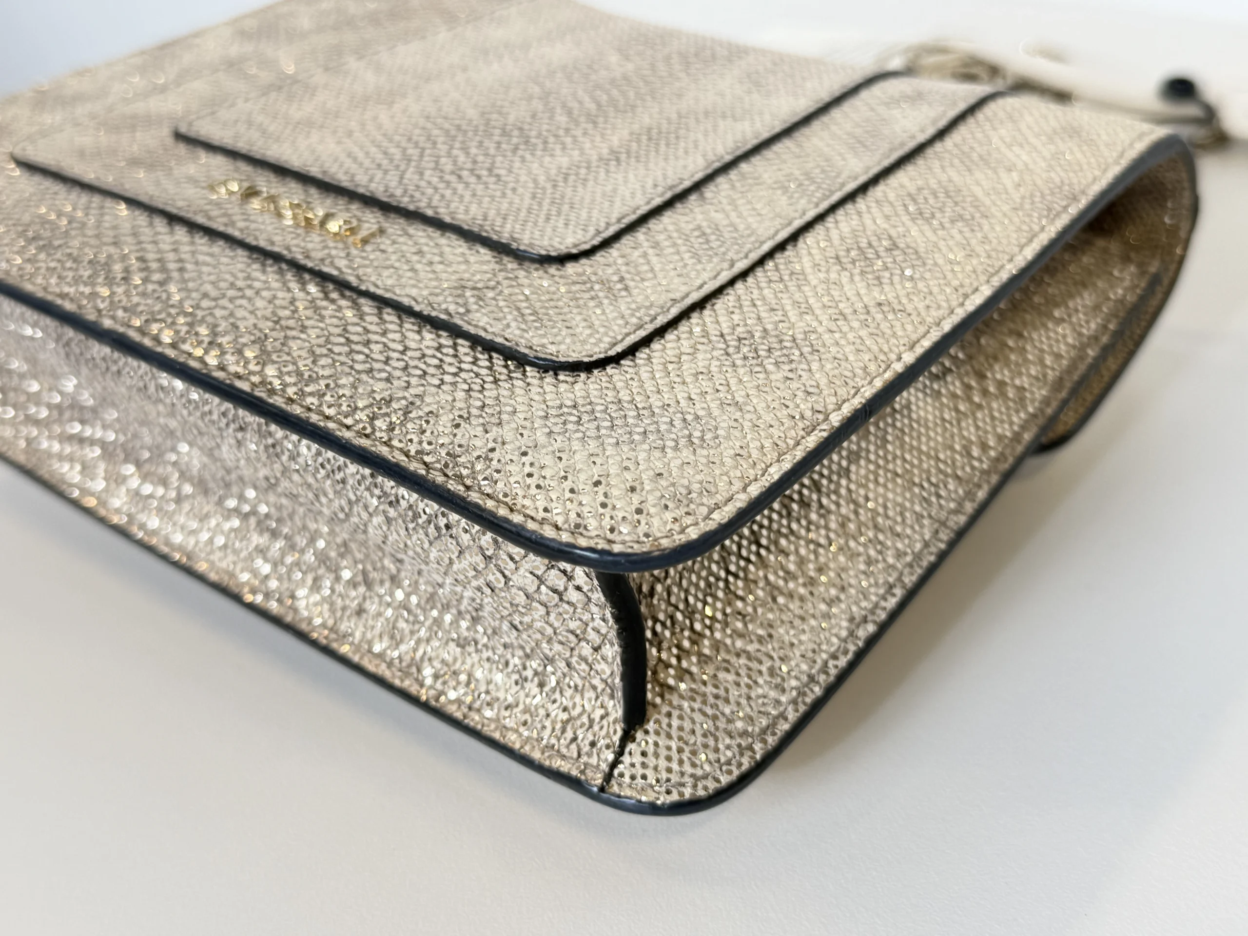 BVLGARI Serpenti Forever Shoulder Bag showcases the house’s iconic serpent motif in a refined and contemporary design.Crafted from shimmering light gold striated calf leather, the bag features a unique textured finish reminiscent of natural mineral inclusions. The signature snakehead magnetic closure is adorned with black zirconia pavé scales and black onyx eyes, delivering a bold yet elegant statement. Designed with a sliding chain strap, it can be worn both as a shoulder bag or crossbody. The interior is lined in soft nappa leather and includes practical compartments, making it ideal for both day and evening use.