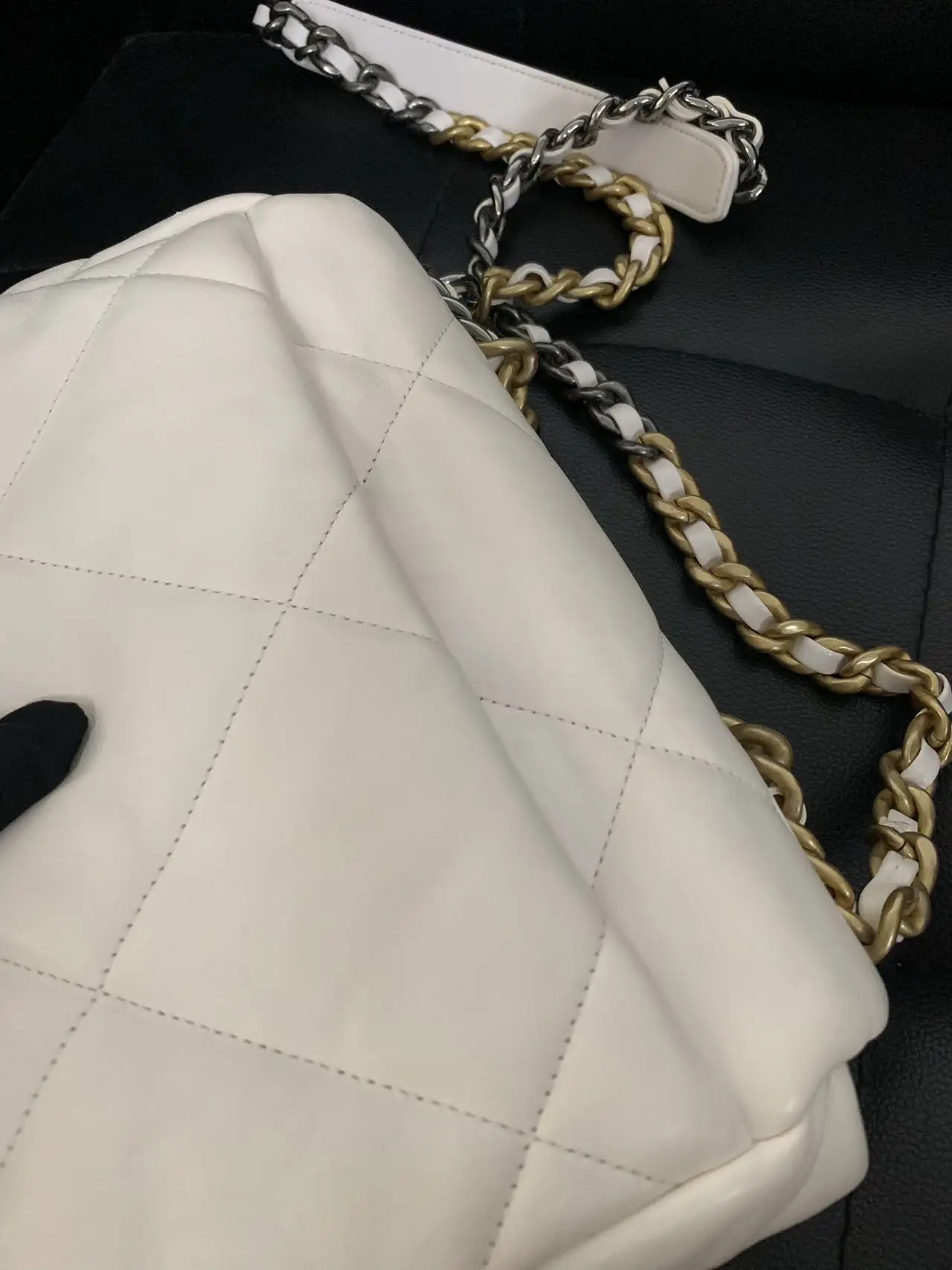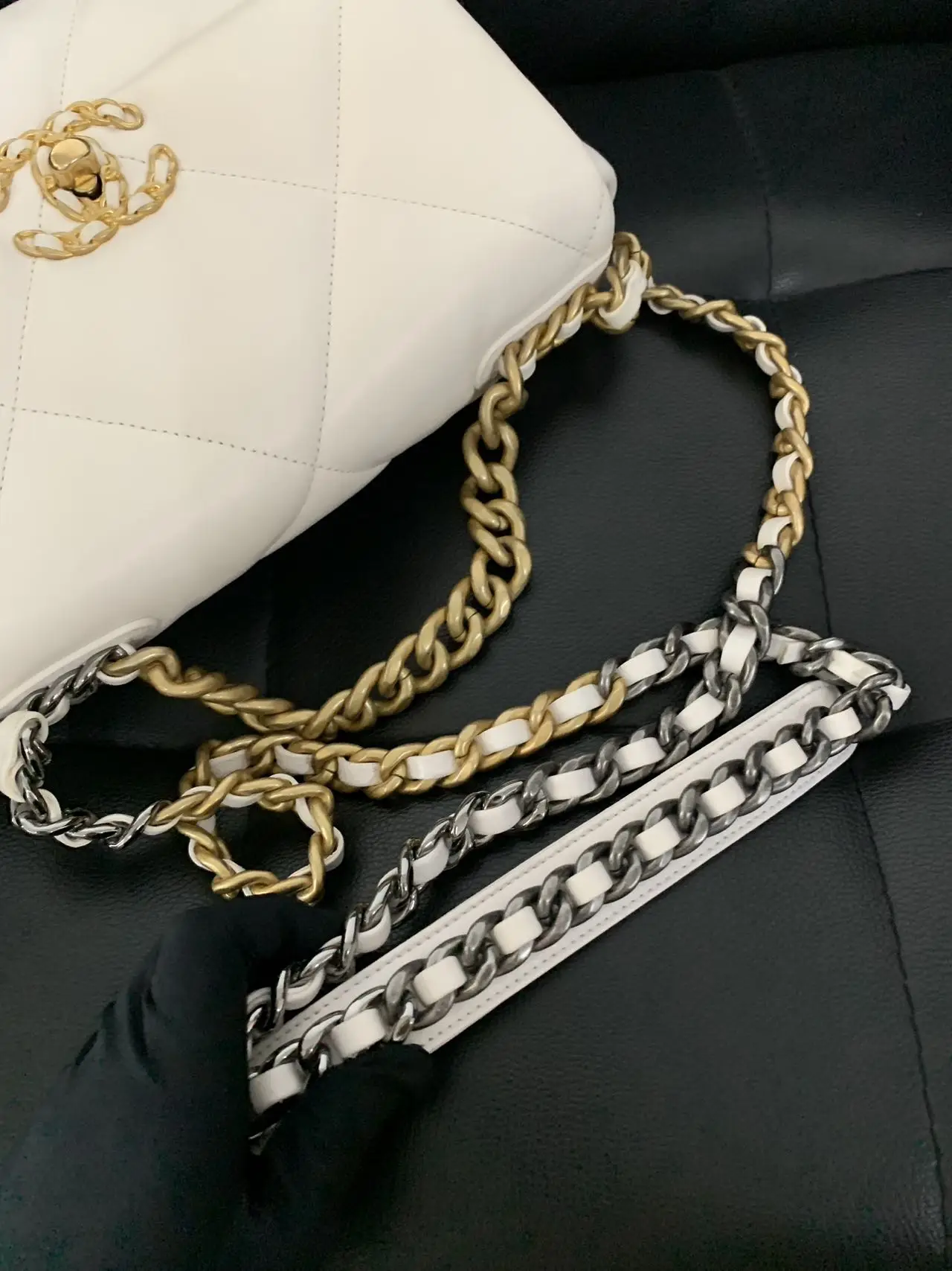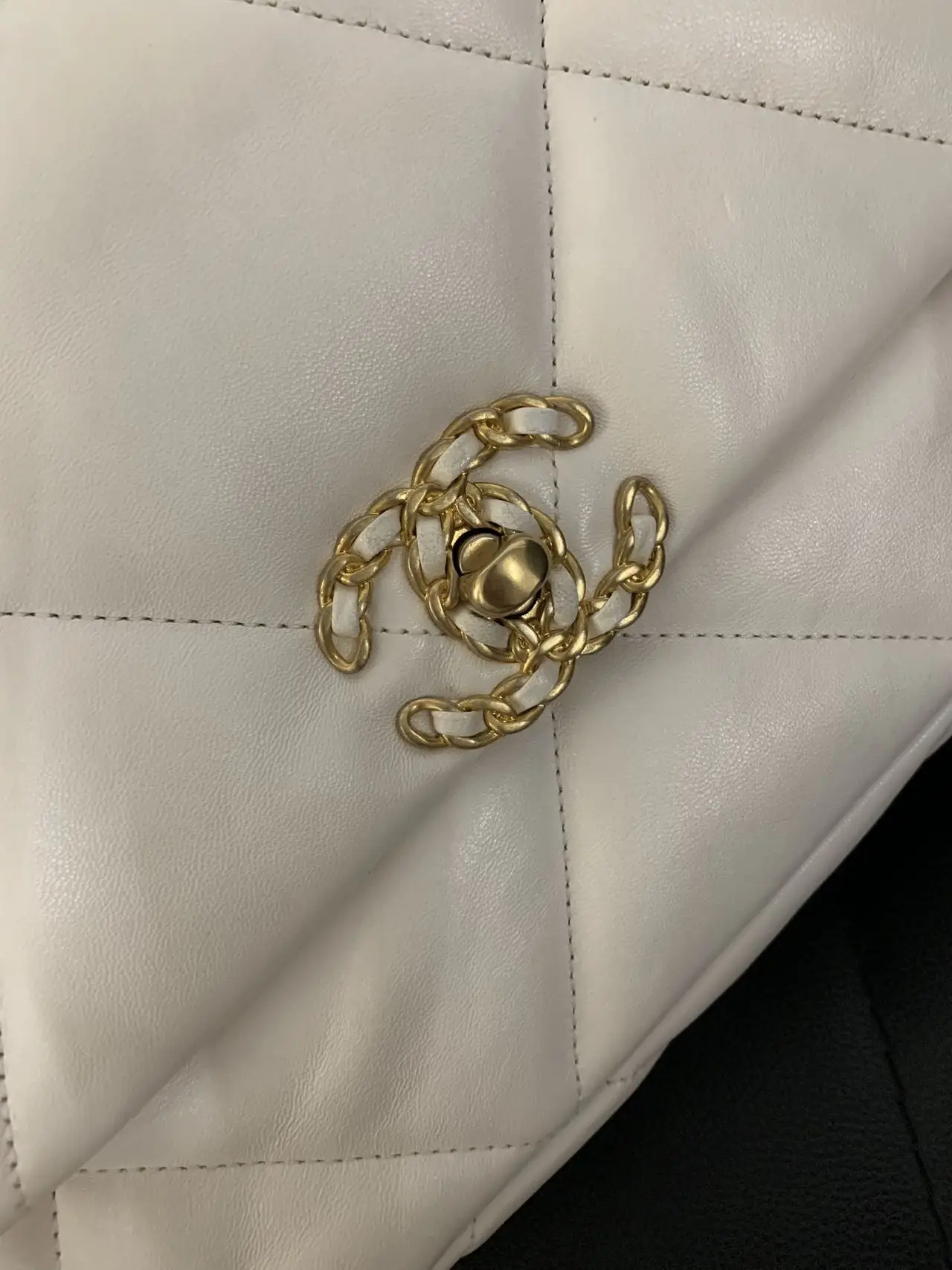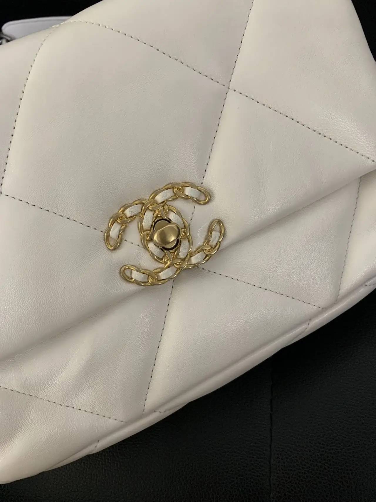 The CHANEL 19 Flap Bag in white is a modern icon, defined by its soft, slouchy silhouette, generous diamond quilting, and the distinctive interplay of its interwoven chain strap and bold CC clasp, offering a fresh take on relaxed luxury.