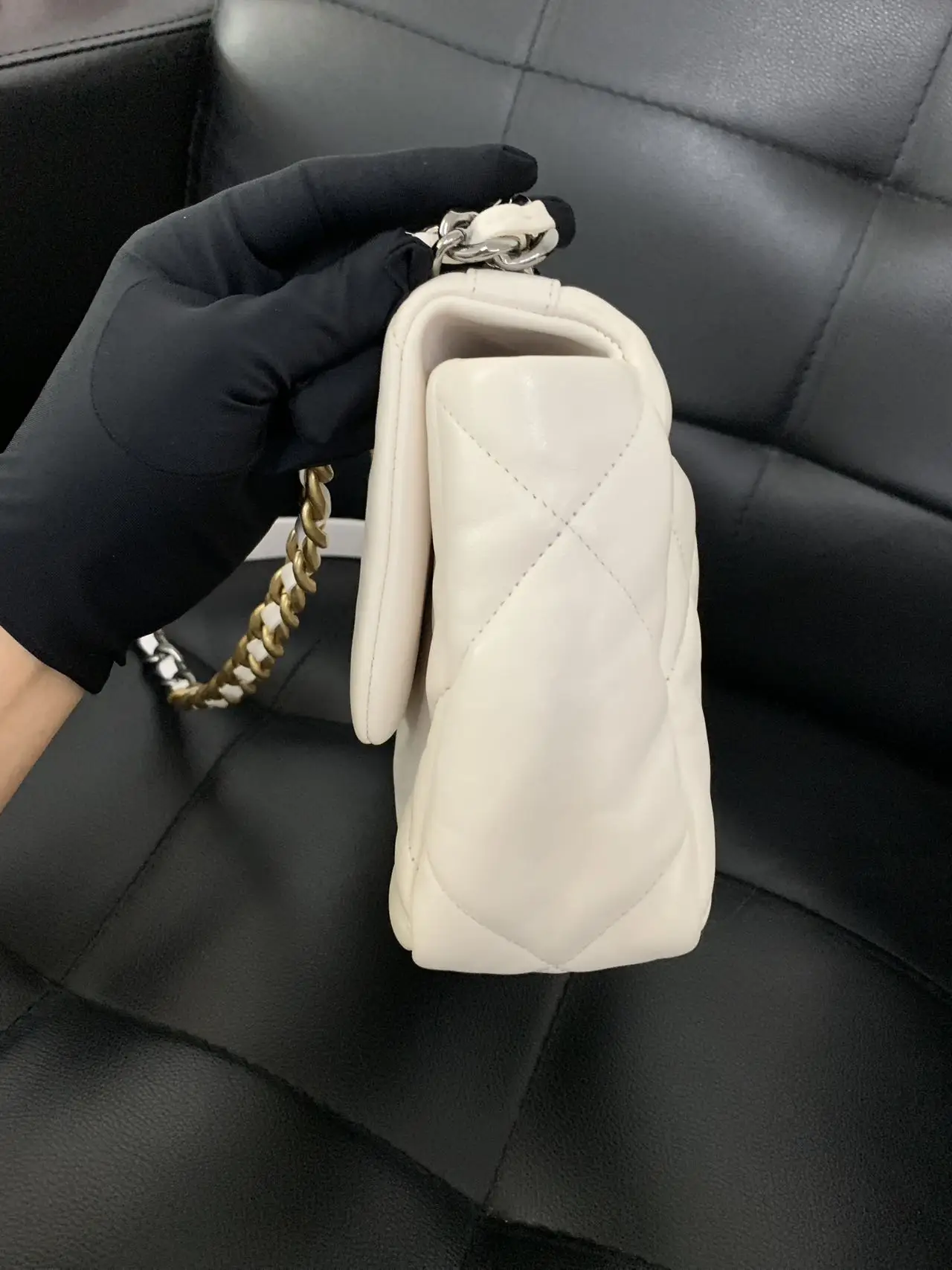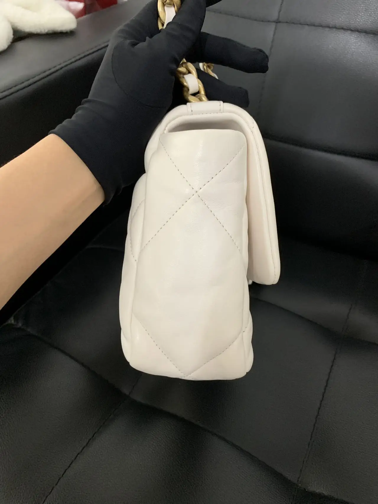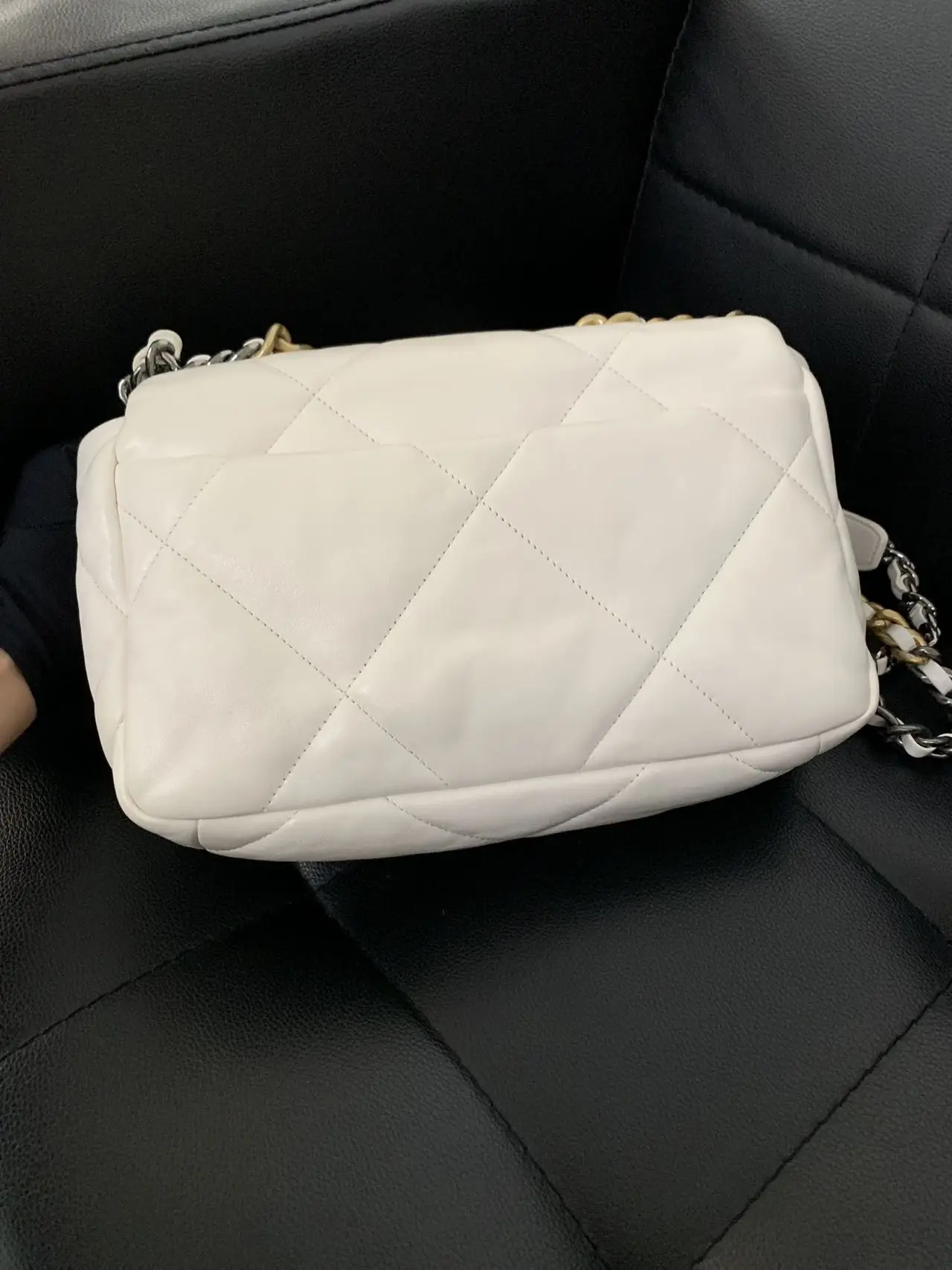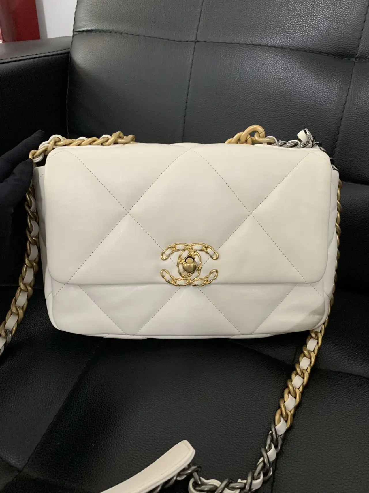 The CHANEL 19 Flap Bag in white is a modern icon, defined by its soft, slouchy silhouette, generous diamond quilting, and the distinctive interplay of its interwoven chain strap and bold CC clasp, offering a fresh take on relaxed luxury.