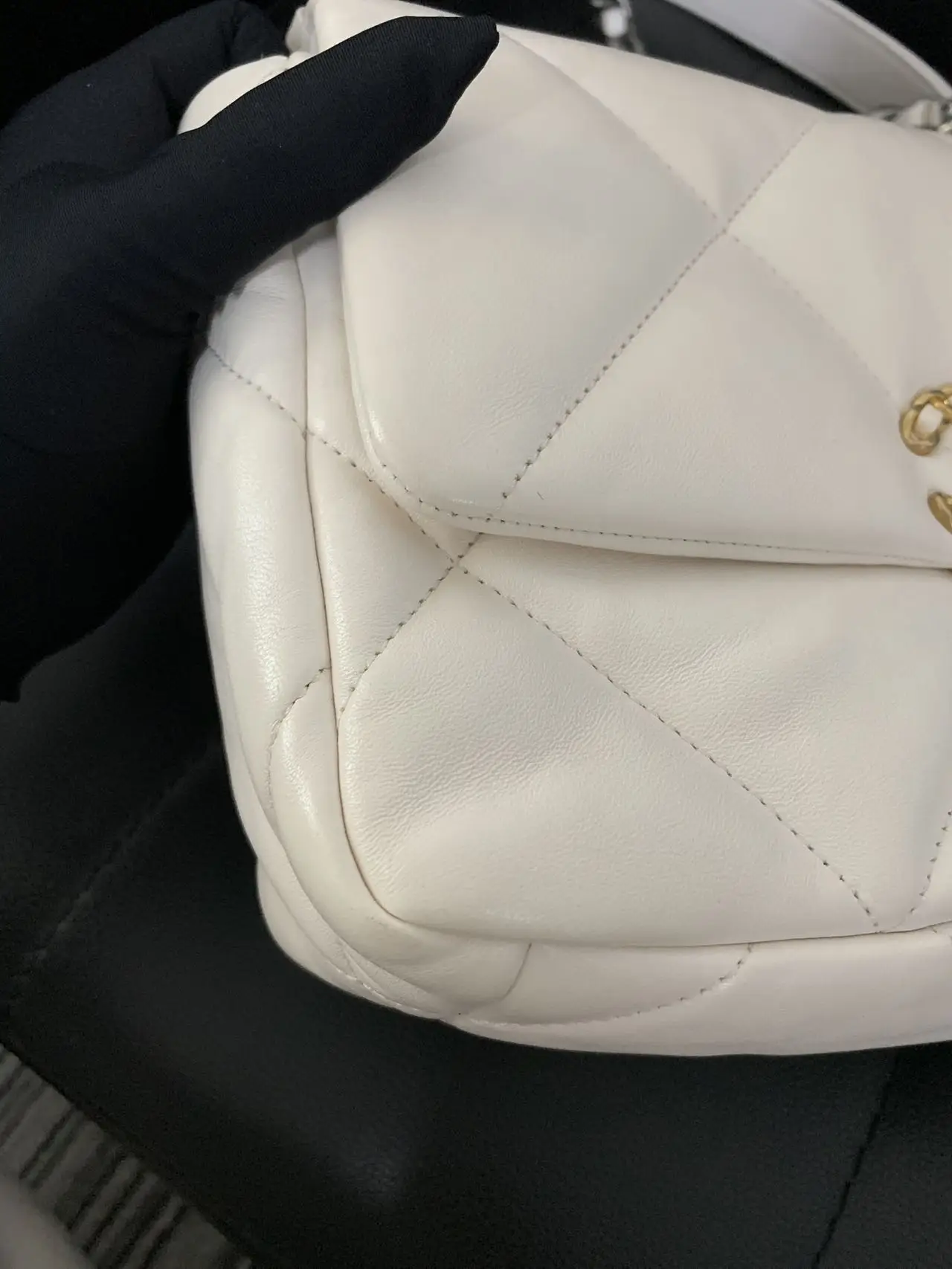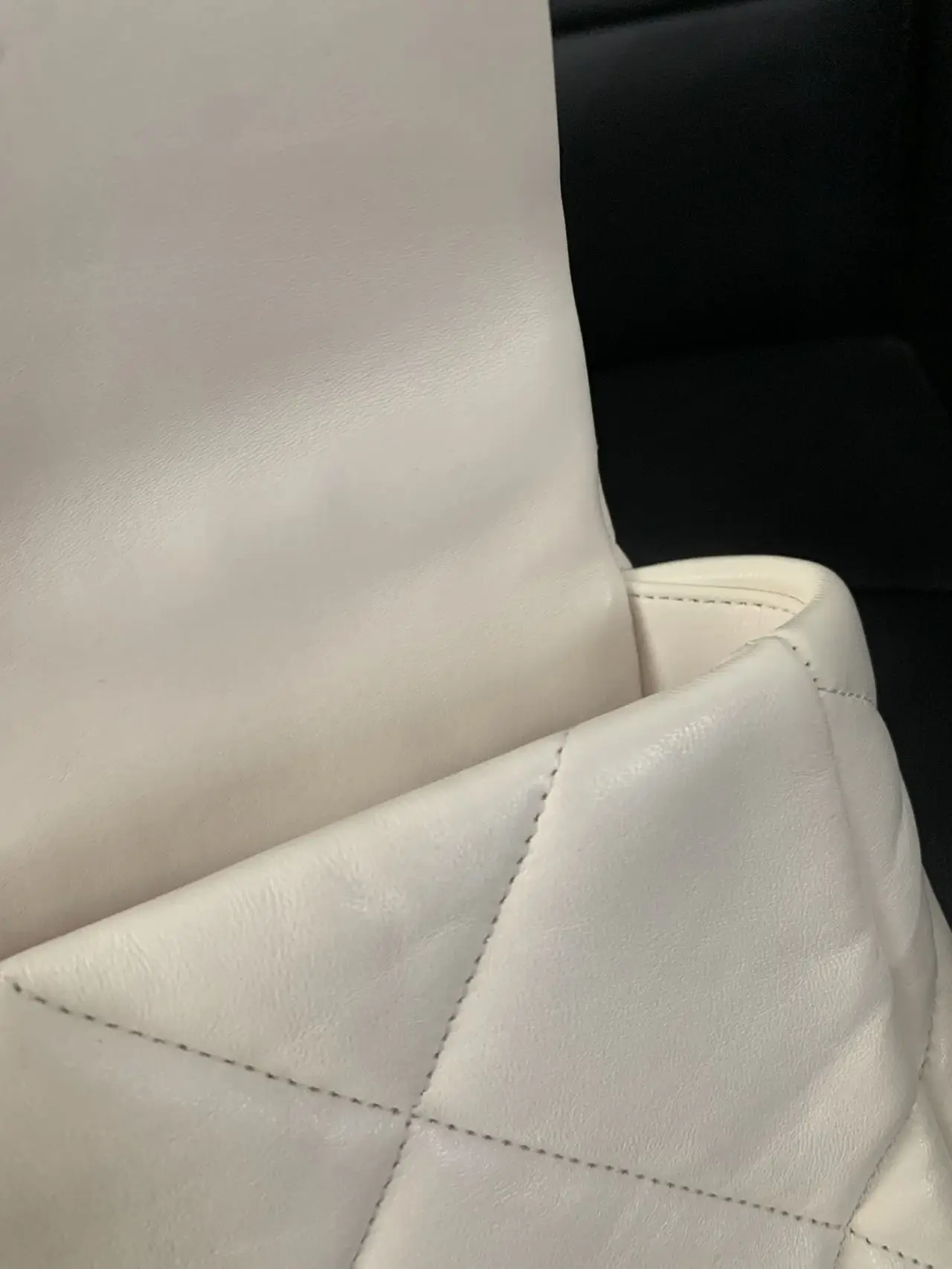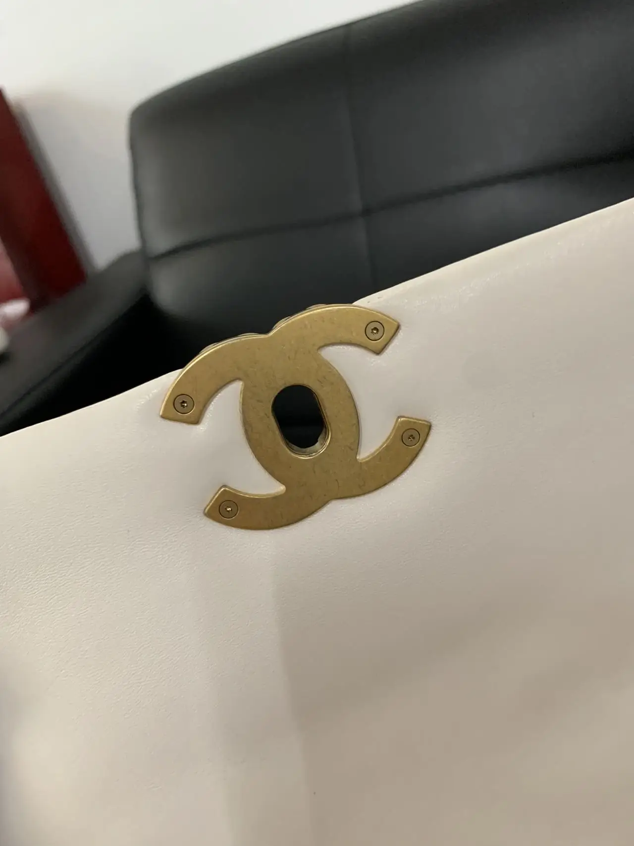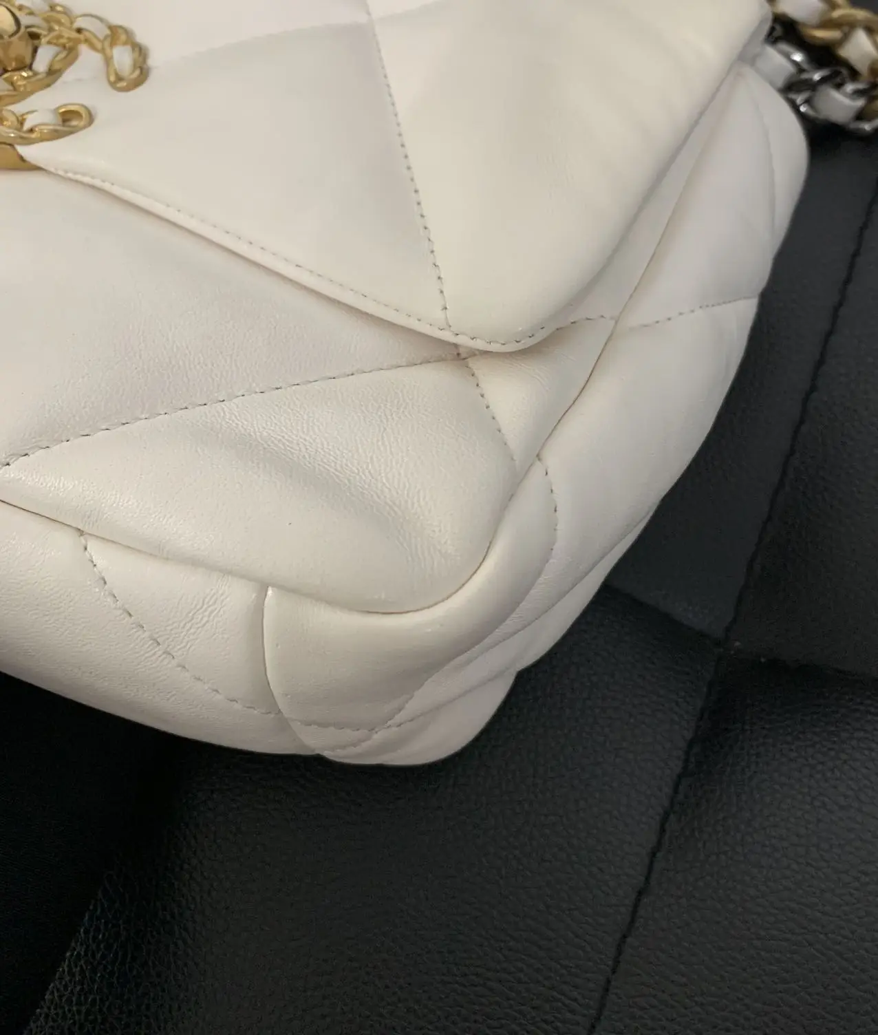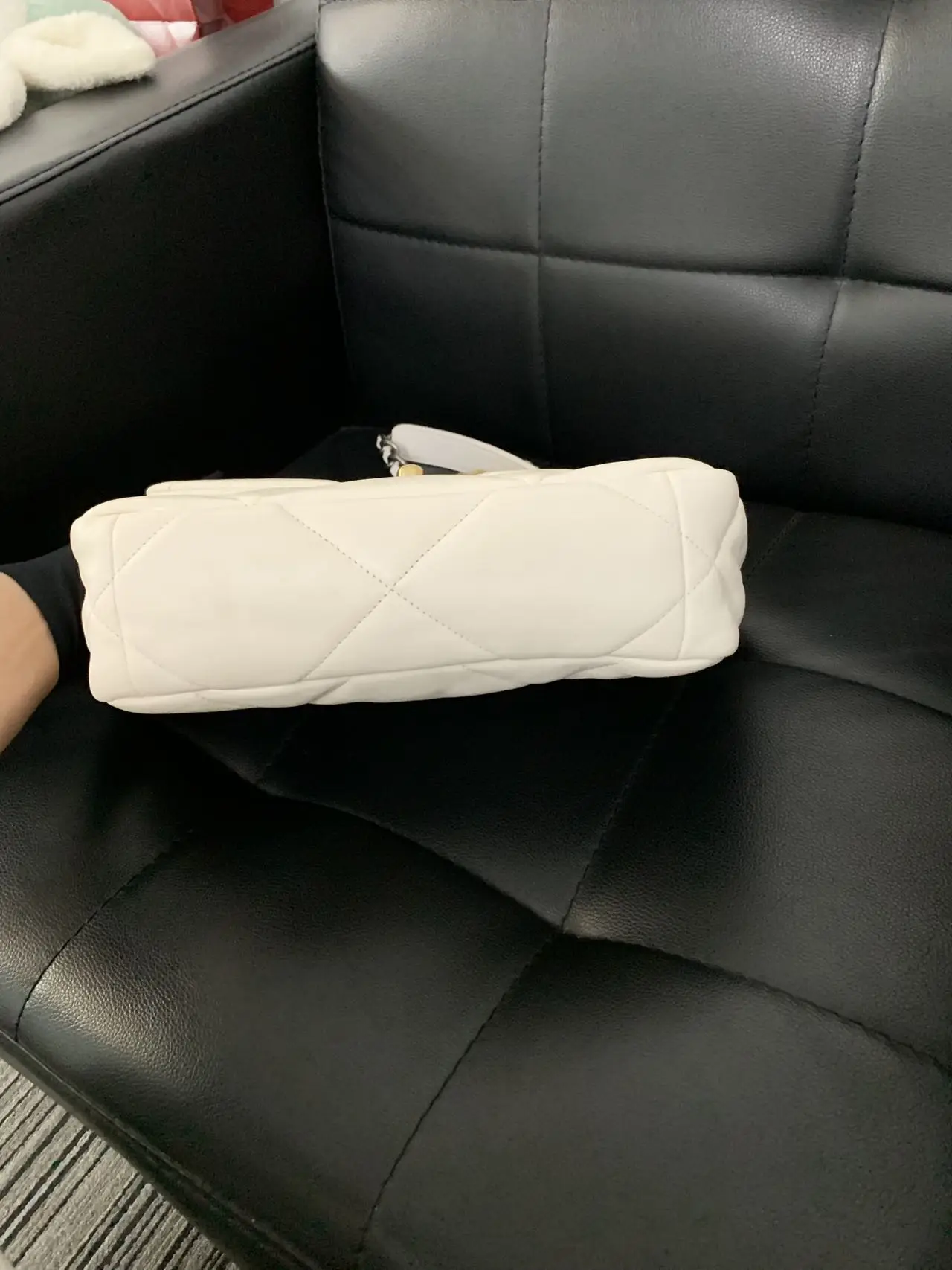 The CHANEL 19 Flap Bag in white is a modern icon, defined by its soft, slouchy silhouette, generous diamond quilting, and the distinctive interplay of its interwoven chain strap and bold CC clasp, offering a fresh take on relaxed luxury.