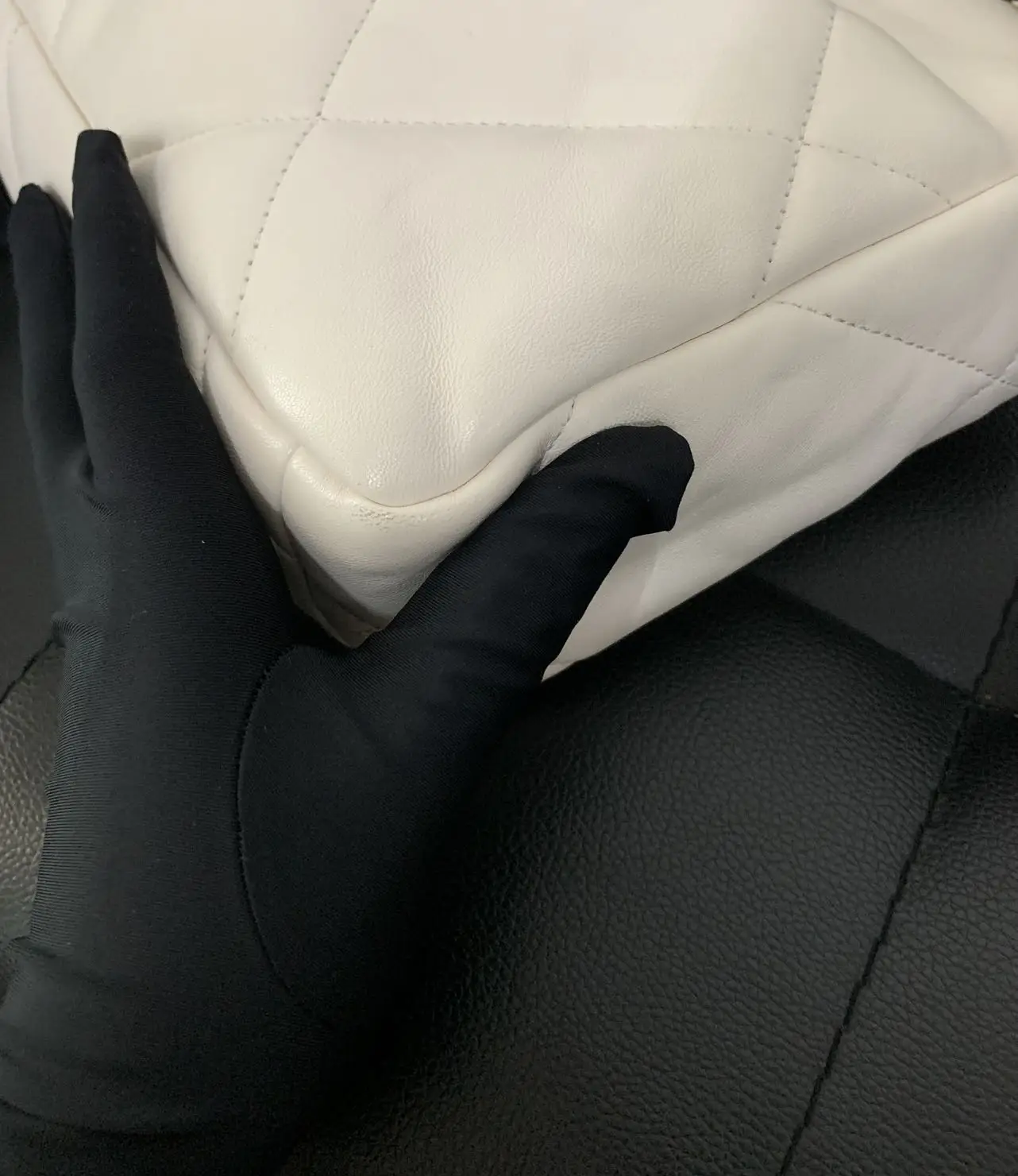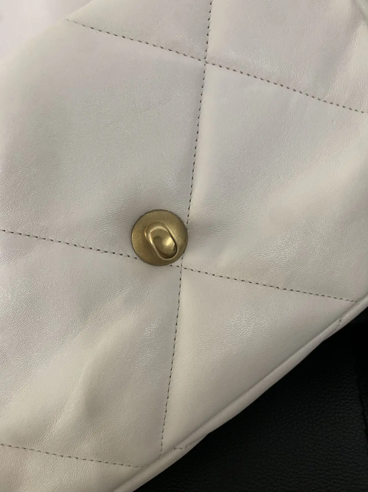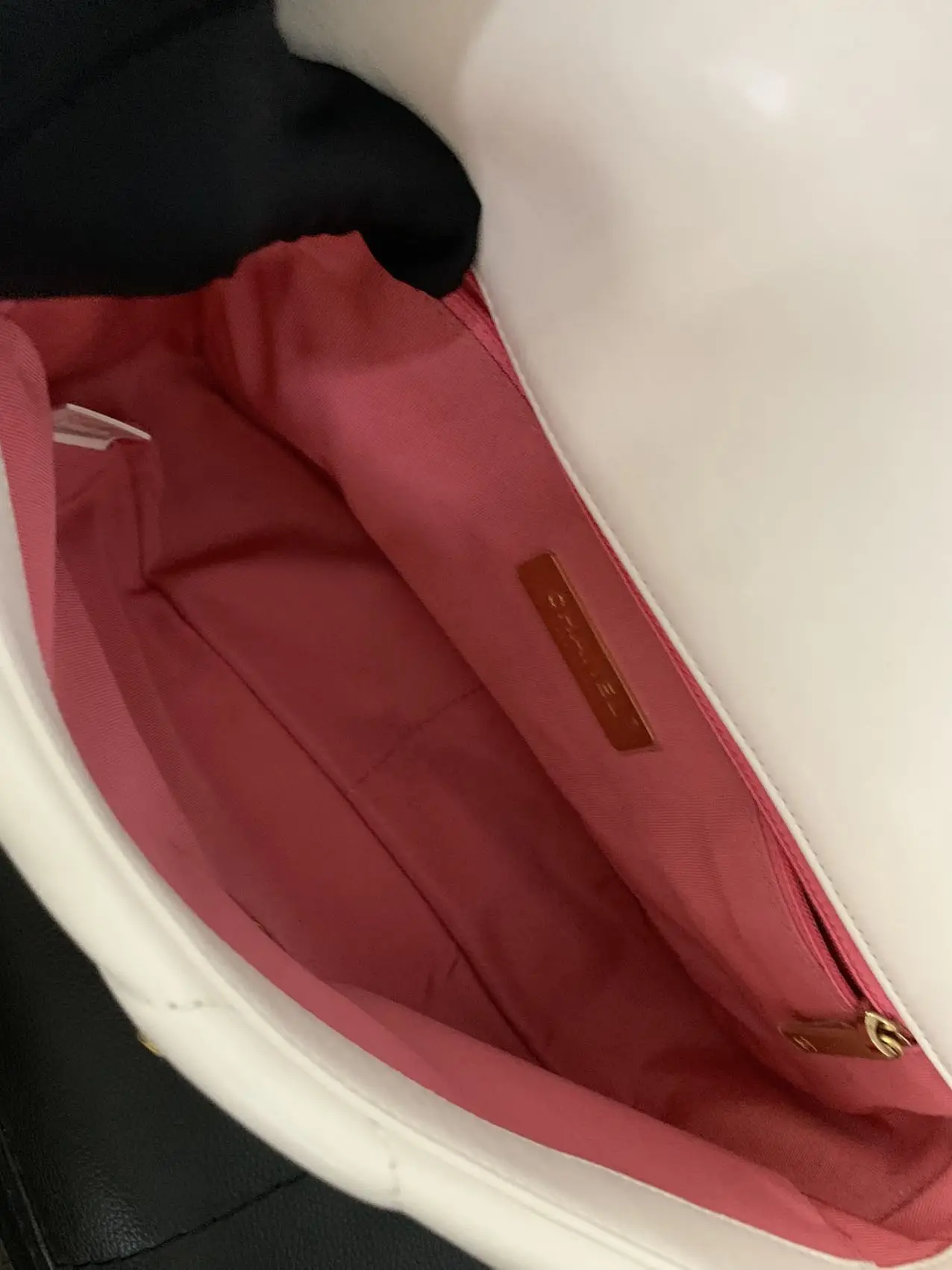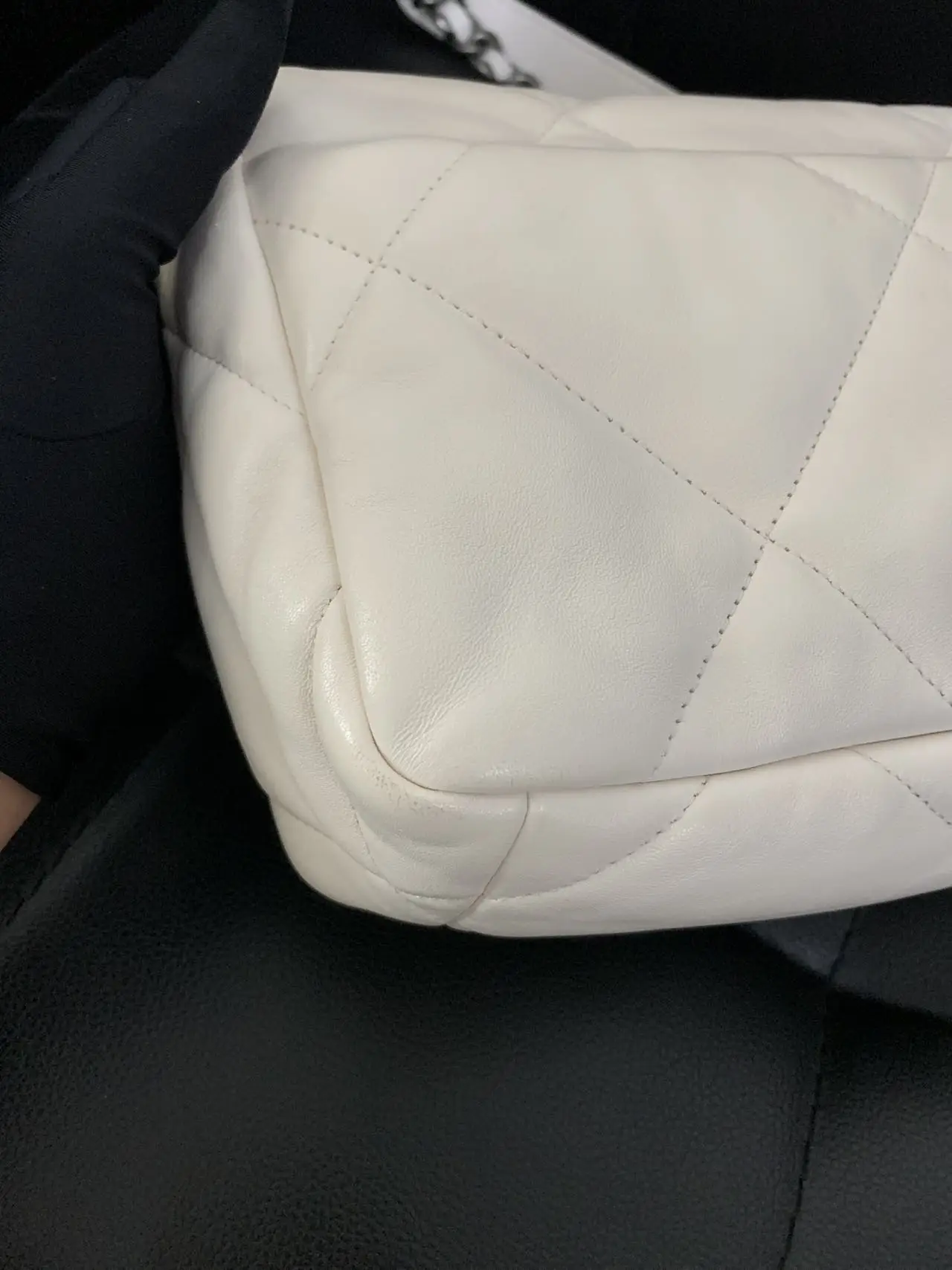 The CHANEL 19 Flap Bag in white is a modern icon, defined by its soft, slouchy silhouette, generous diamond quilting, and the distinctive interplay of its interwoven chain strap and bold CC clasp, offering a fresh take on relaxed luxury.