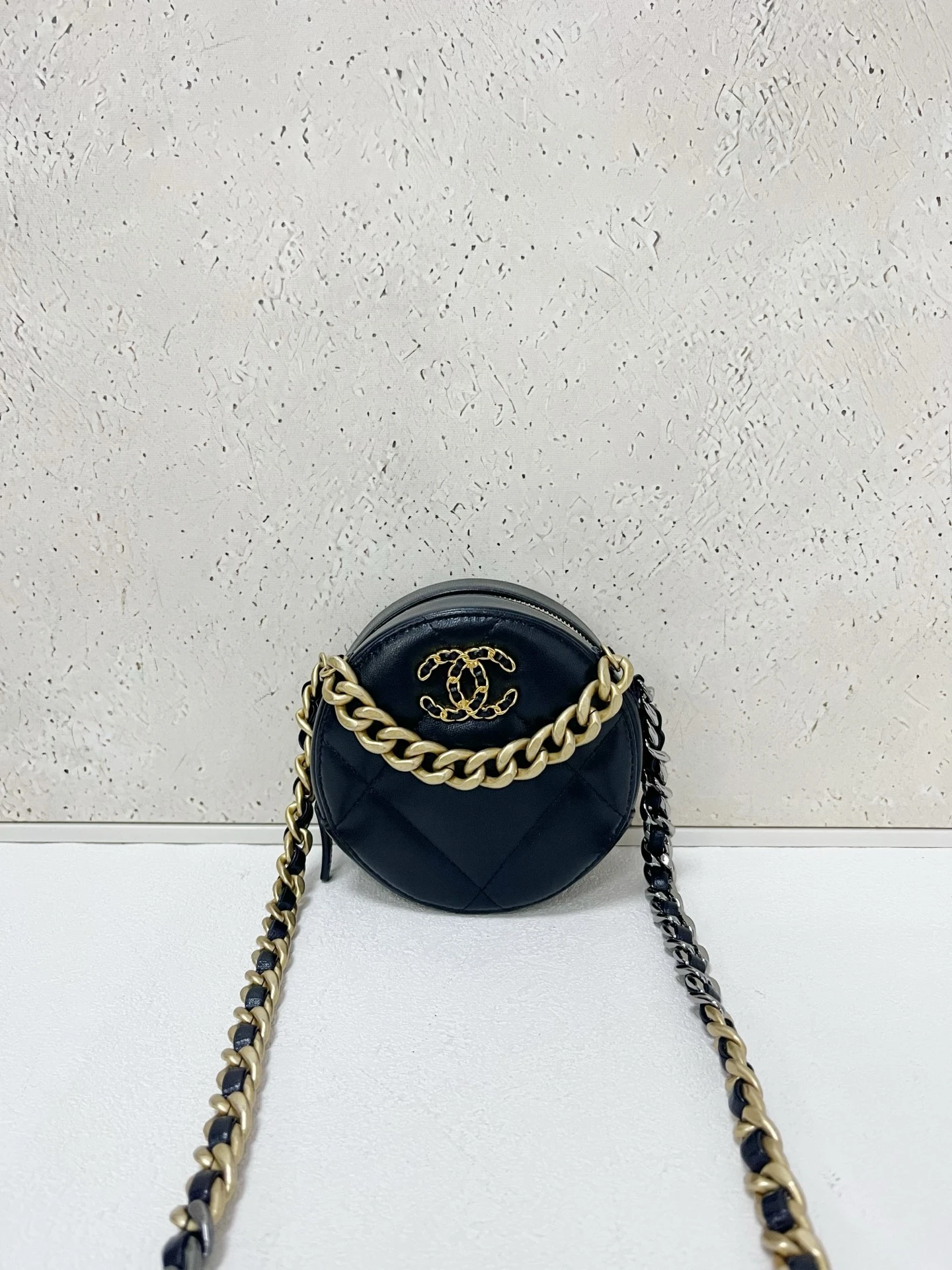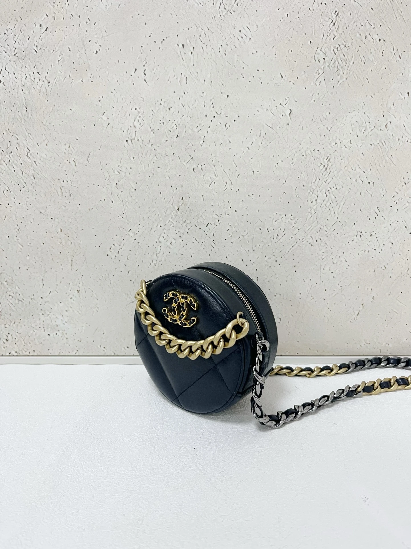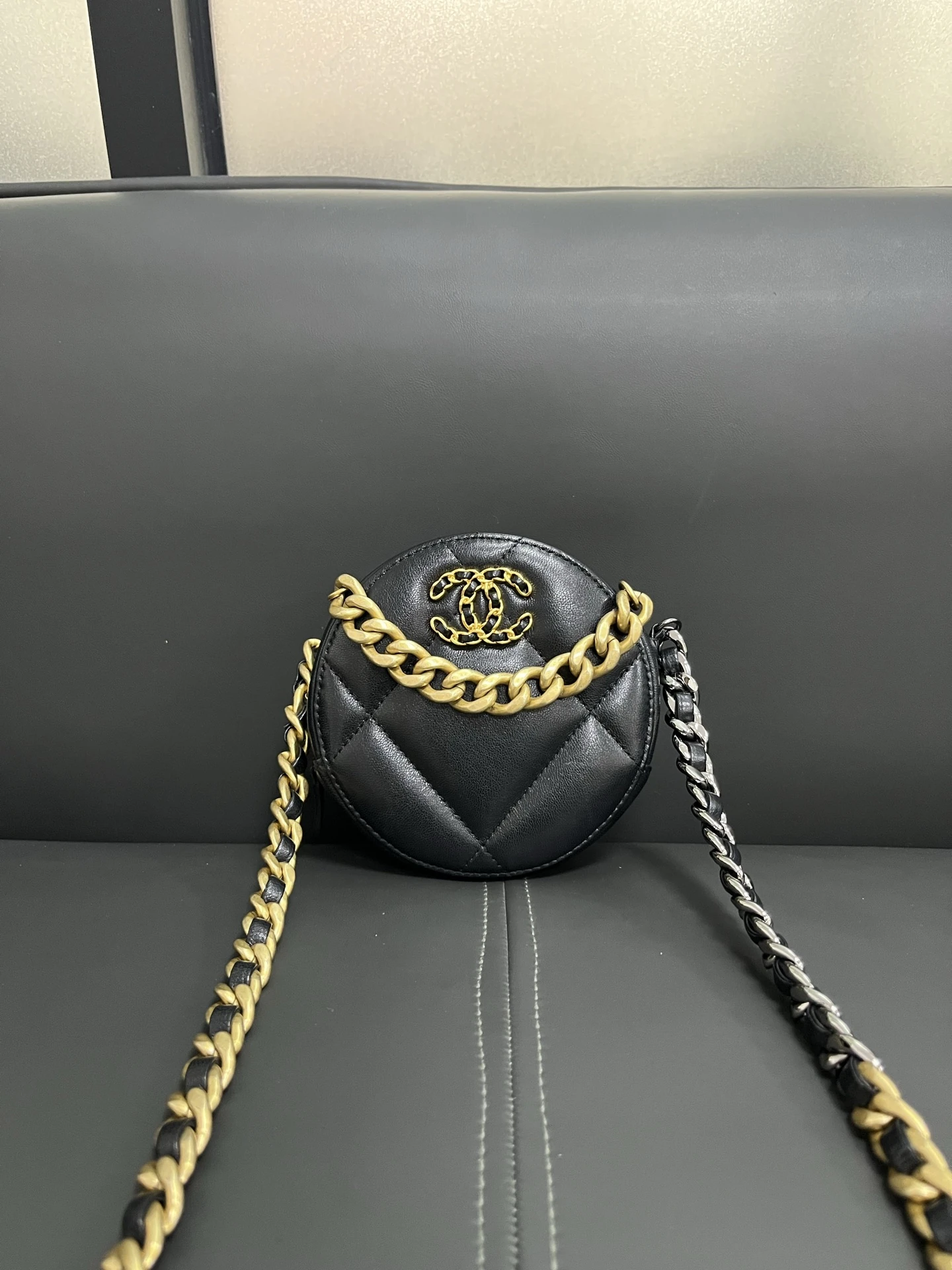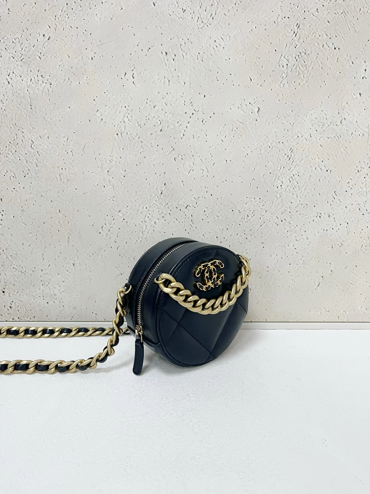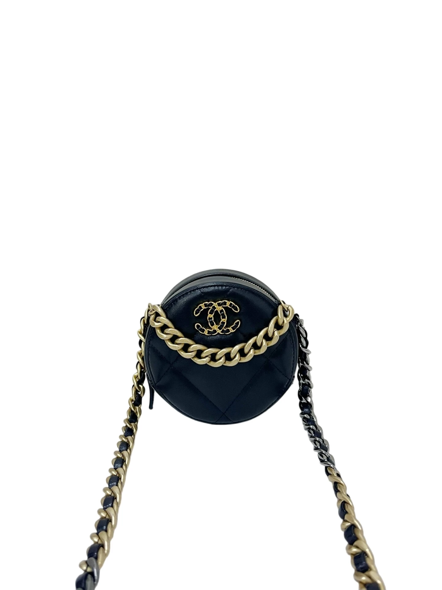 CHANEL 19 Round Bag Black Lambskin Light Gold Hardware is crafted from soft quilted lambskin in a unique round silhouette with signature chunky chain detailing. Compact and stylish, this piece is perfect for everyday wear.
