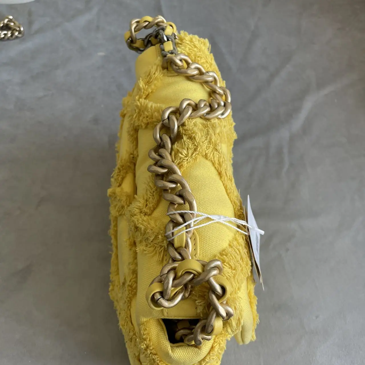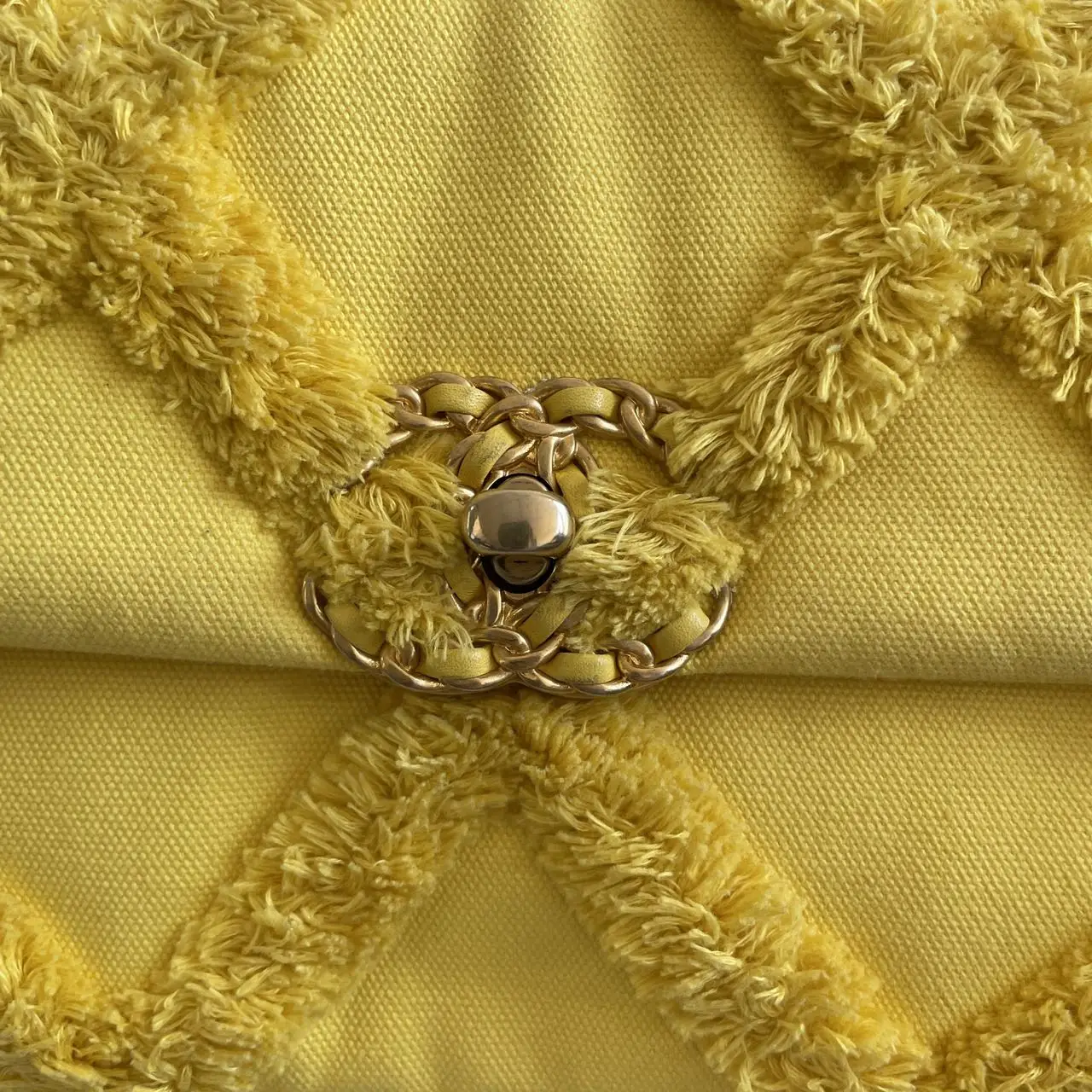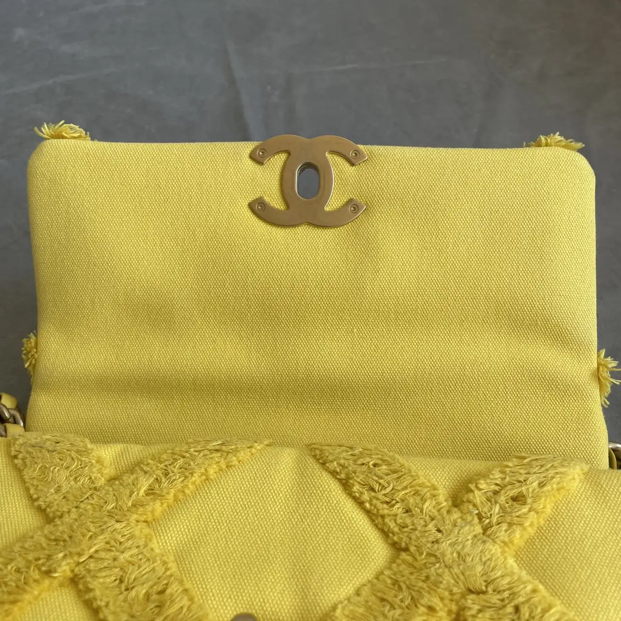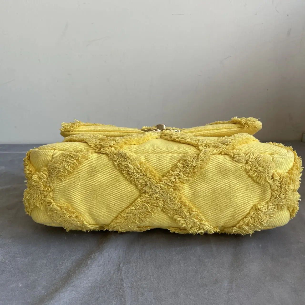 The Chanel 19 Small Bag in yellow quilted denim with fringe and gold-tone hardware is a vibrant and bohemian statement piece, where the iconic slouchy silhouette is reimagined with playful texture and movement, blending casual cool with luxurious detail.