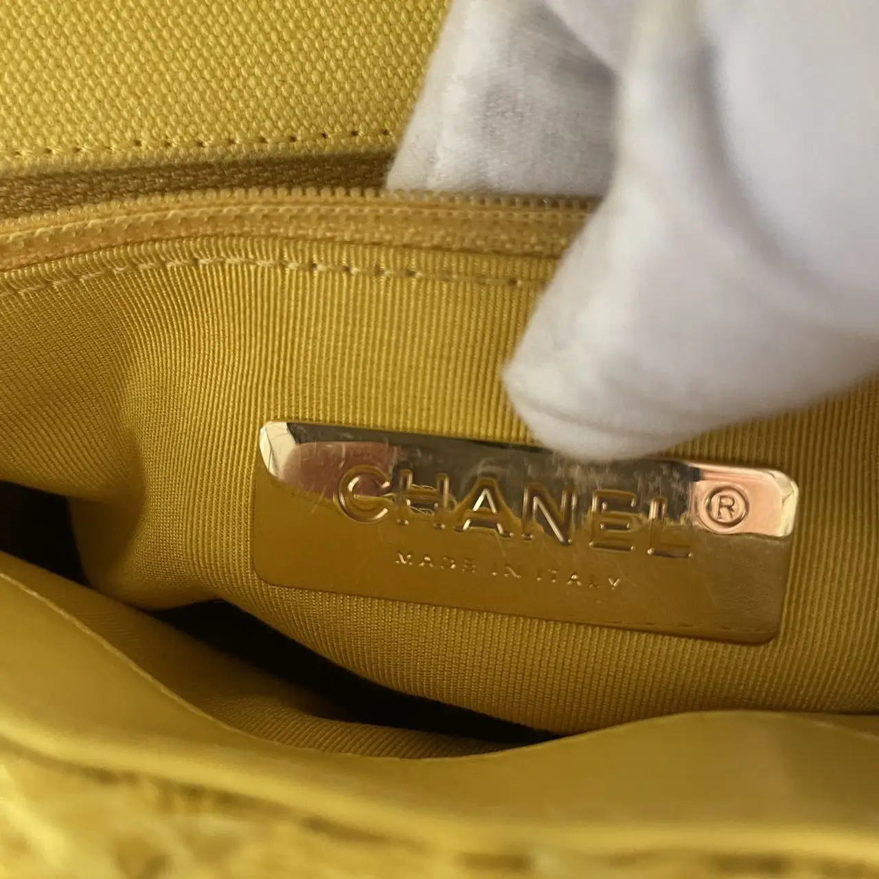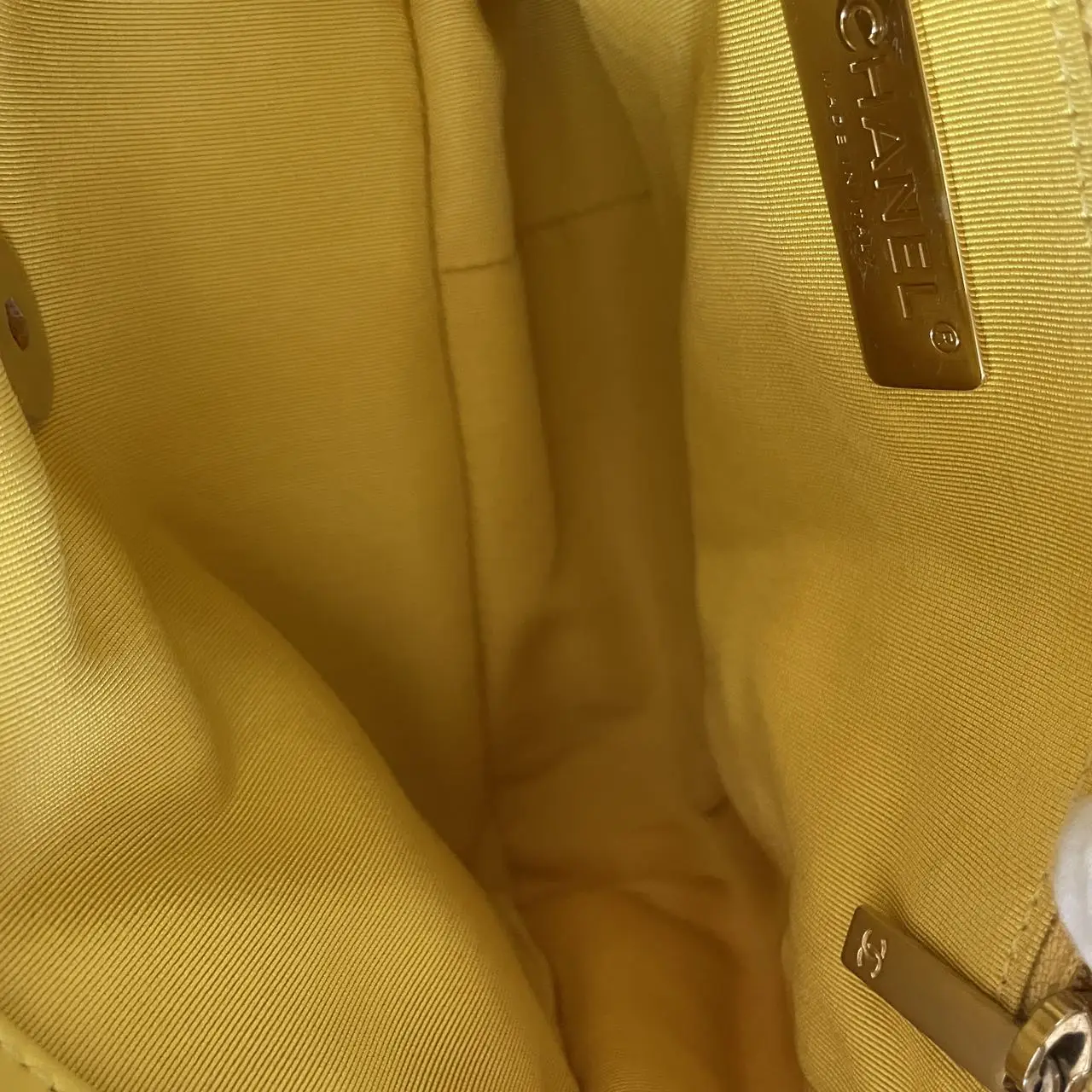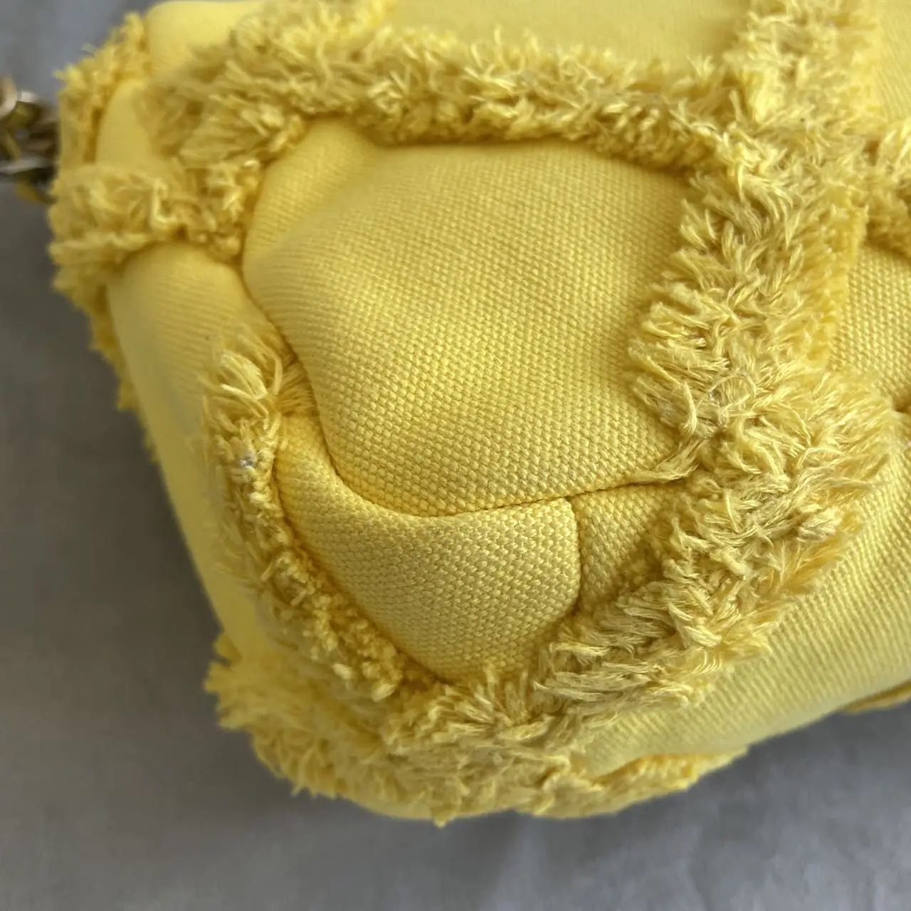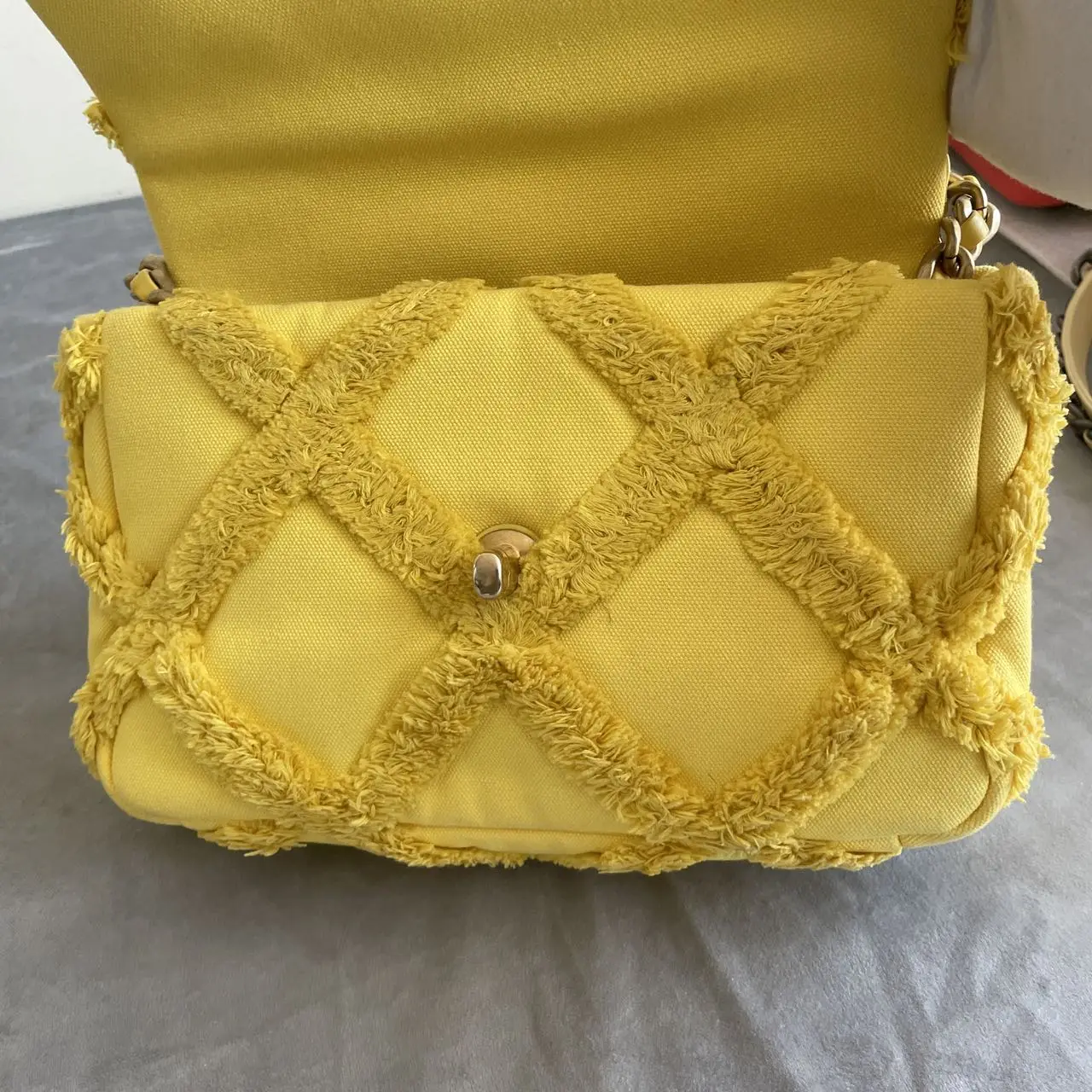 The Chanel 19 Small Bag in yellow quilted denim with fringe and gold-tone hardware is a vibrant and bohemian statement piece, where the iconic slouchy silhouette is reimagined with playful texture and movement, blending casual cool with luxurious detail.