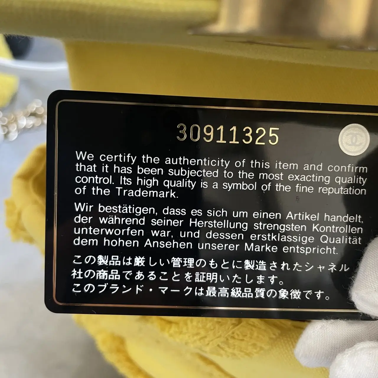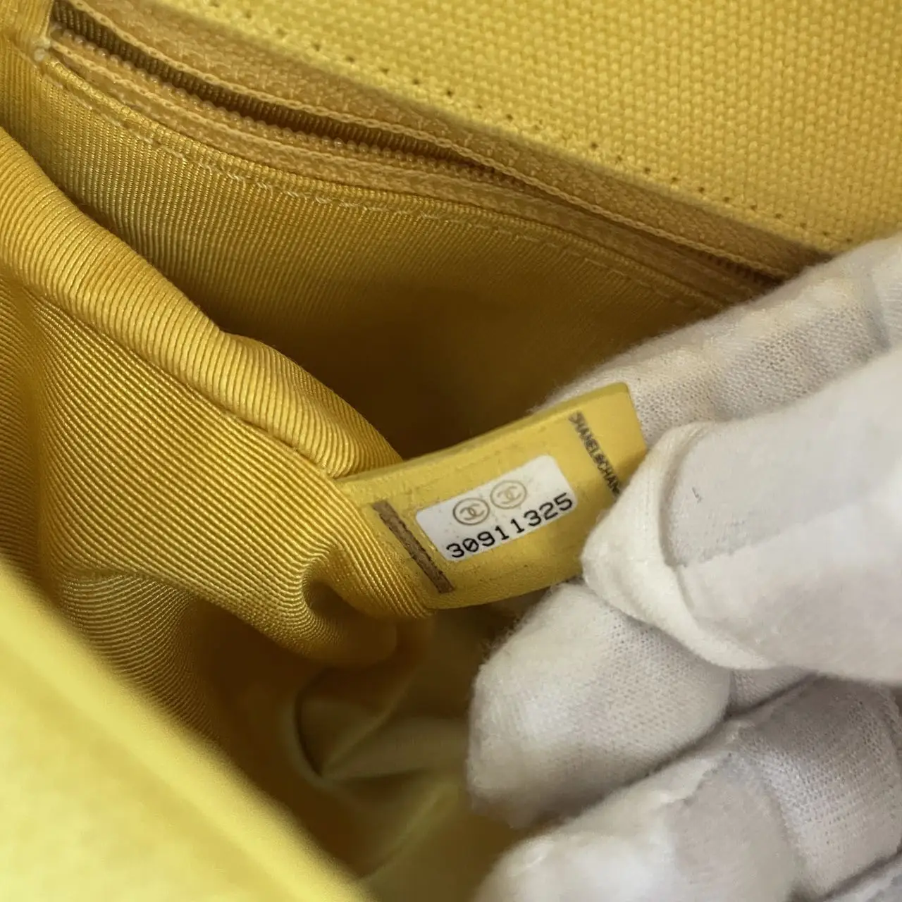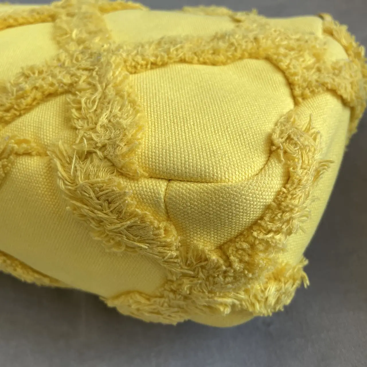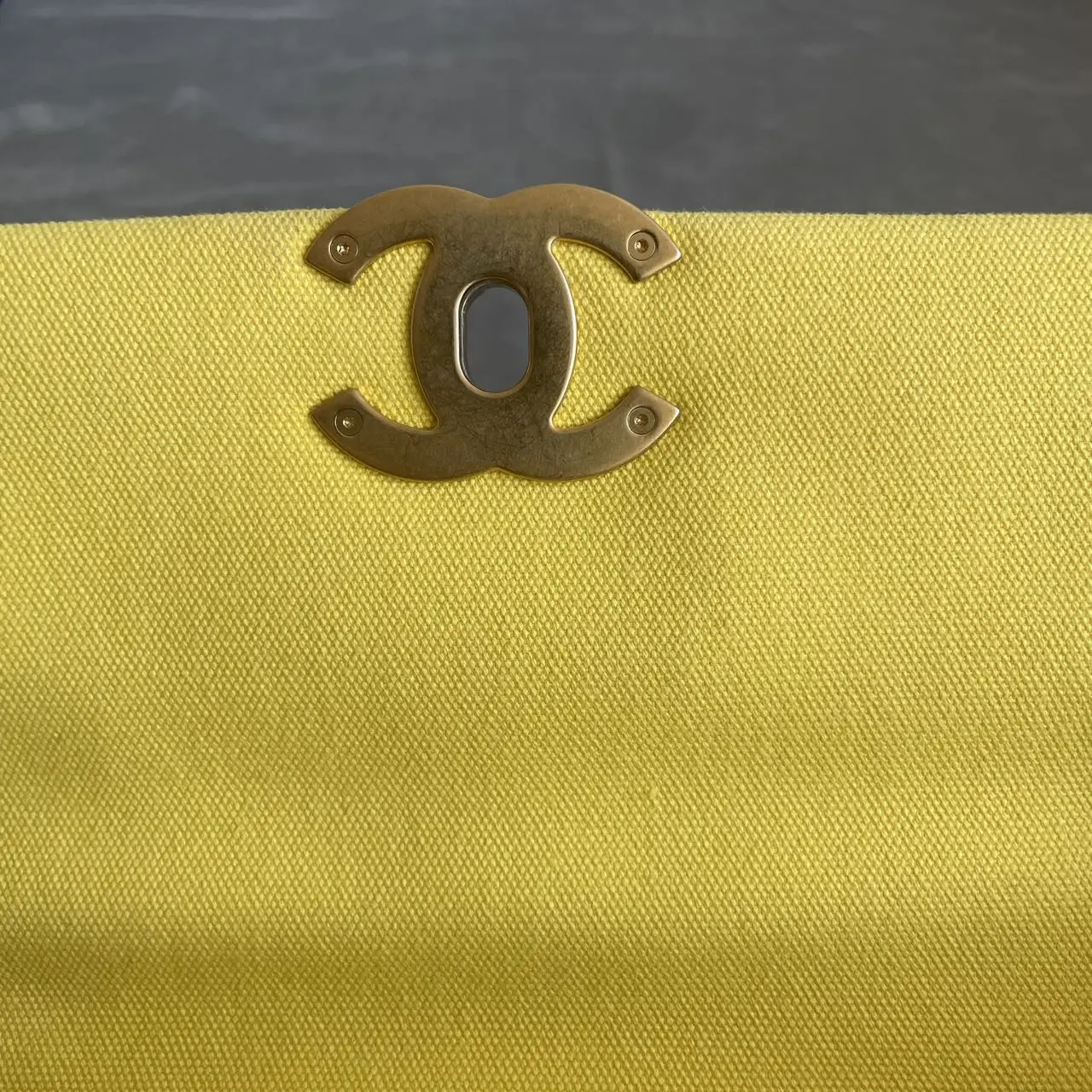 The Chanel 19 Small Bag in yellow quilted denim with fringe and gold-tone hardware is a vibrant and bohemian statement piece, where the iconic slouchy silhouette is reimagined with playful texture and movement, blending casual cool with luxurious detail.