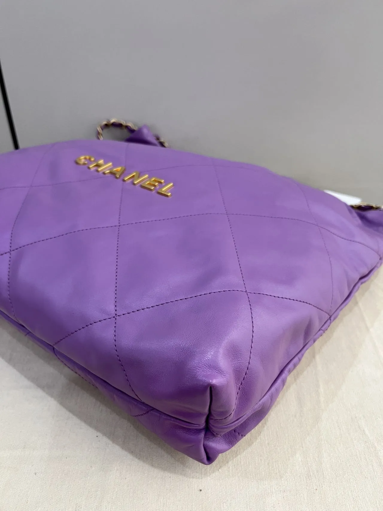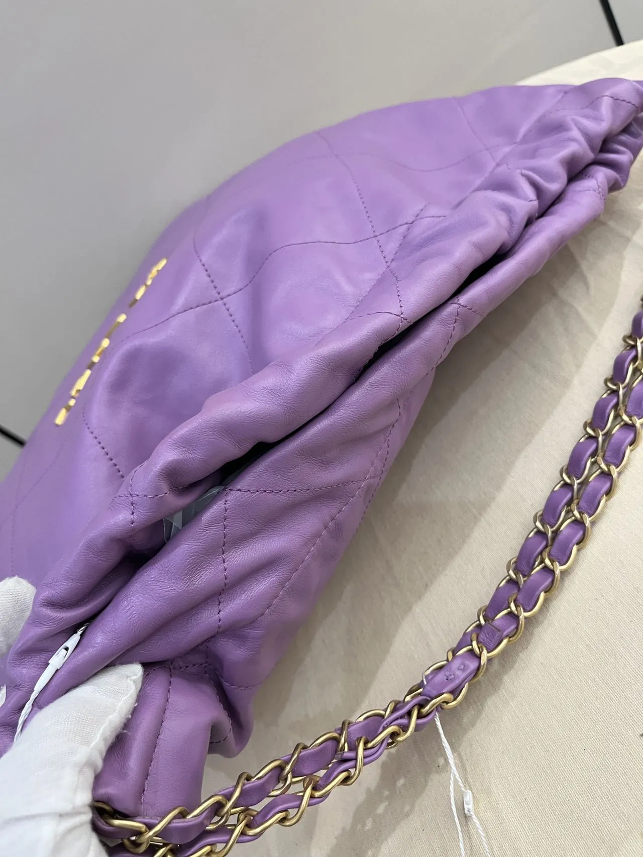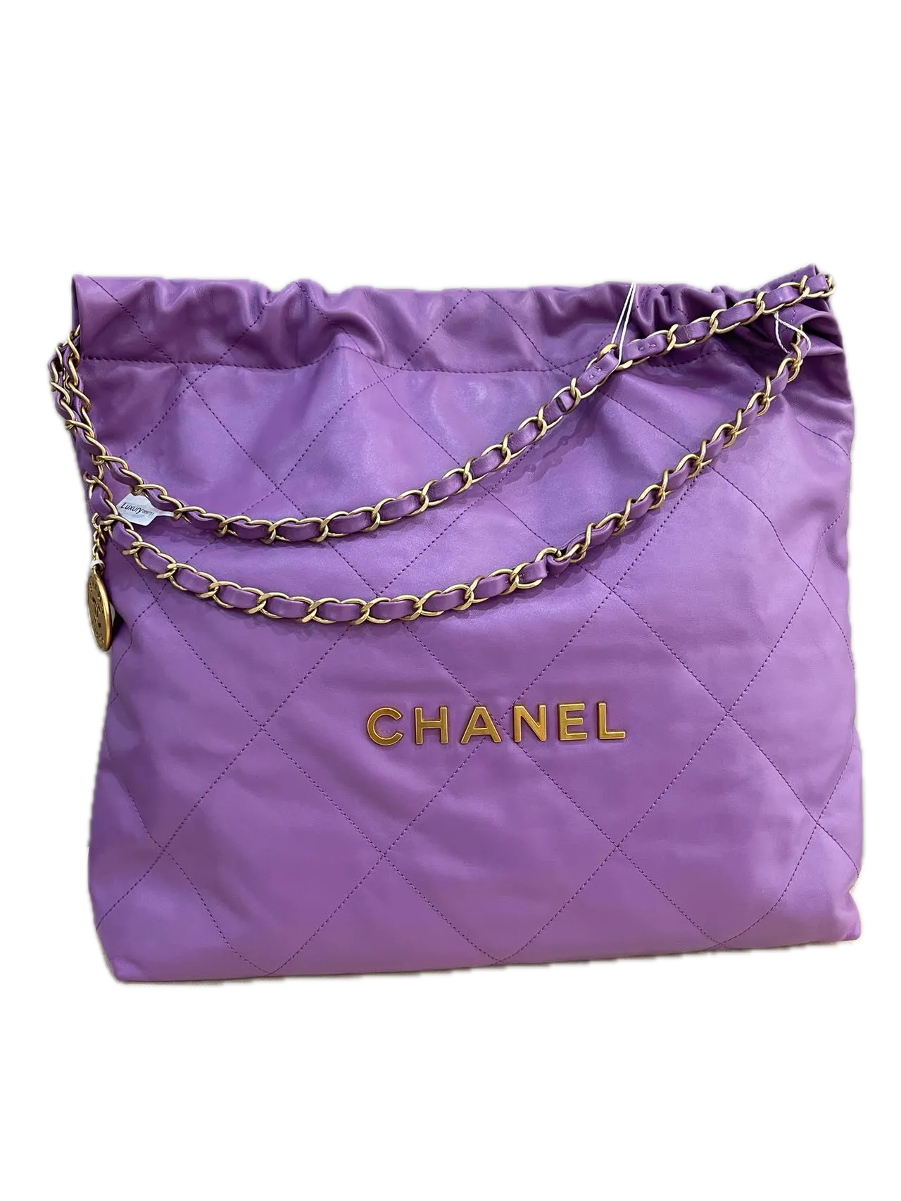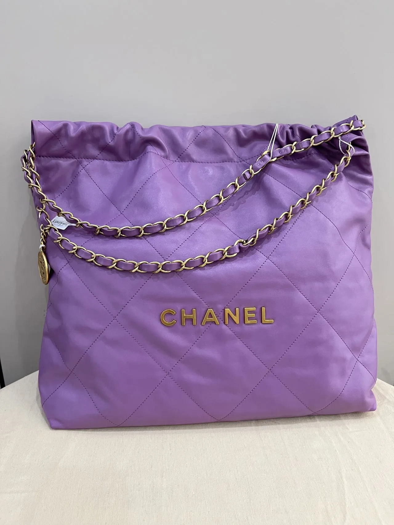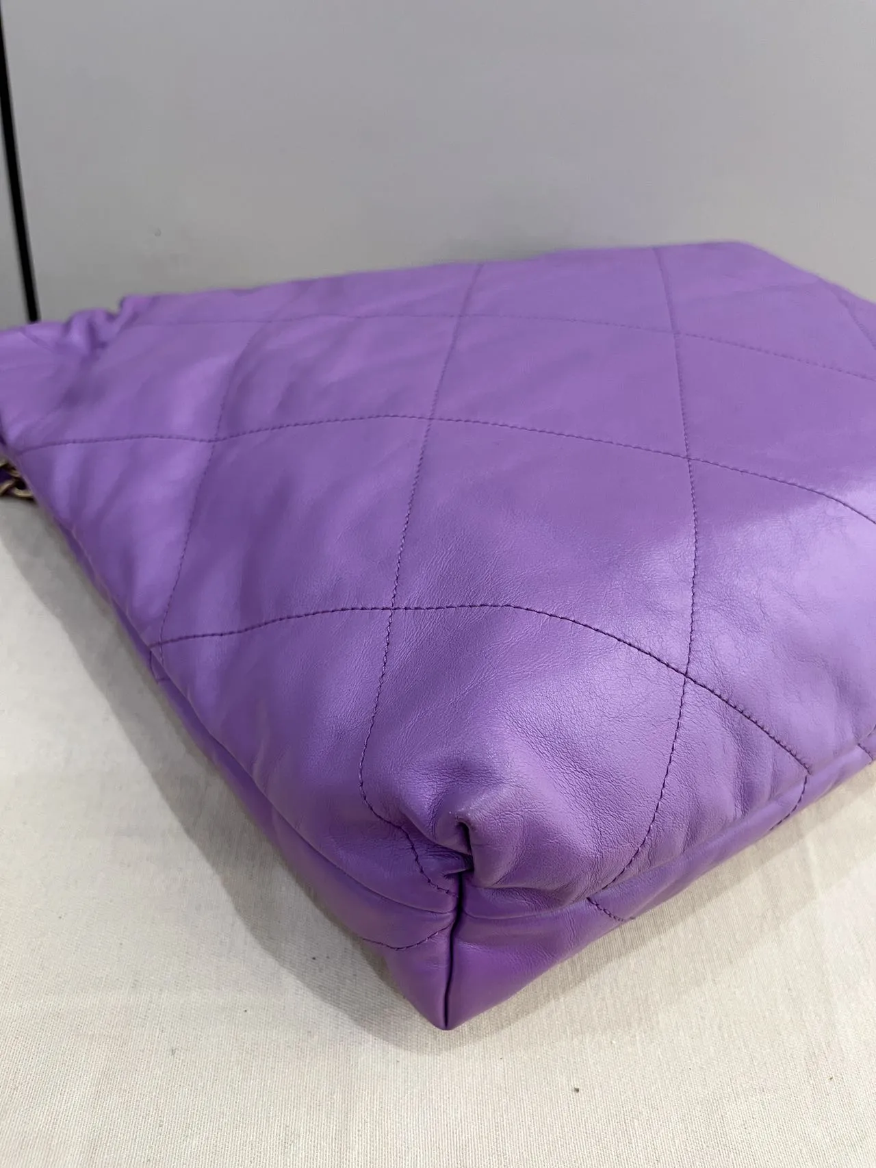 CHANEL 22 Small bag crafted in shiny purple quilted calfskin with gold hardware. Featuring the iconic oversized silhouette and bold CHANEL logo, this modern design blends luxury with everyday functionality.