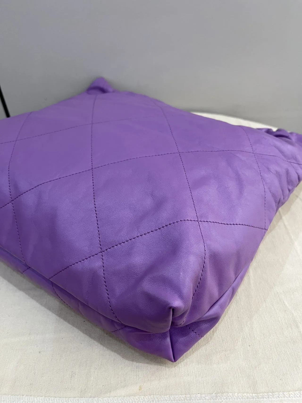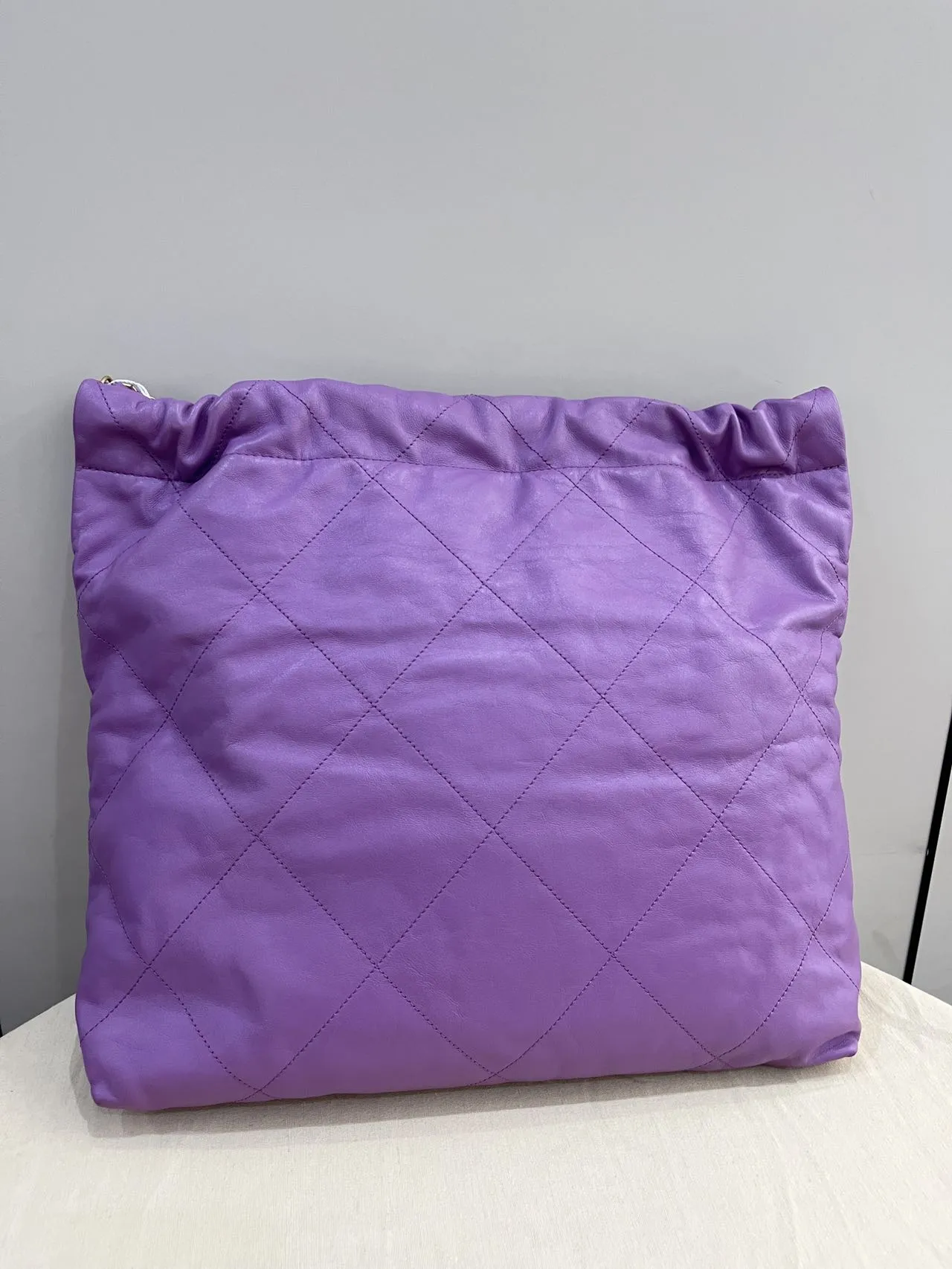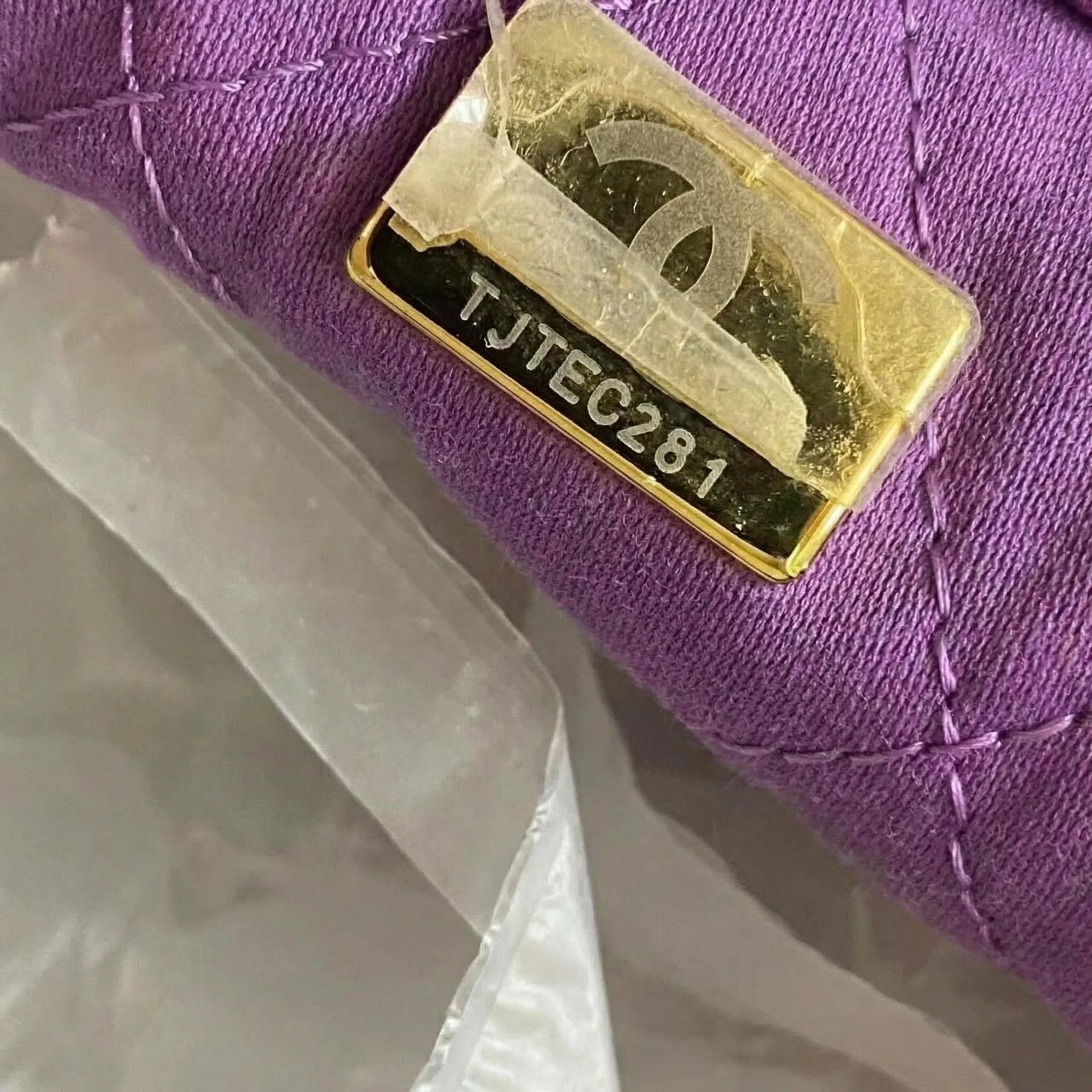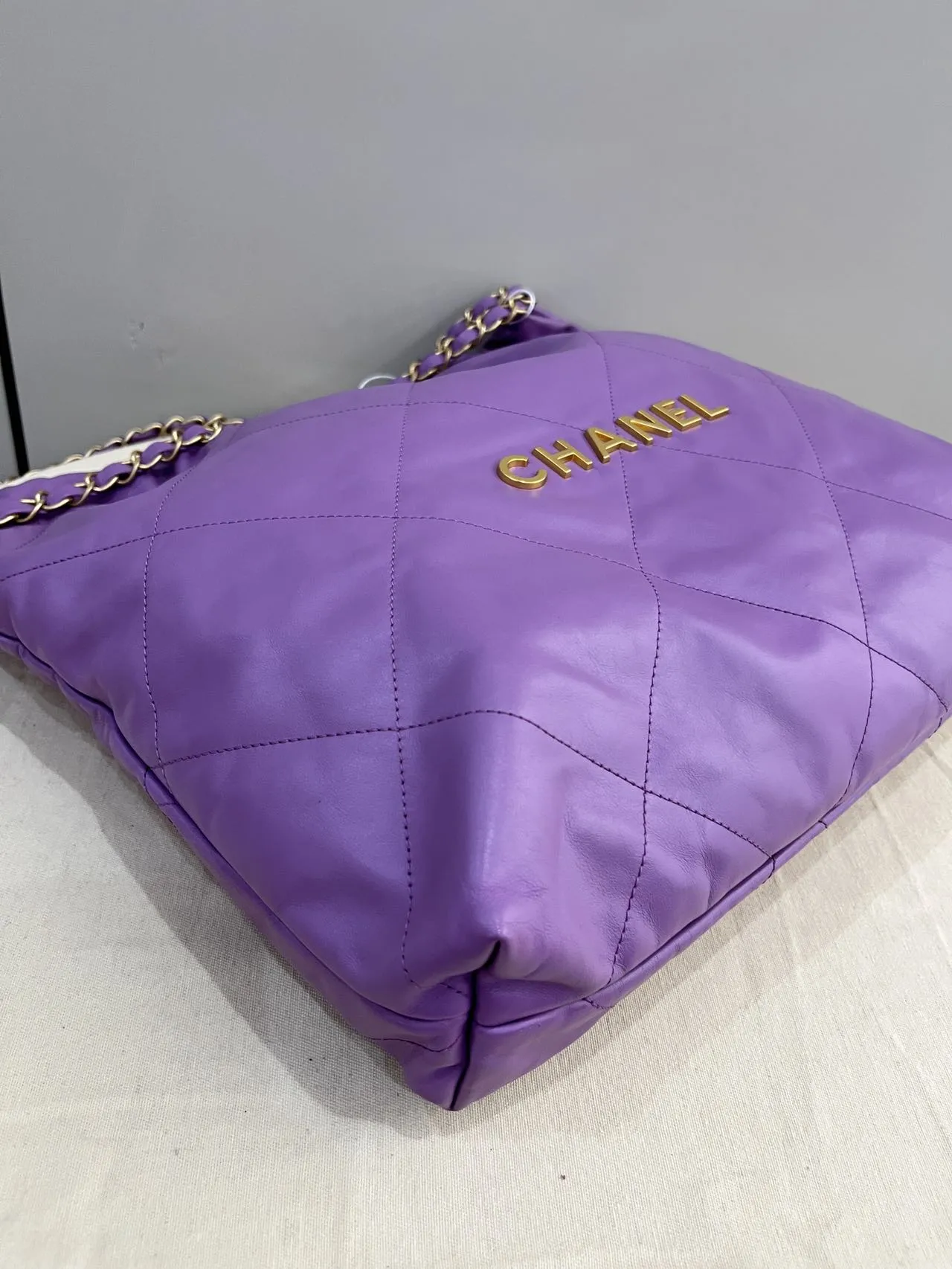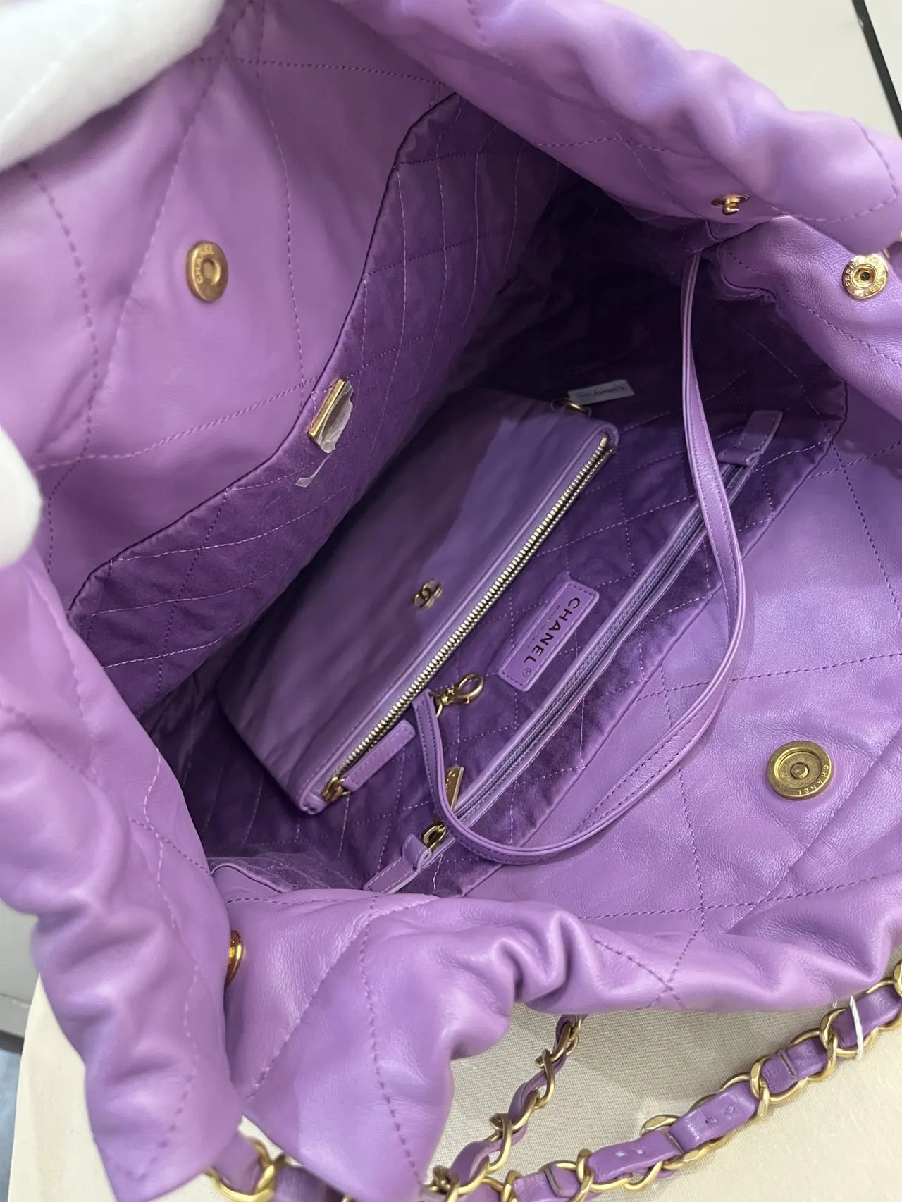 CHANEL 22 Small bag crafted in shiny purple quilted calfskin with gold hardware. Featuring the iconic oversized silhouette and bold CHANEL logo, this modern design blends luxury with everyday functionality.