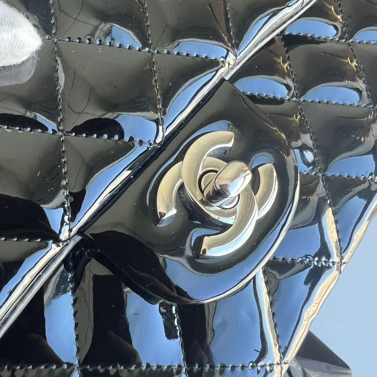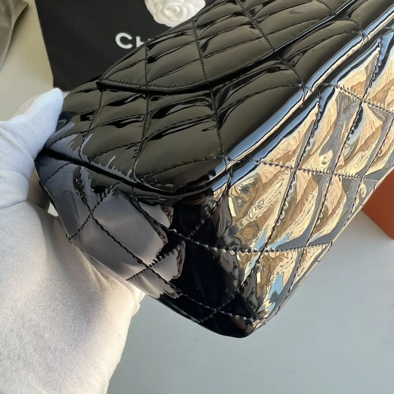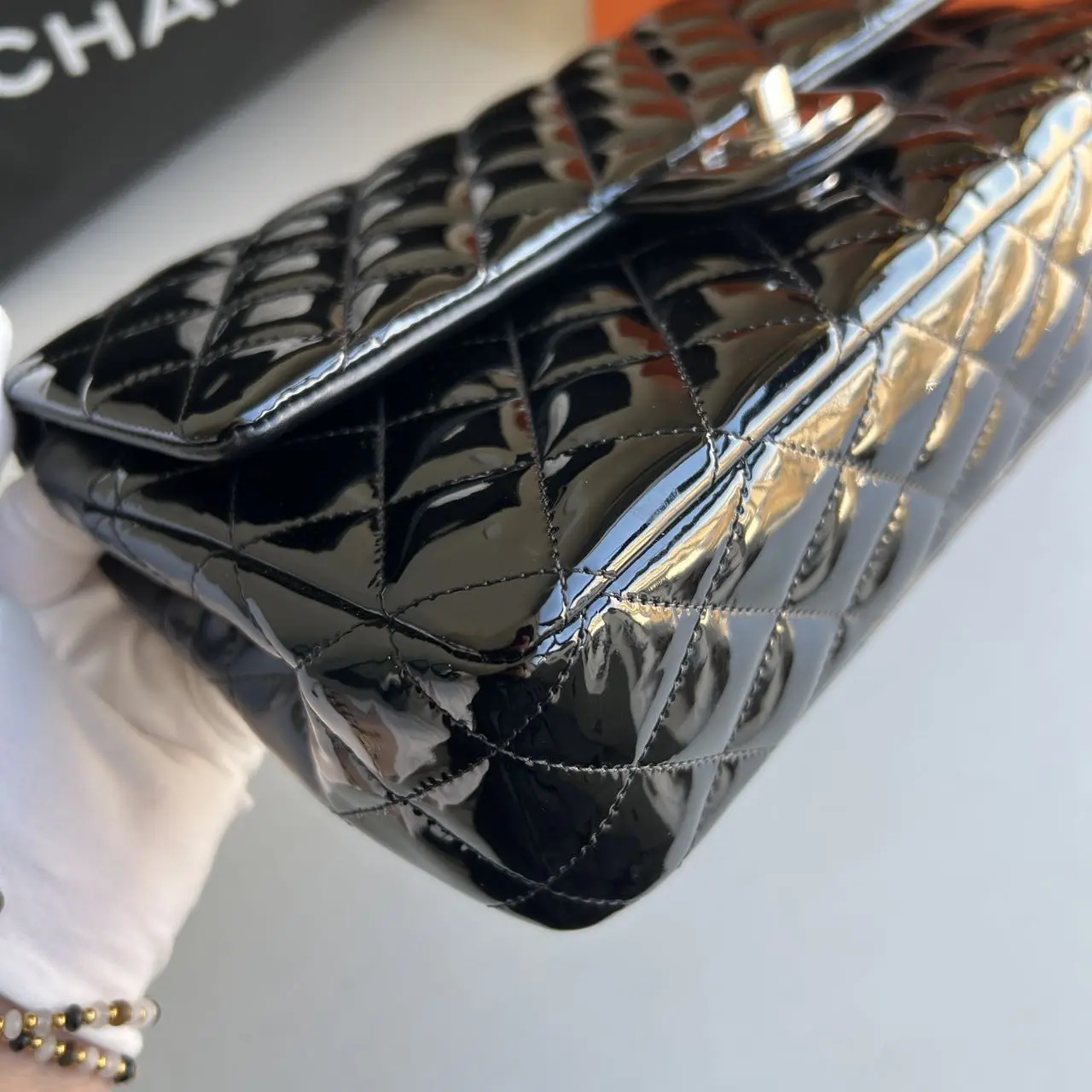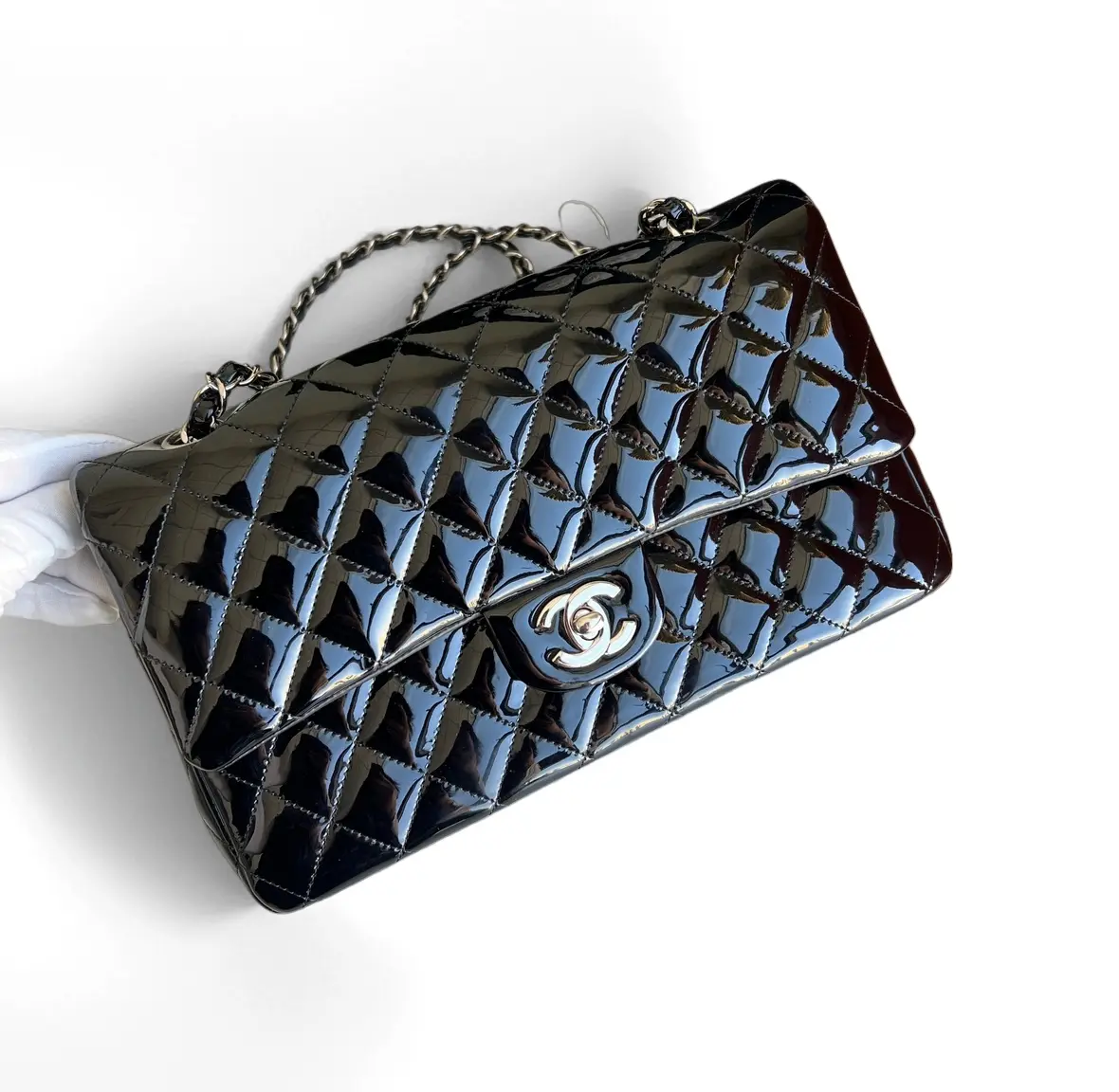 The Chanel Quilted Patent Leather Classic Jumbo Flap Bag is perhaps the most sought after bag in Chanel’s classic collection, which continually increase in value. This particular bag features quilted patent leather that is glossy and classy, and also features a silvertone turnlock CC closure and double flap top. The versatile leather strap chain can be worn on the shoulder or lengthened to wear with a longer drop. An elegant and timeless piece to add to any collection.