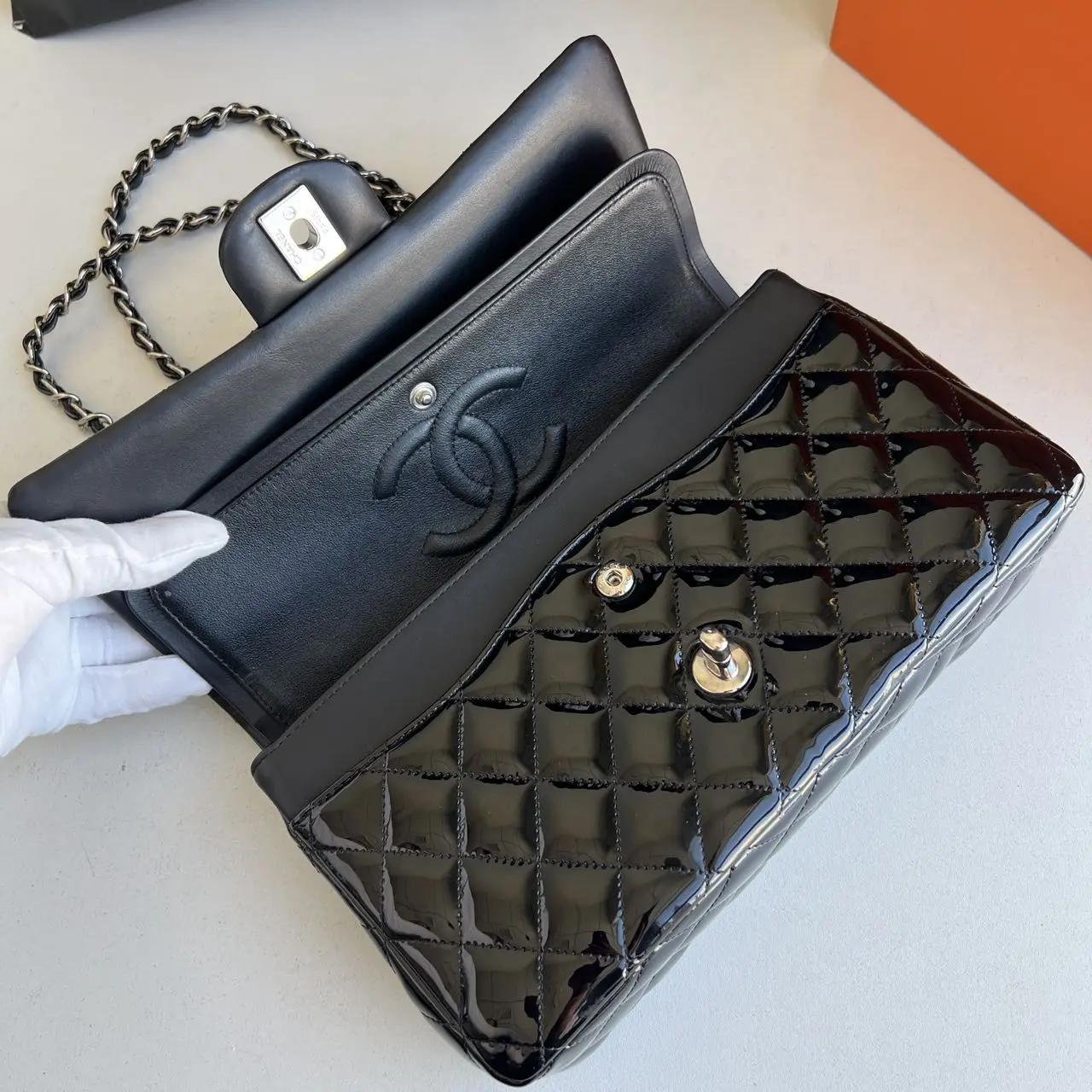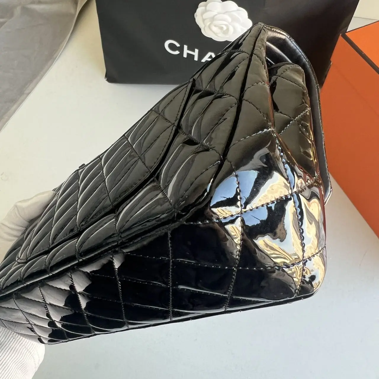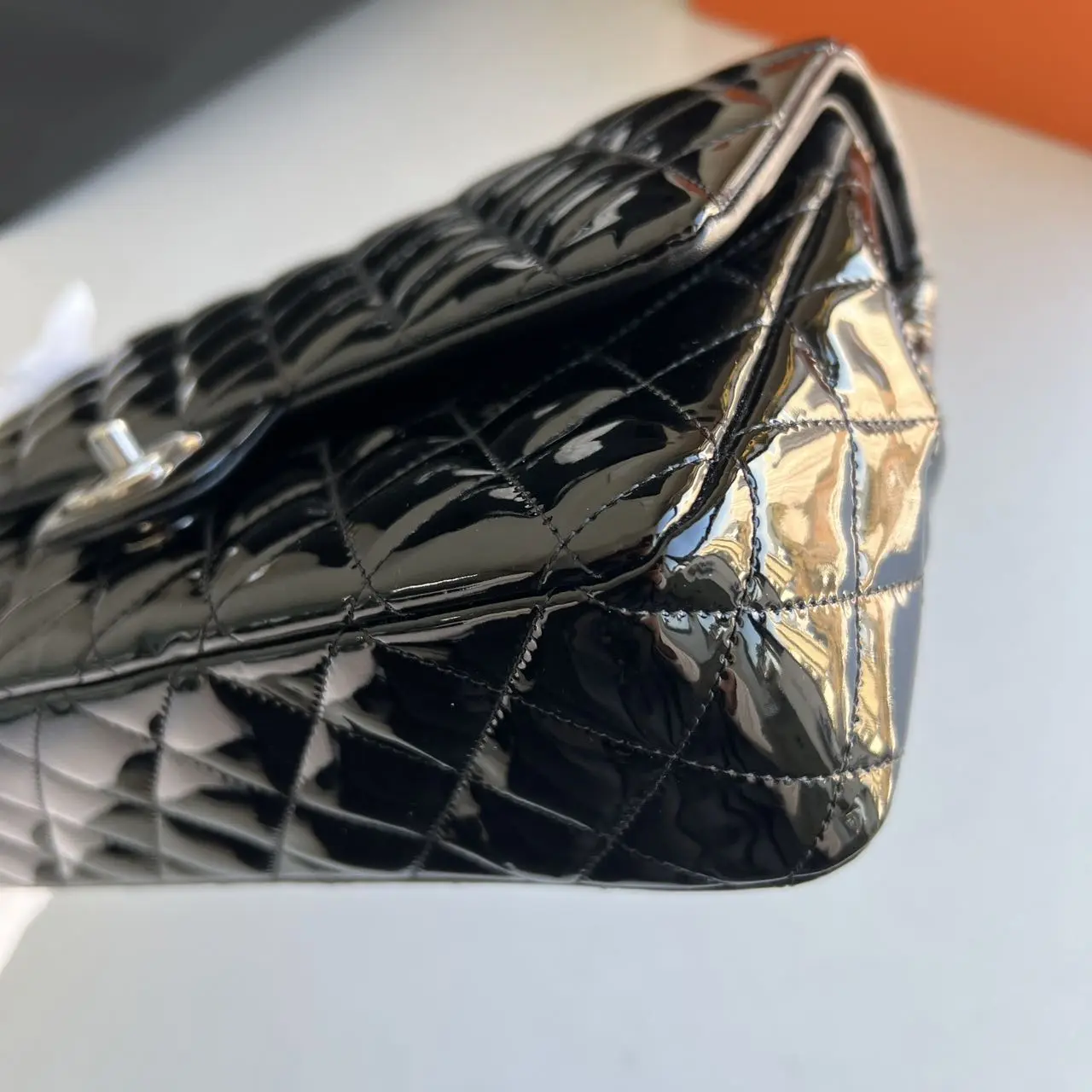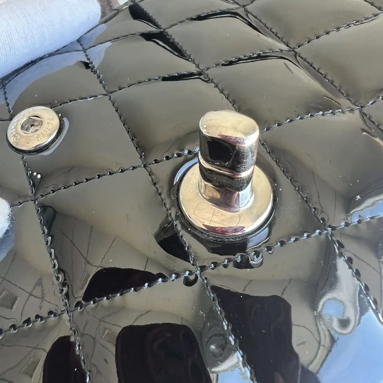 The Chanel Quilted Patent Leather Classic Jumbo Flap Bag is perhaps the most sought after bag in Chanel’s classic collection, which continually increase in value. This particular bag features quilted patent leather that is glossy and classy, and also features a silvertone turnlock CC closure and double flap top. The versatile leather strap chain can be worn on the shoulder or lengthened to wear with a longer drop. An elegant and timeless piece to add to any collection.