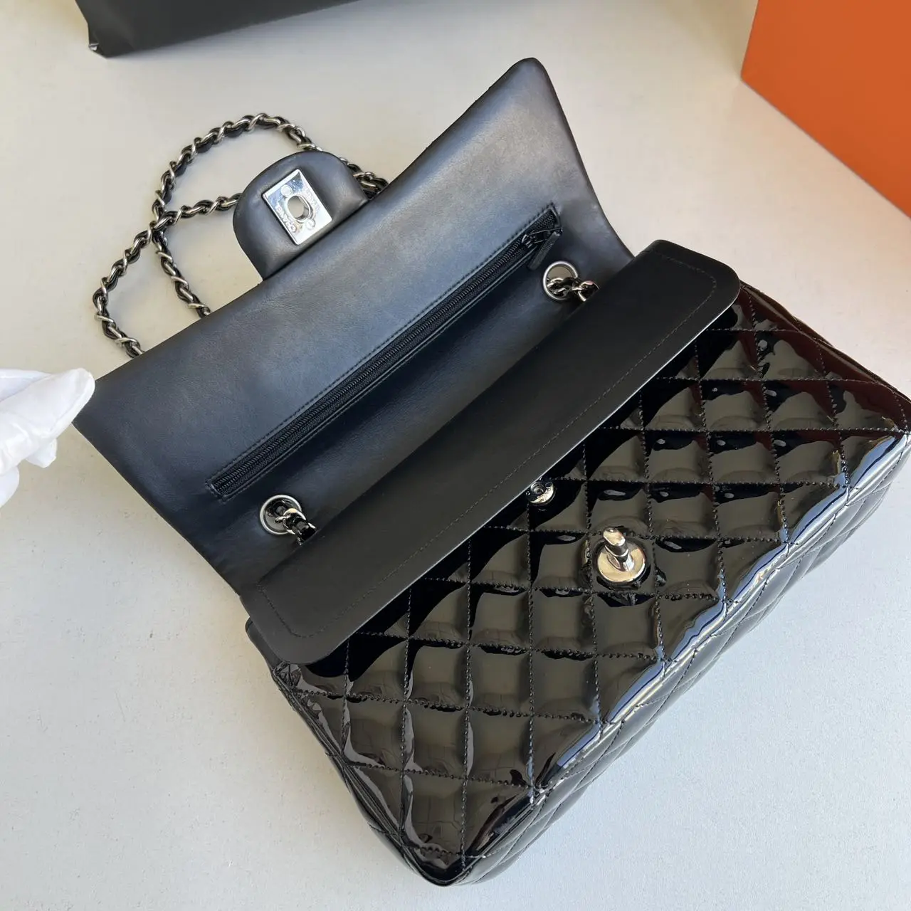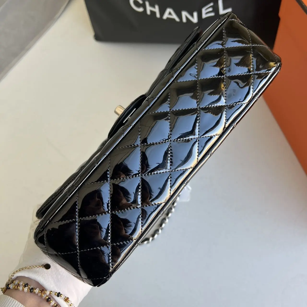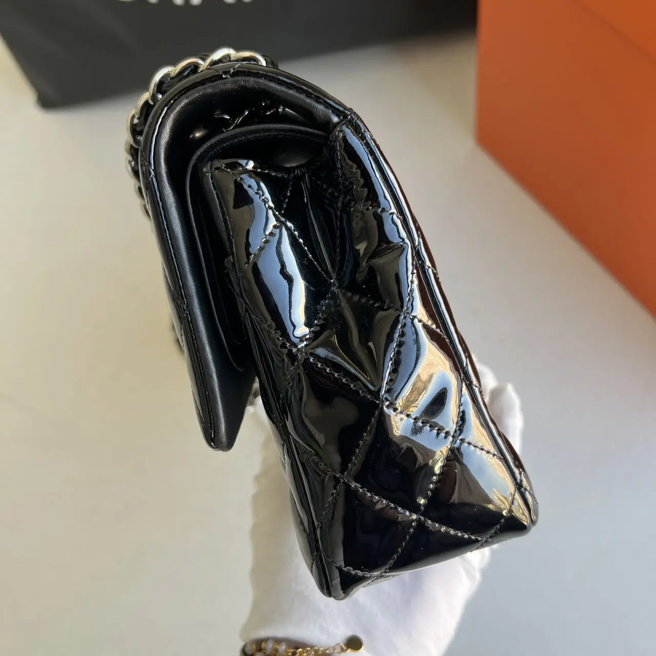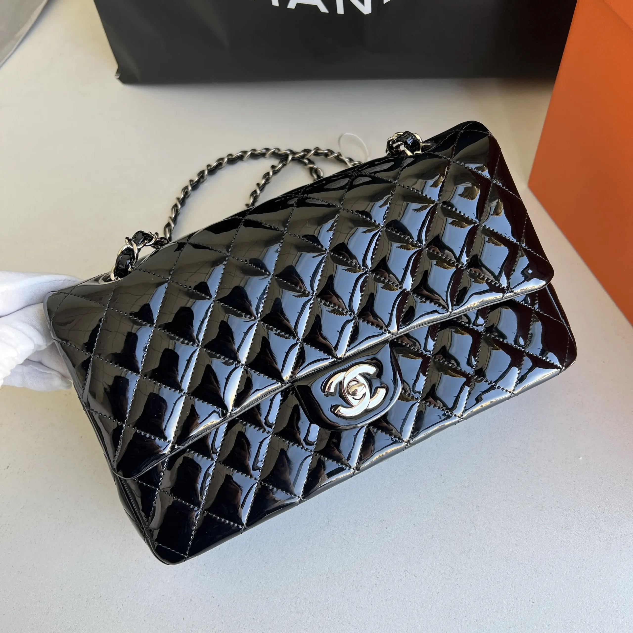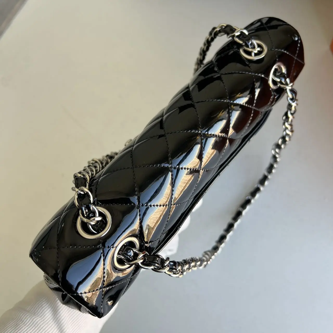 The Chanel Quilted Patent Leather Classic Jumbo Flap Bag is perhaps the most sought after bag in Chanel’s classic collection, which continually increase in value. This particular bag features quilted patent leather that is glossy and classy, and also features a silvertone turnlock CC closure and double flap top. The versatile leather strap chain can be worn on the shoulder or lengthened to wear with a longer drop. An elegant and timeless piece to add to any collection.