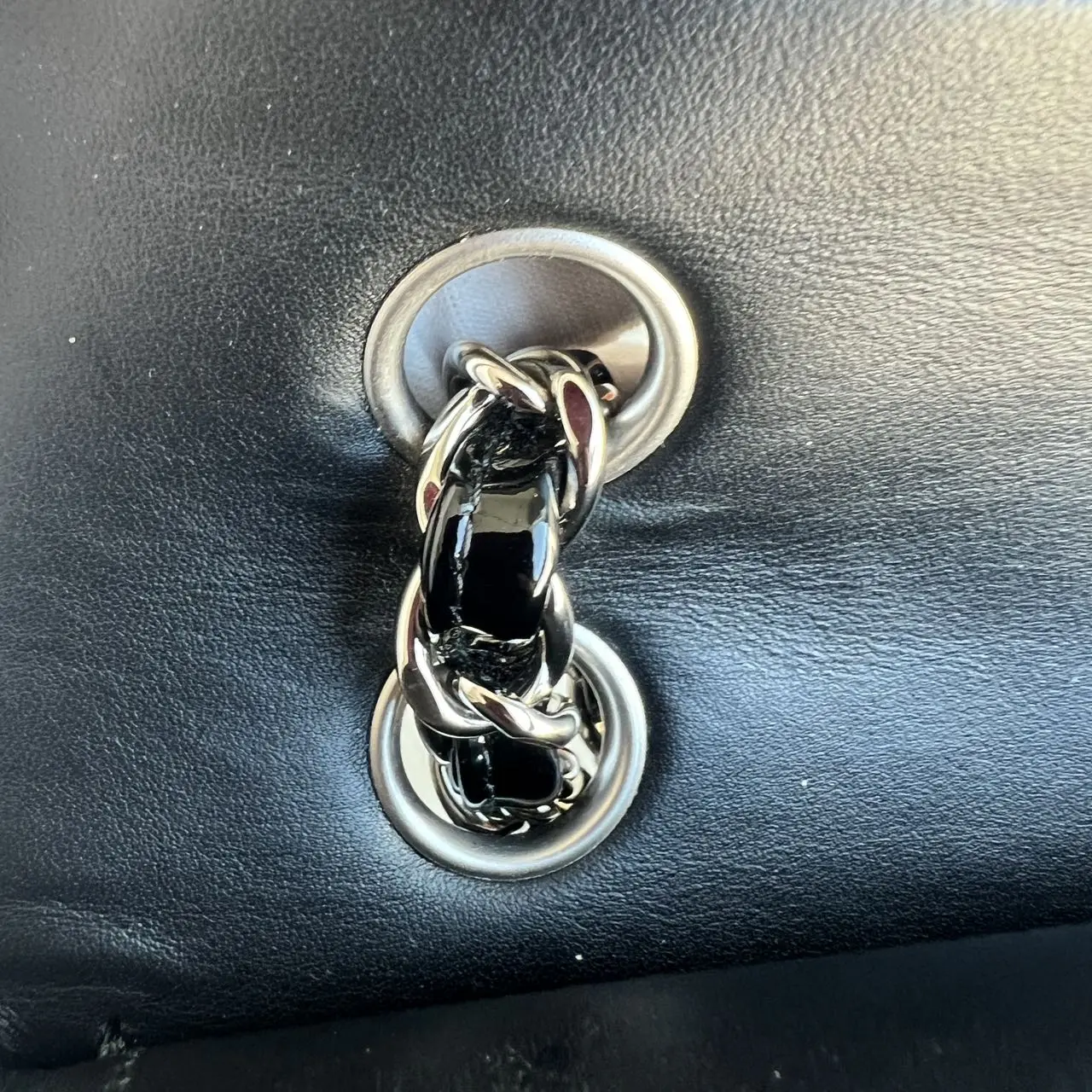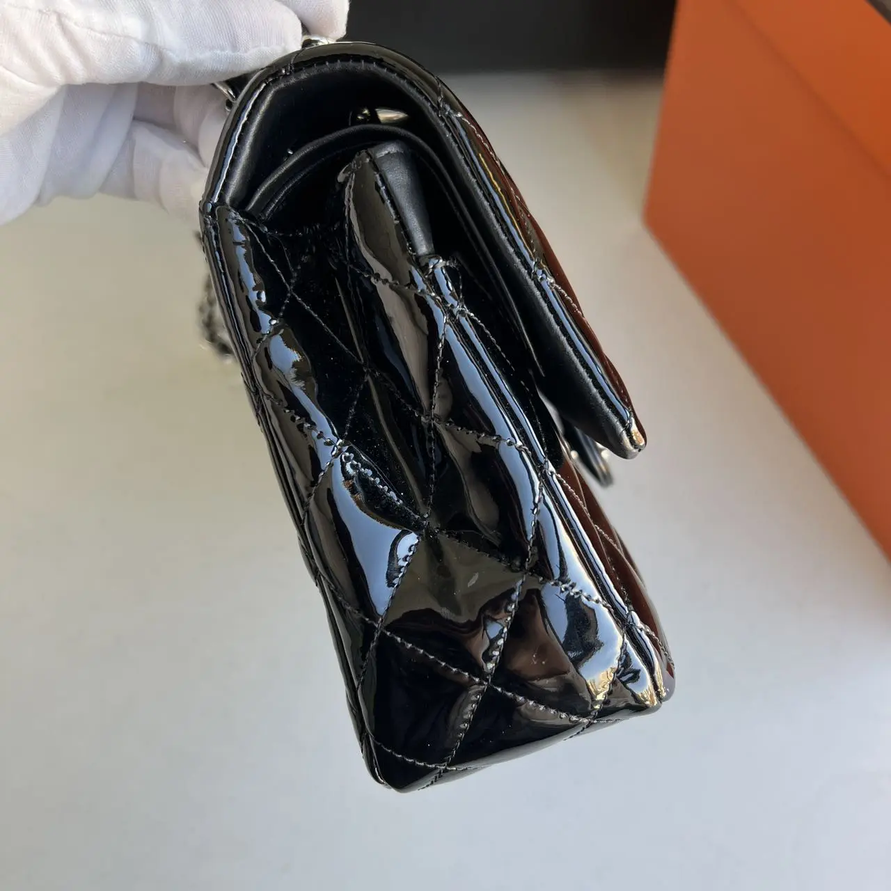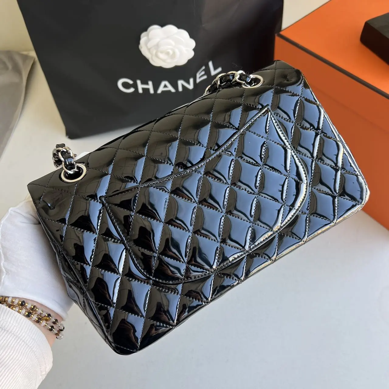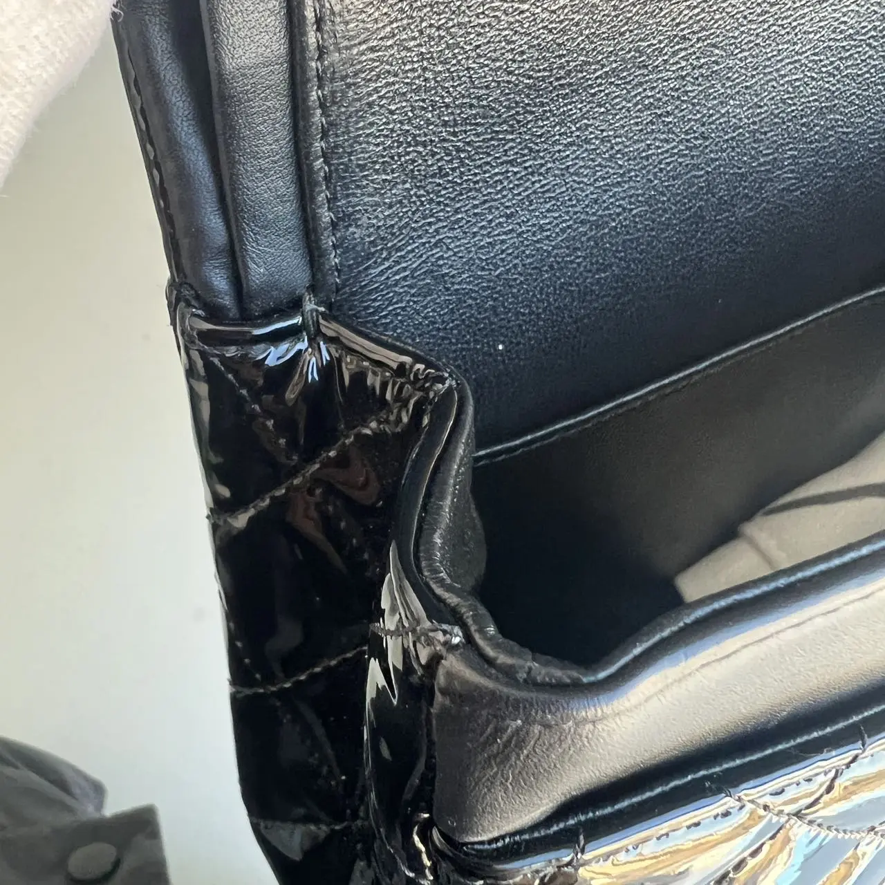 The Chanel Quilted Patent Leather Classic Jumbo Flap Bag is perhaps the most sought after bag in Chanel’s classic collection, which continually increase in value. This particular bag features quilted patent leather that is glossy and classy, and also features a silvertone turnlock CC closure and double flap top. The versatile leather strap chain can be worn on the shoulder or lengthened to wear with a longer drop. An elegant and timeless piece to add to any collection.
