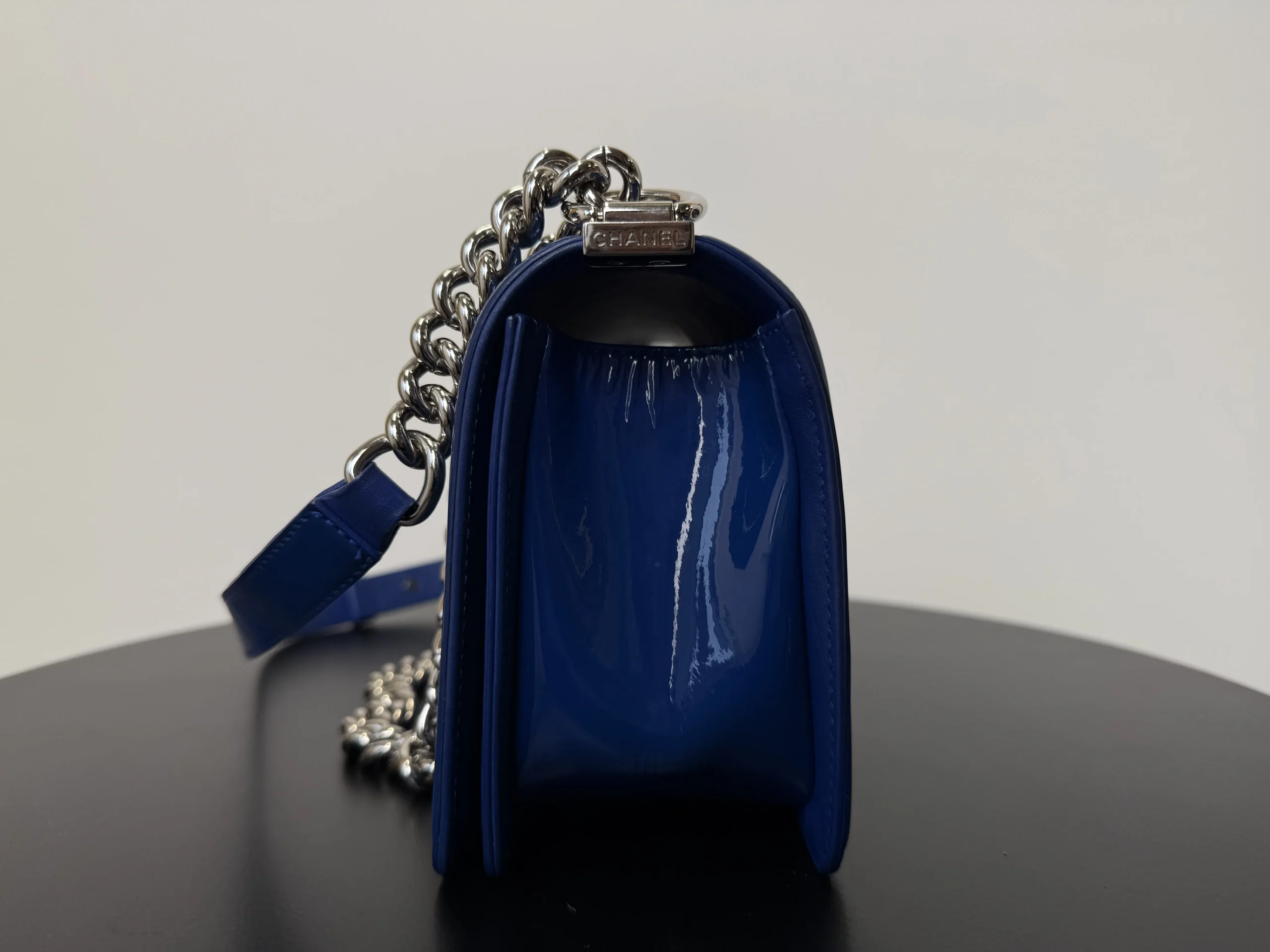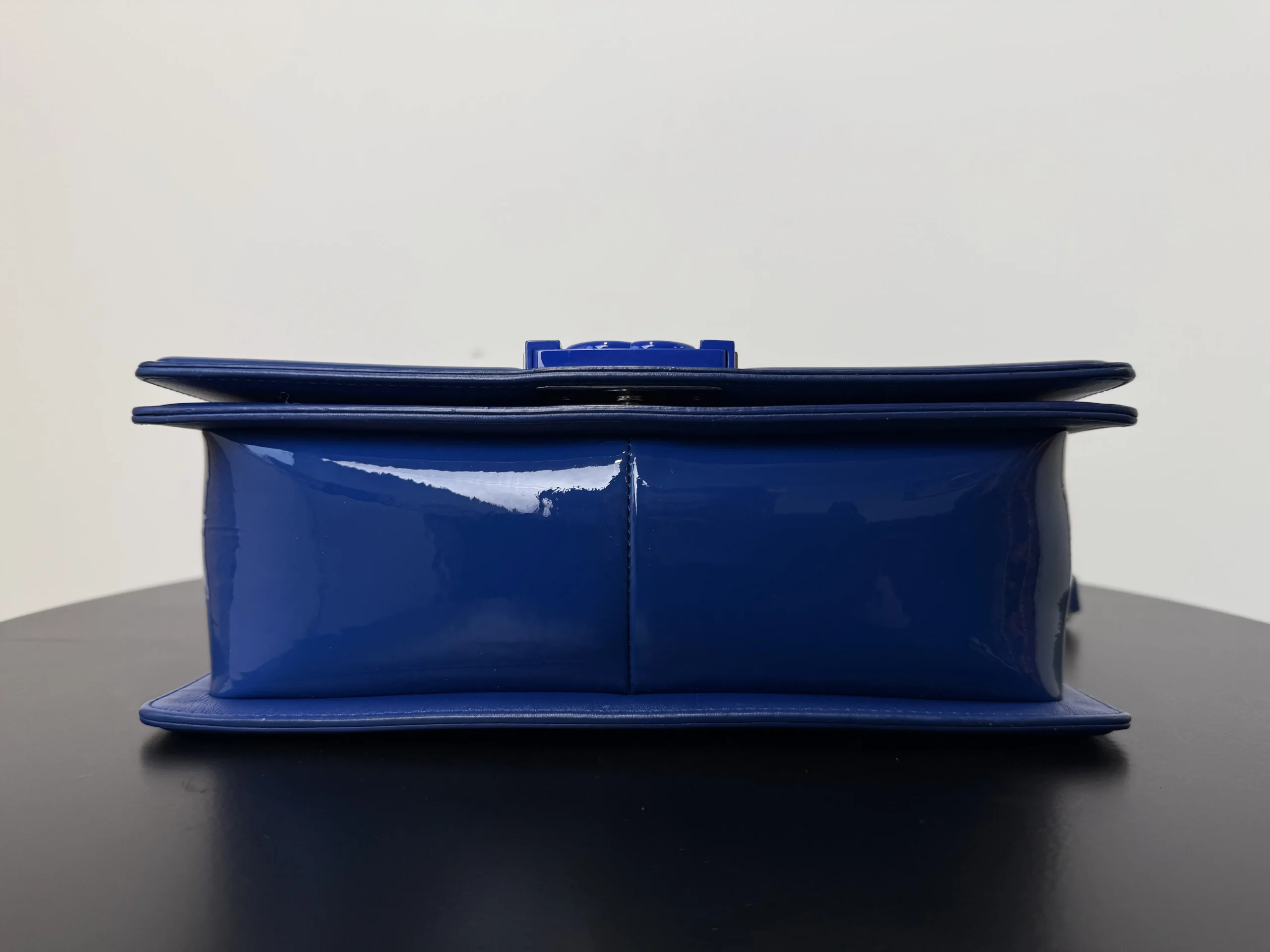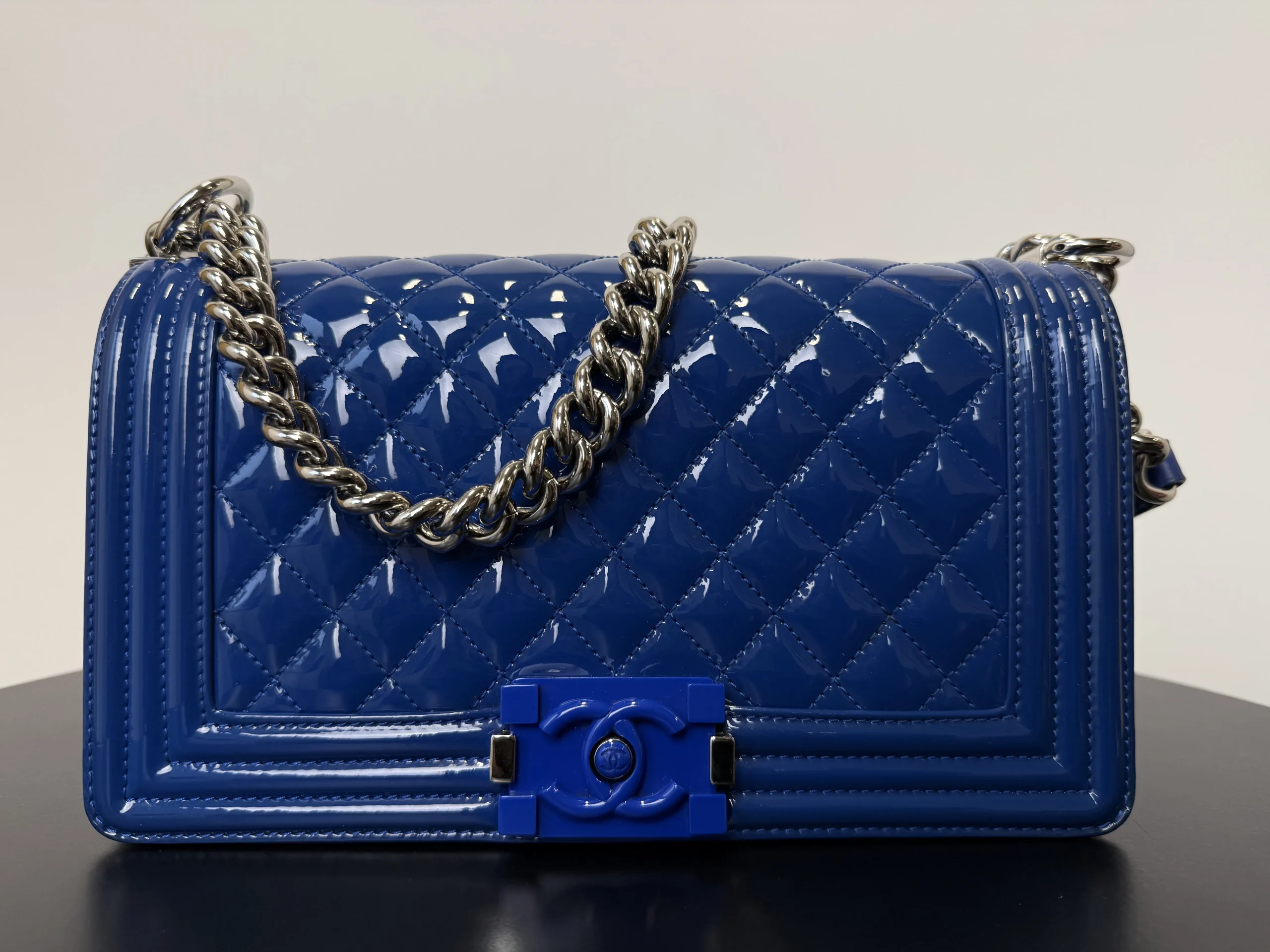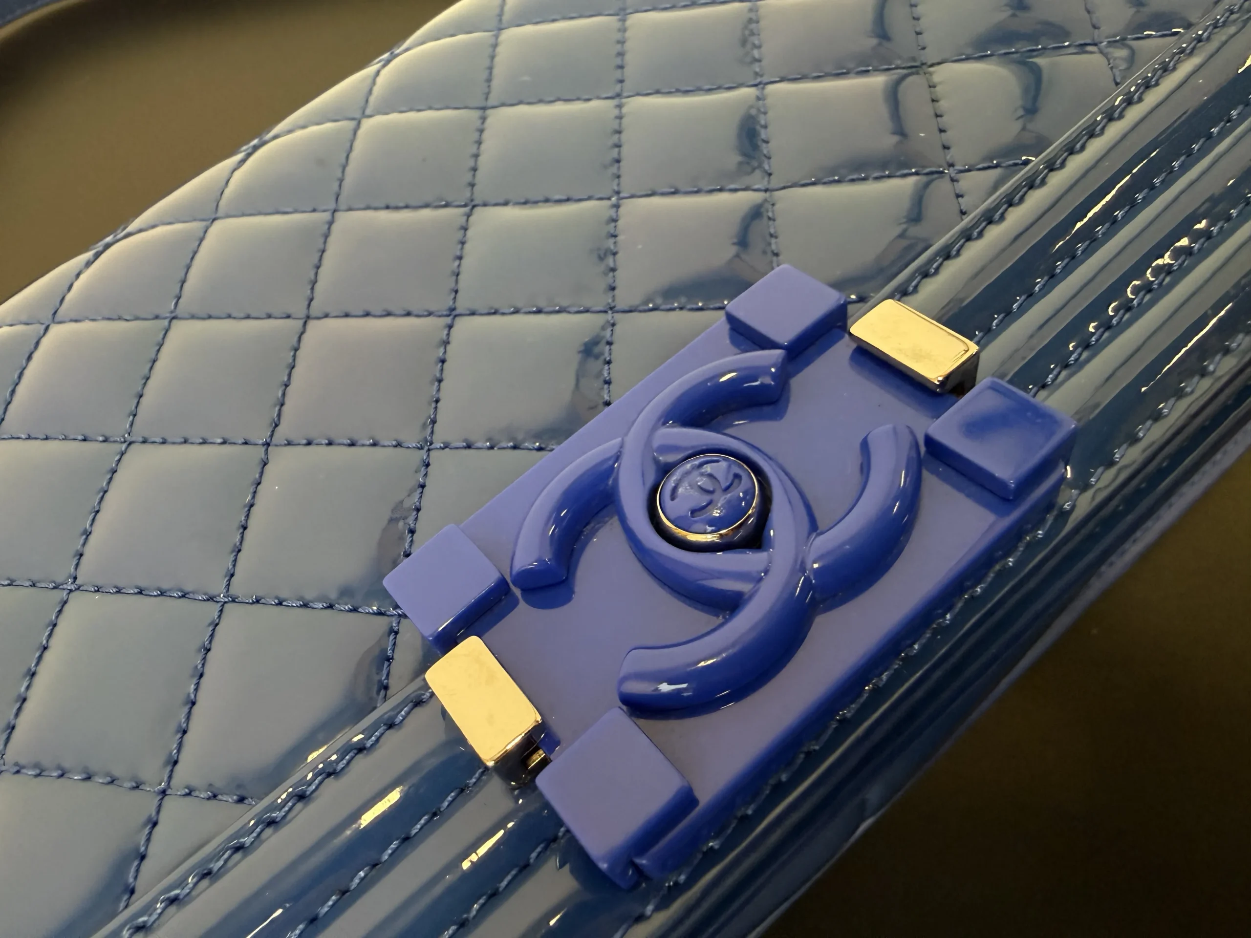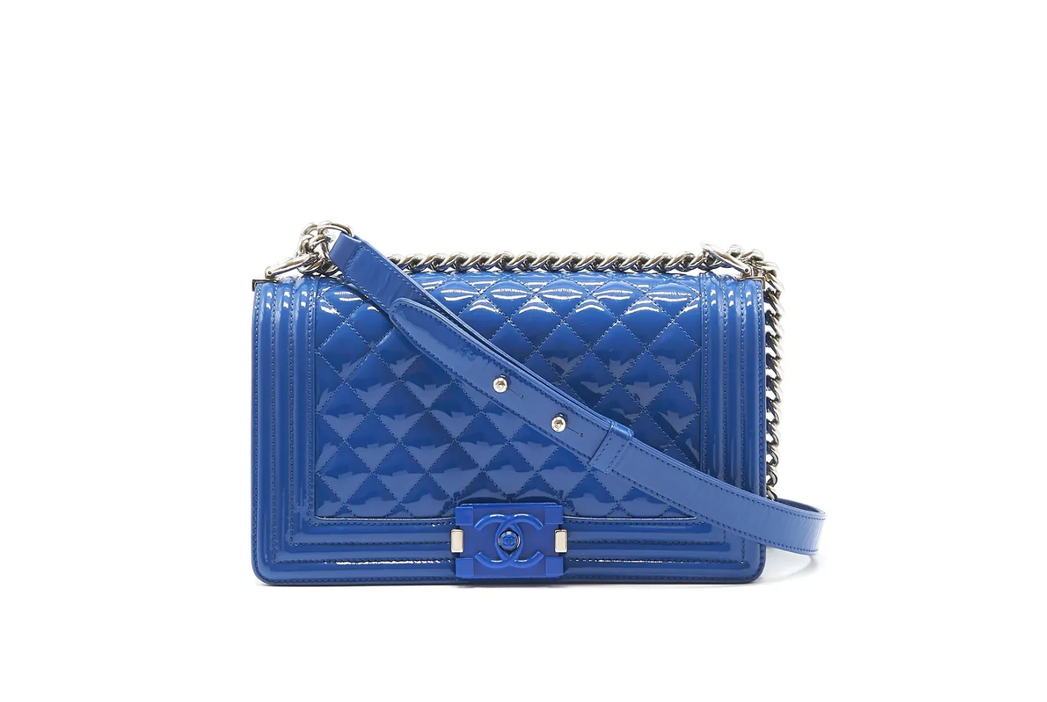 The CHANEL Medium Boy Bag in lake blue patent leather is a bold and luminous statement, where the high-shine finish in a serene aquatic hue transforms the collection’s signature structured silhouette and double C closure into a modern and eye-catching emblem of luxury.