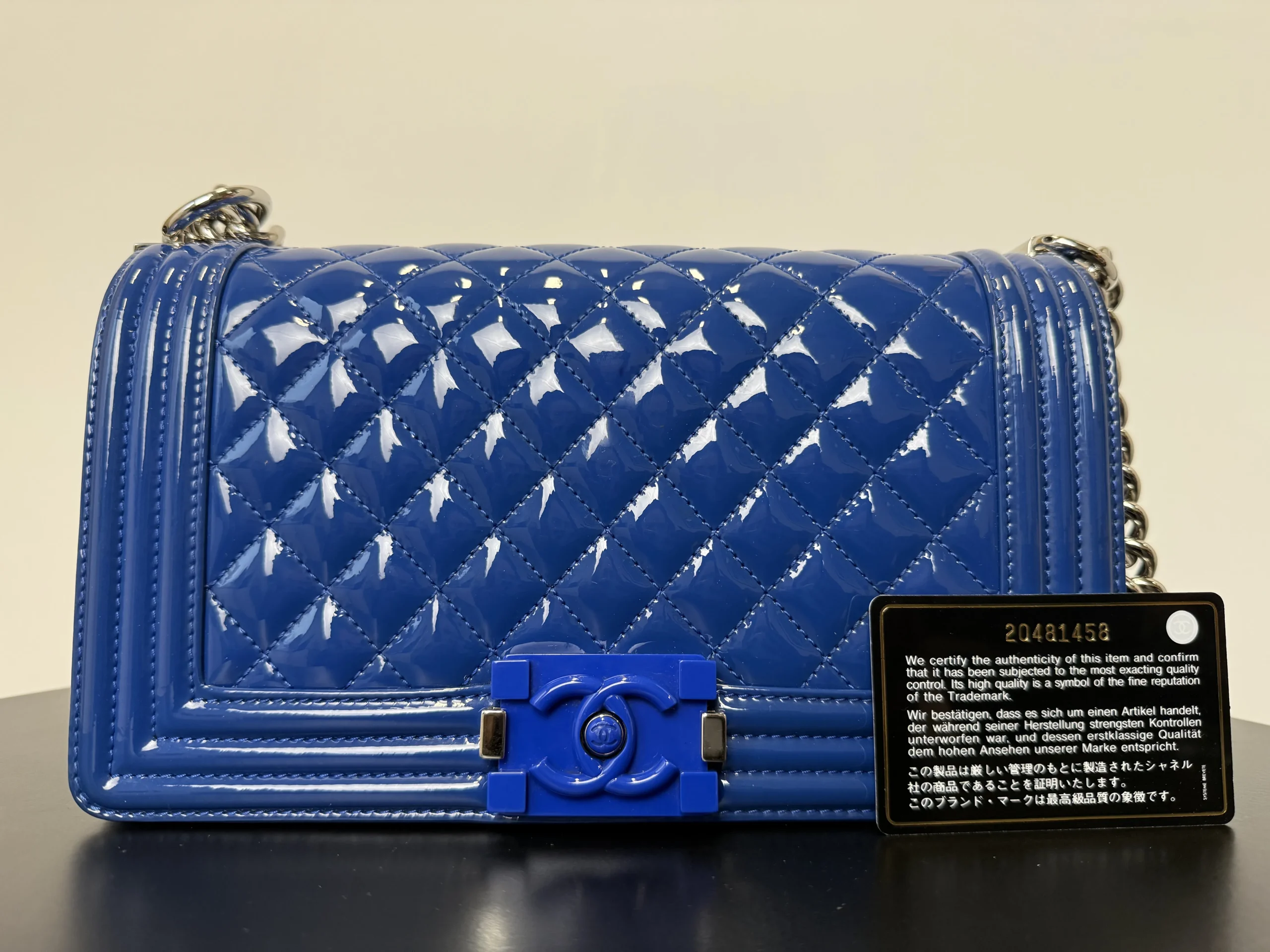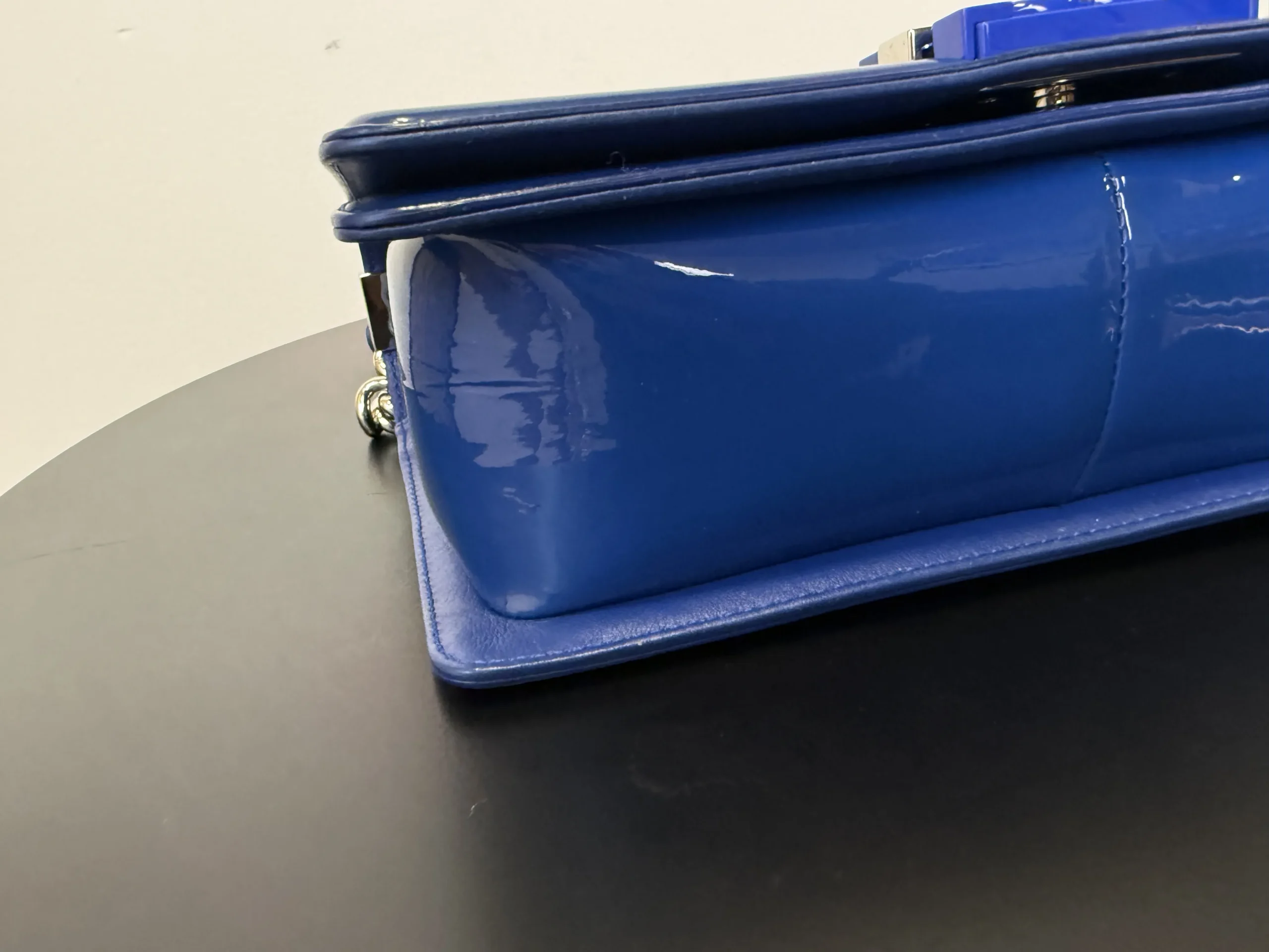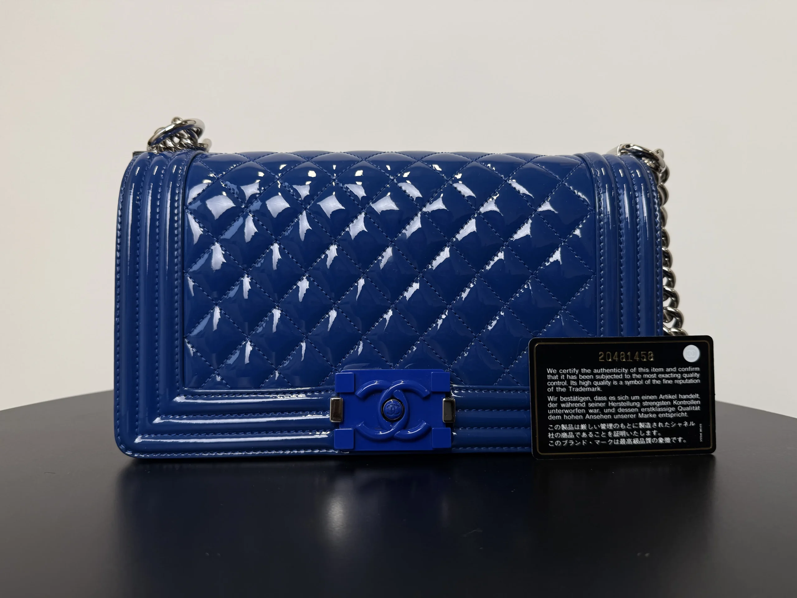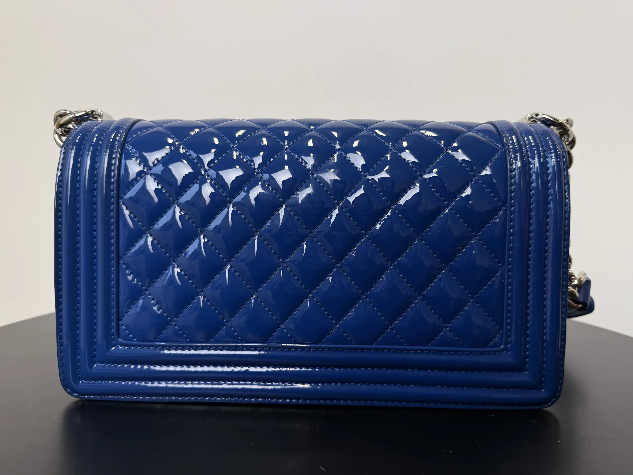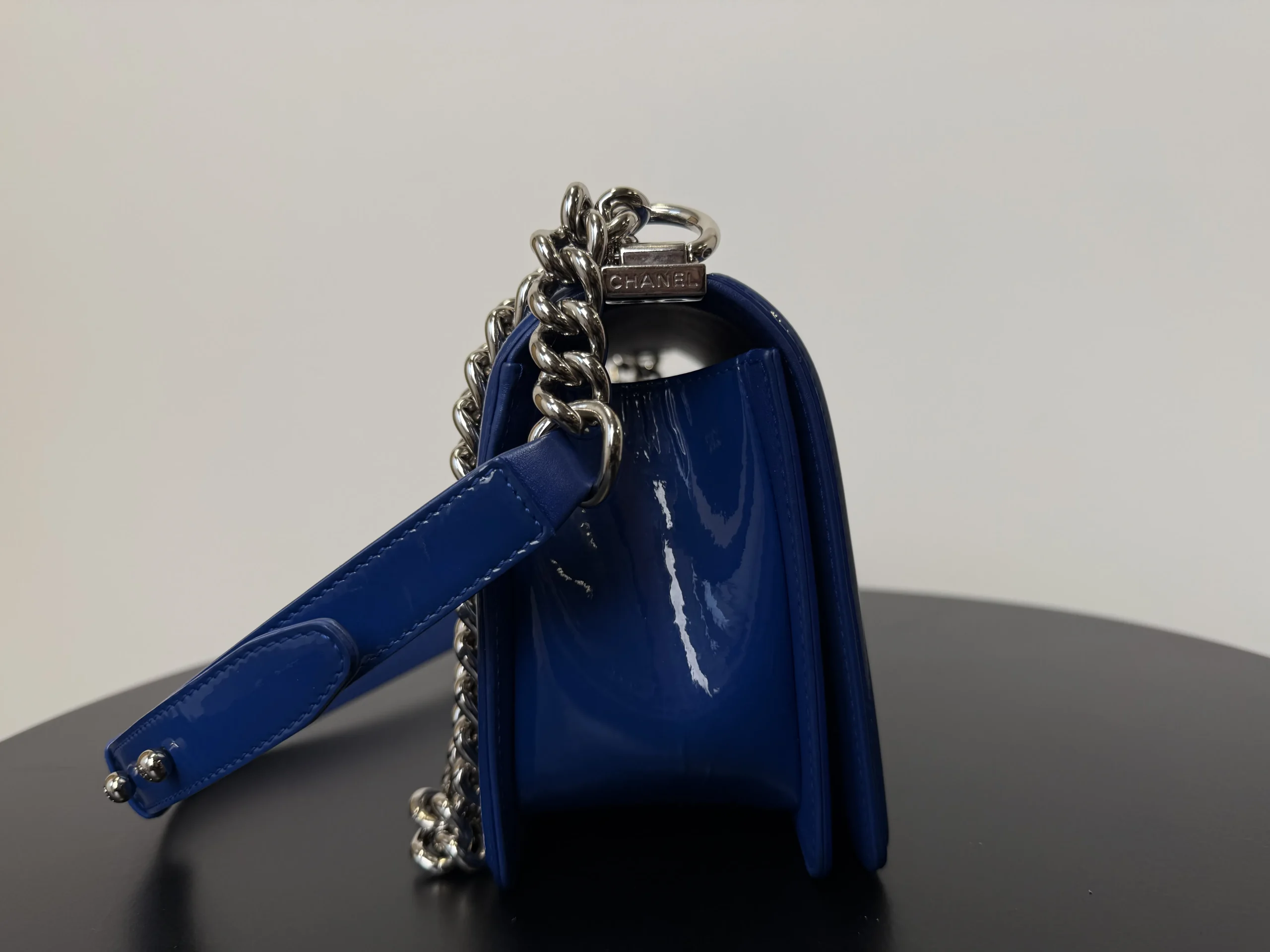 The CHANEL Medium Boy Bag in lake blue patent leather is a bold and luminous statement, where the high-shine finish in a serene aquatic hue transforms the collection’s signature structured silhouette and double C closure into a modern and eye-catching emblem of luxury.