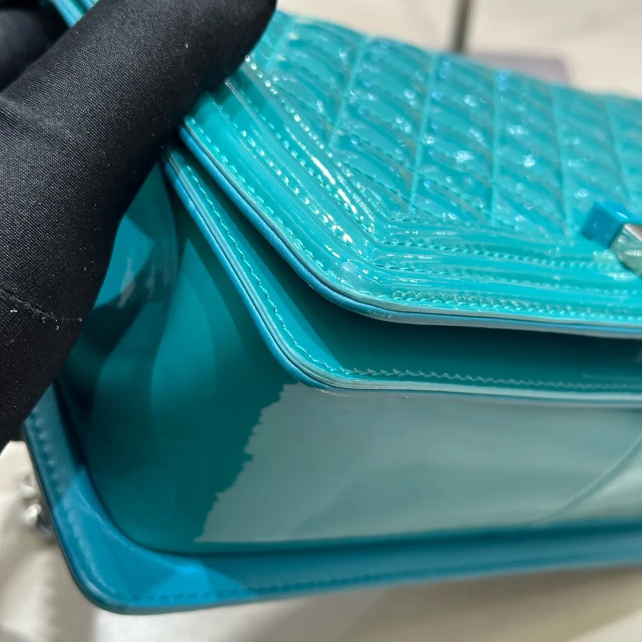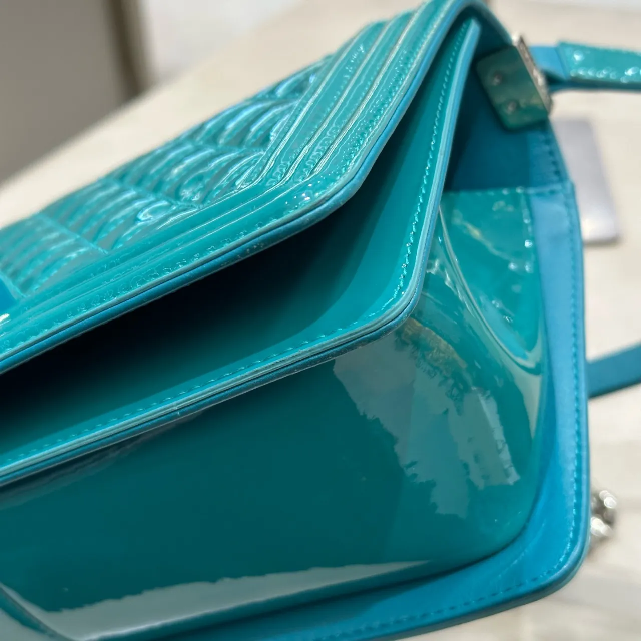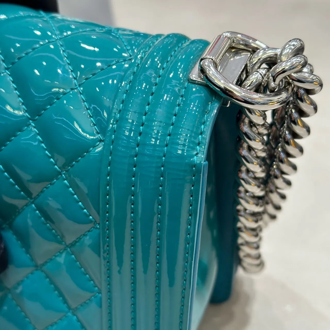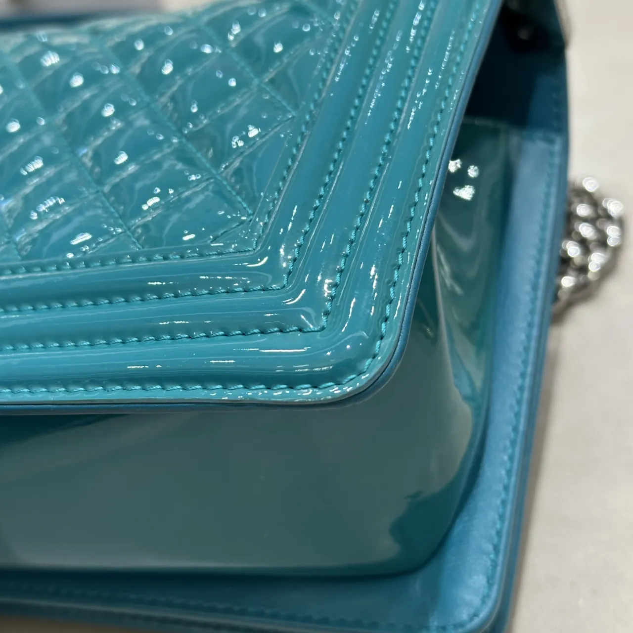 The iconic Chanel Boy Flap Medium Bag is crafted in lake blue eye-catching pink patent leather, offering a bold yet timeless statement. This medium-sized Boy Bag combines a structured silhouette with a modern edge, perfect for both day and evening wear. The glossy patent finish enhances its luxurious appeal, while the classic Boy design remains endlessly desirable. A highly sought-after Chanel style, this piece is known for its durability, versatility, and strong long-term value.