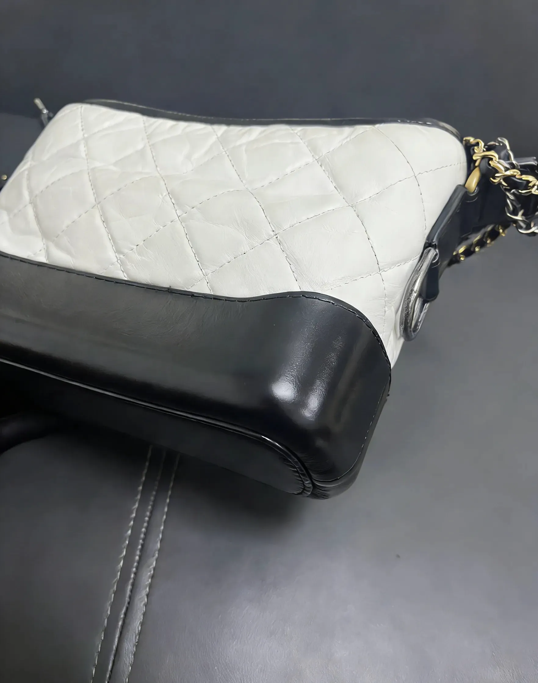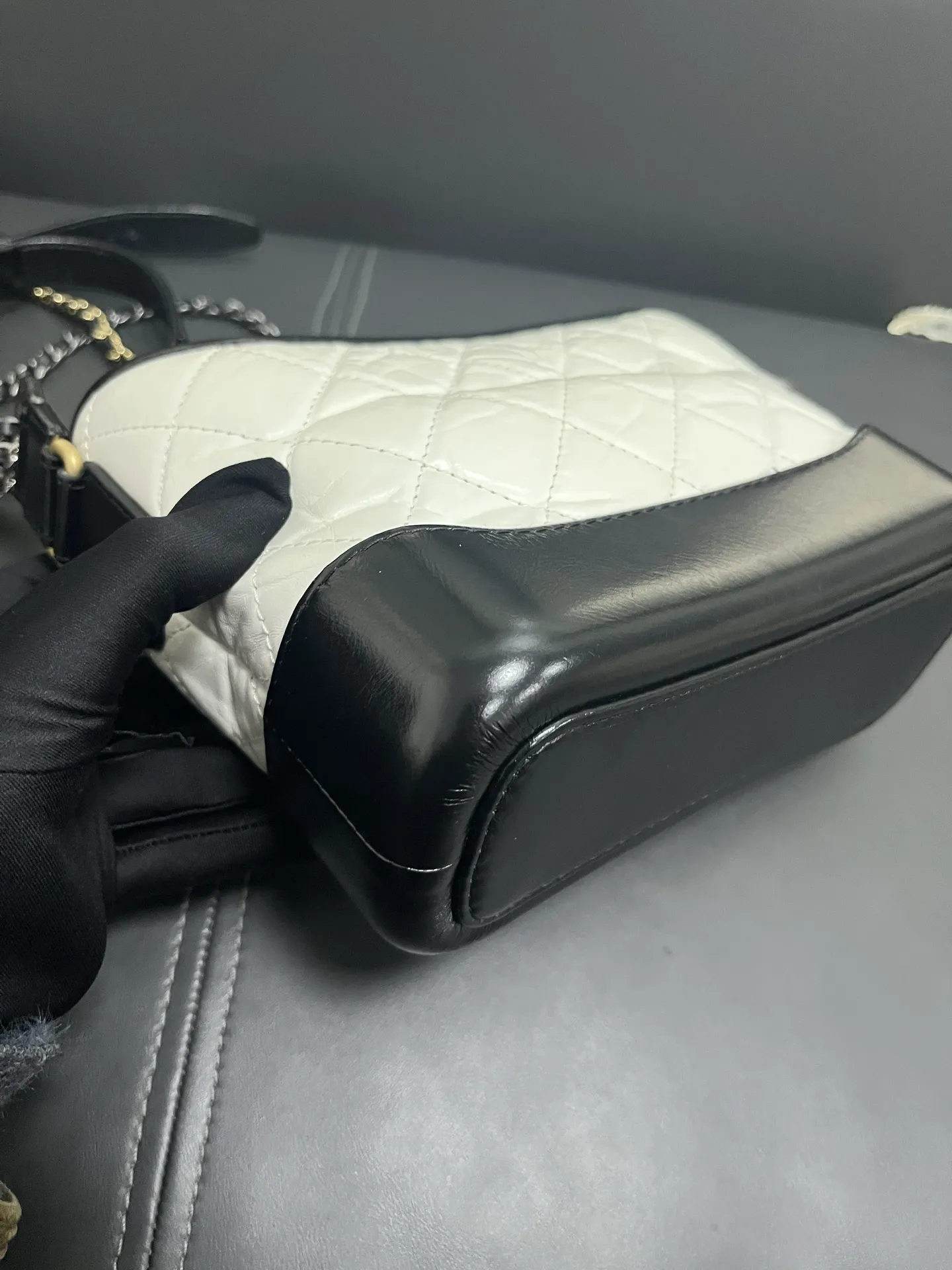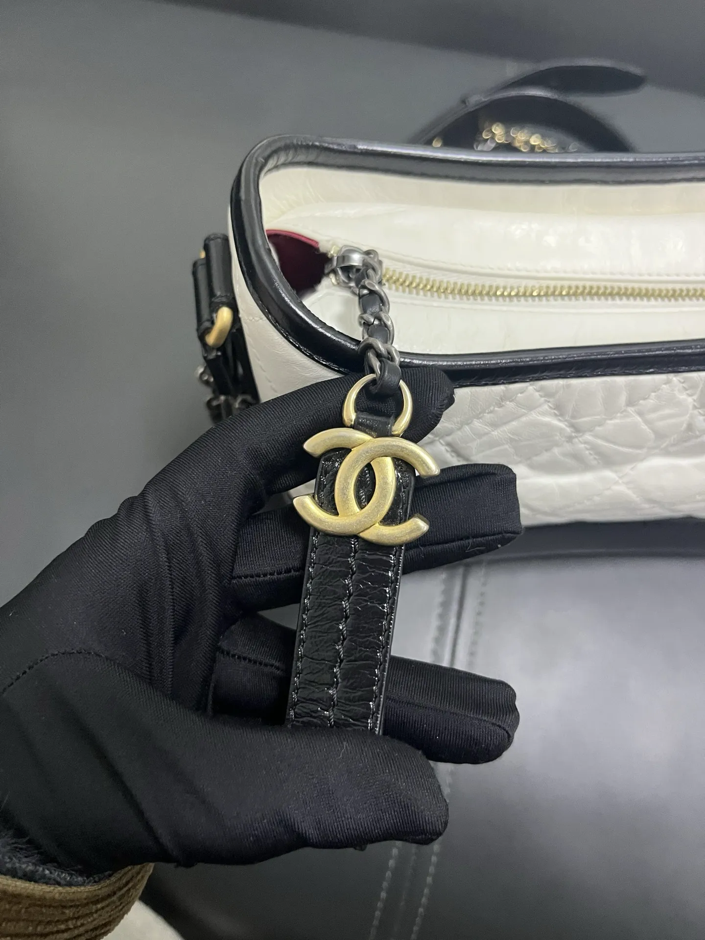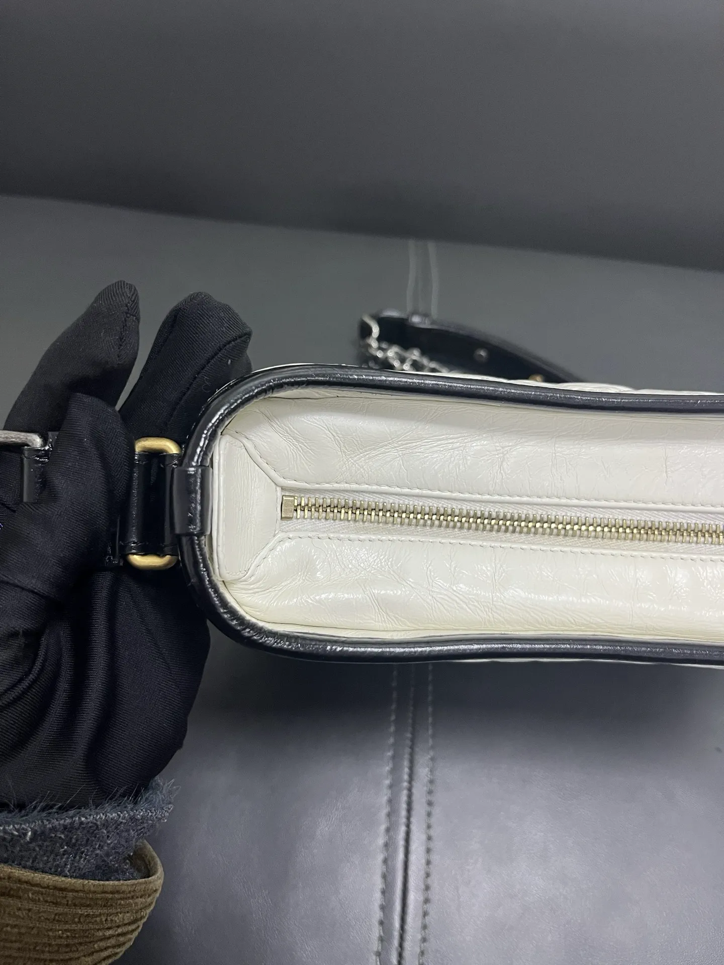 CHANEL Aged Calfskin Quilted Small Gabrielle Hobo in Black and White. This chic shoulder bag is crafted of diamond quilted aged calfskin leather in white, with a sturdy black leather base. The bag features a black leather threaded chain-link shoulder strap, with multiple hardware tones including polished gold, silver, and ruthenium. The top zipper opens to a deep red fabric interior with zipper and patch pockets.