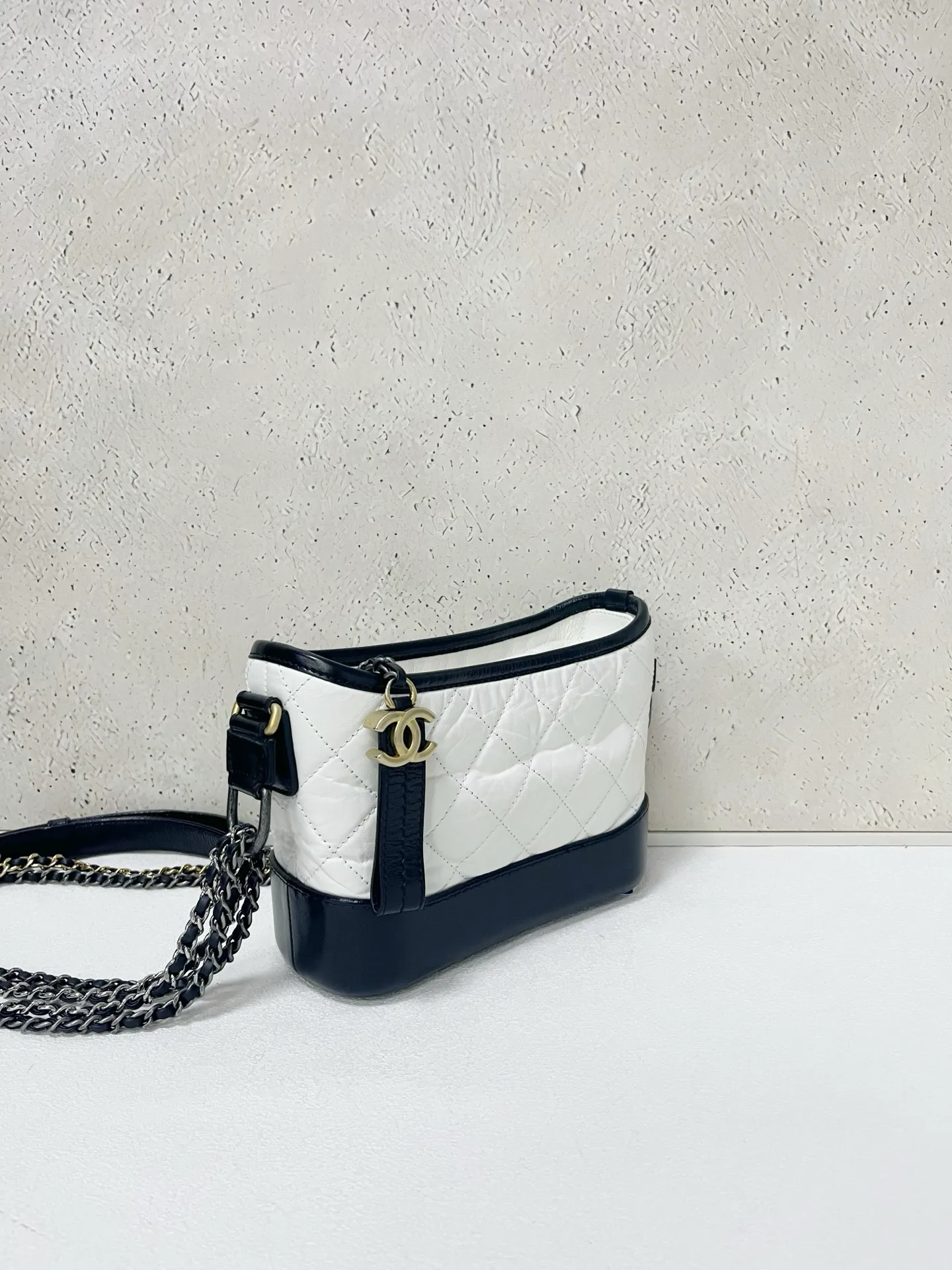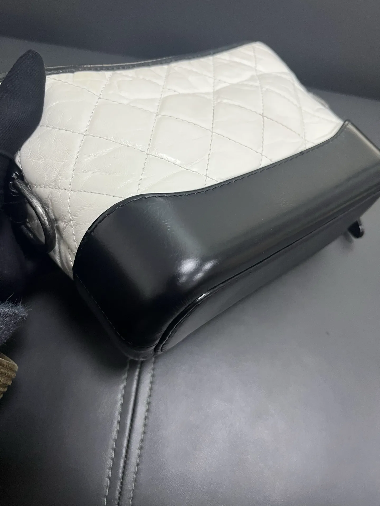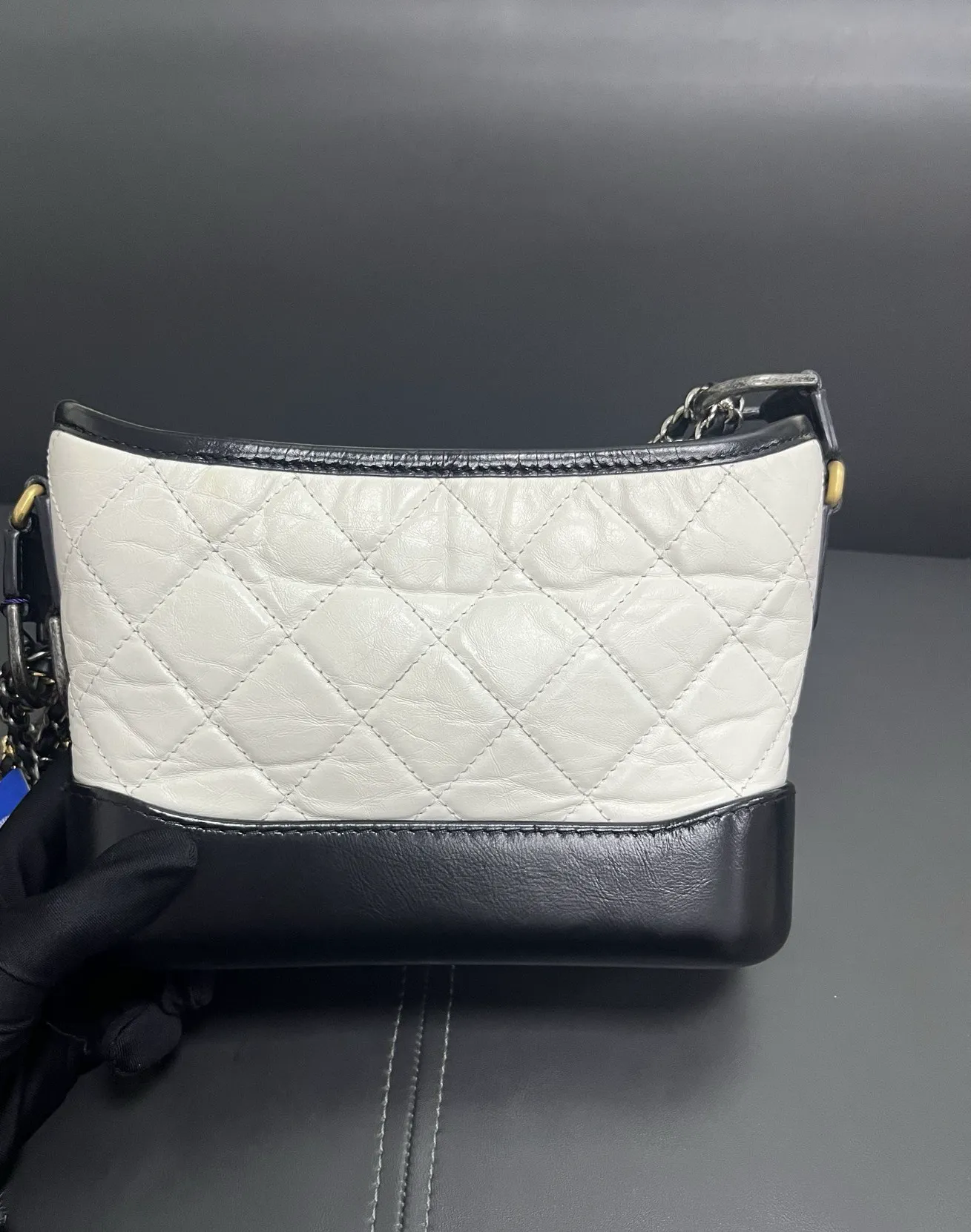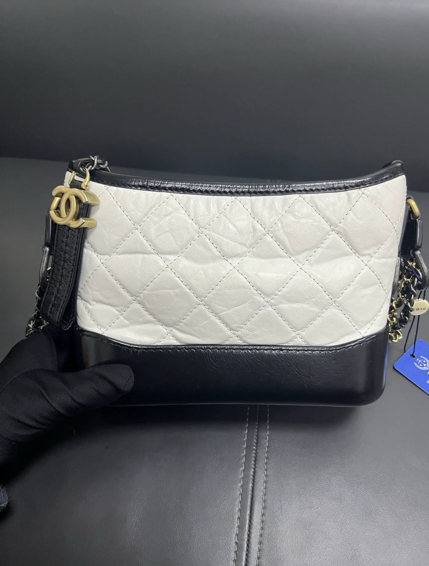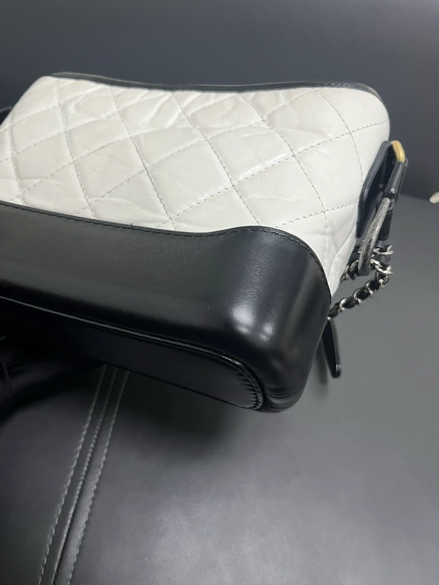 CHANEL Aged Calfskin Quilted Small Gabrielle Hobo in Black and White. This chic shoulder bag is crafted of diamond quilted aged calfskin leather in white, with a sturdy black leather base. The bag features a black leather threaded chain-link shoulder strap, with multiple hardware tones including polished gold, silver, and ruthenium. The top zipper opens to a deep red fabric interior with zipper and patch pockets.