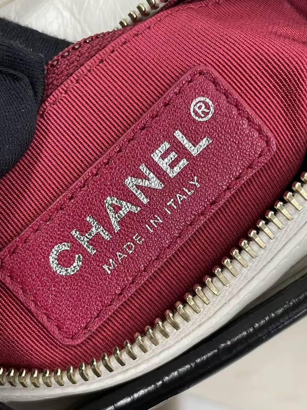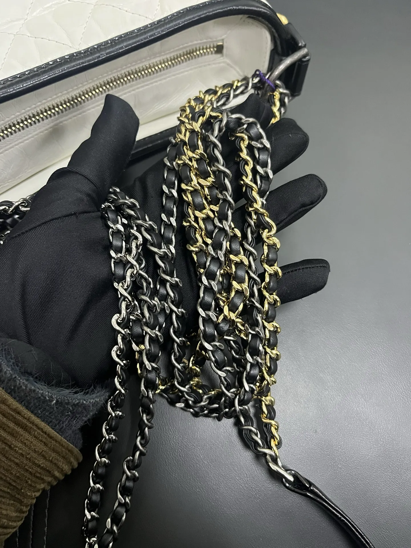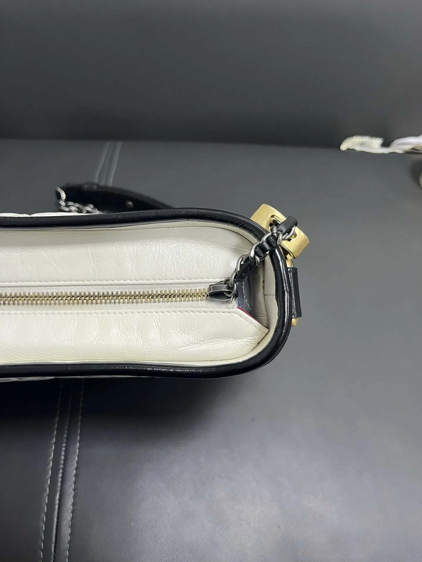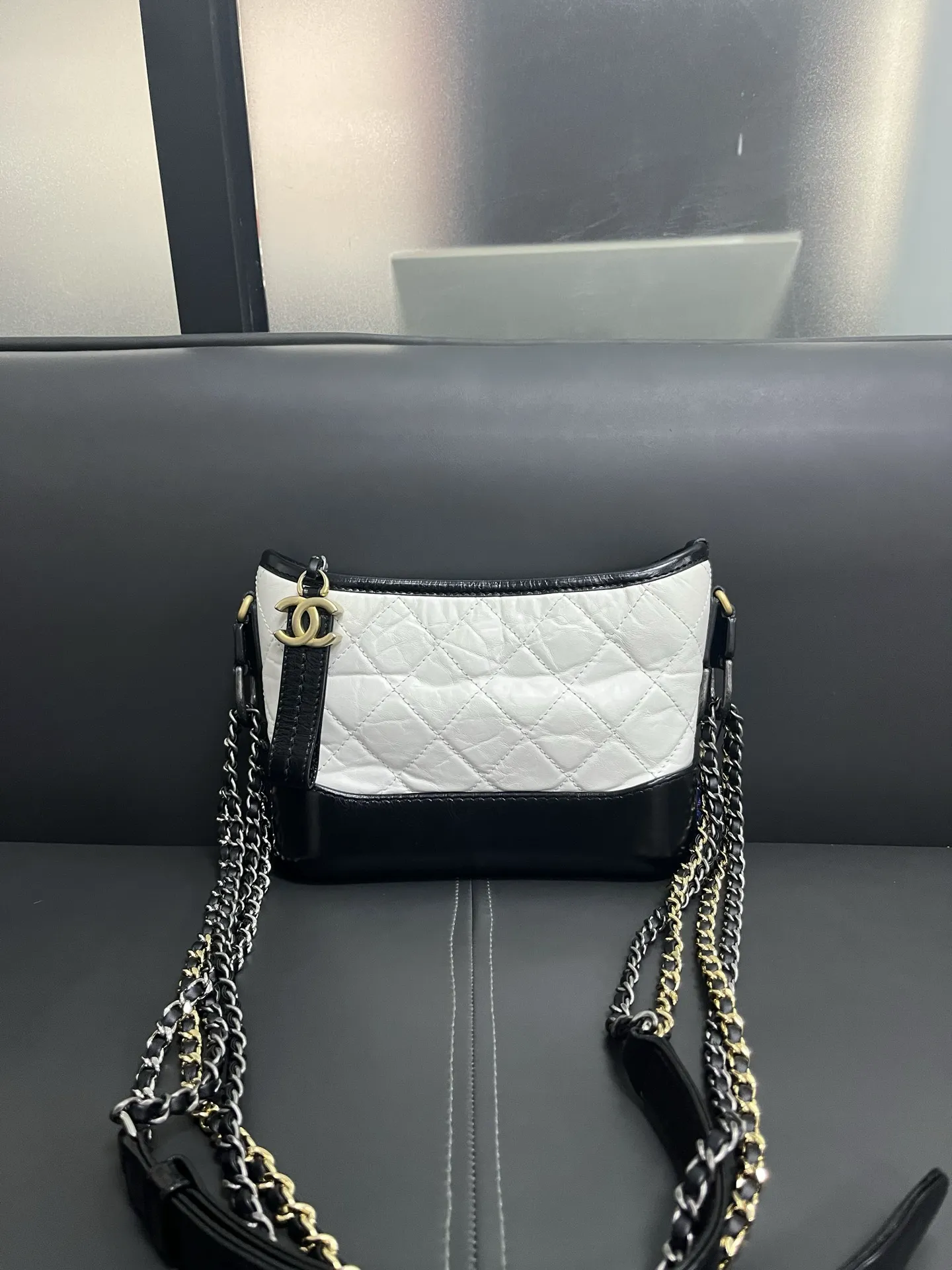 CHANEL Aged Calfskin Quilted Small Gabrielle Hobo in Black and White. This chic shoulder bag is crafted of diamond quilted aged calfskin leather in white, with a sturdy black leather base. The bag features a black leather threaded chain-link shoulder strap, with multiple hardware tones including polished gold, silver, and ruthenium. The top zipper opens to a deep red fabric interior with zipper and patch pockets.
