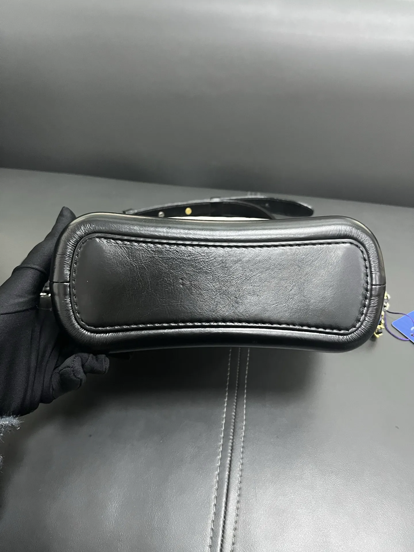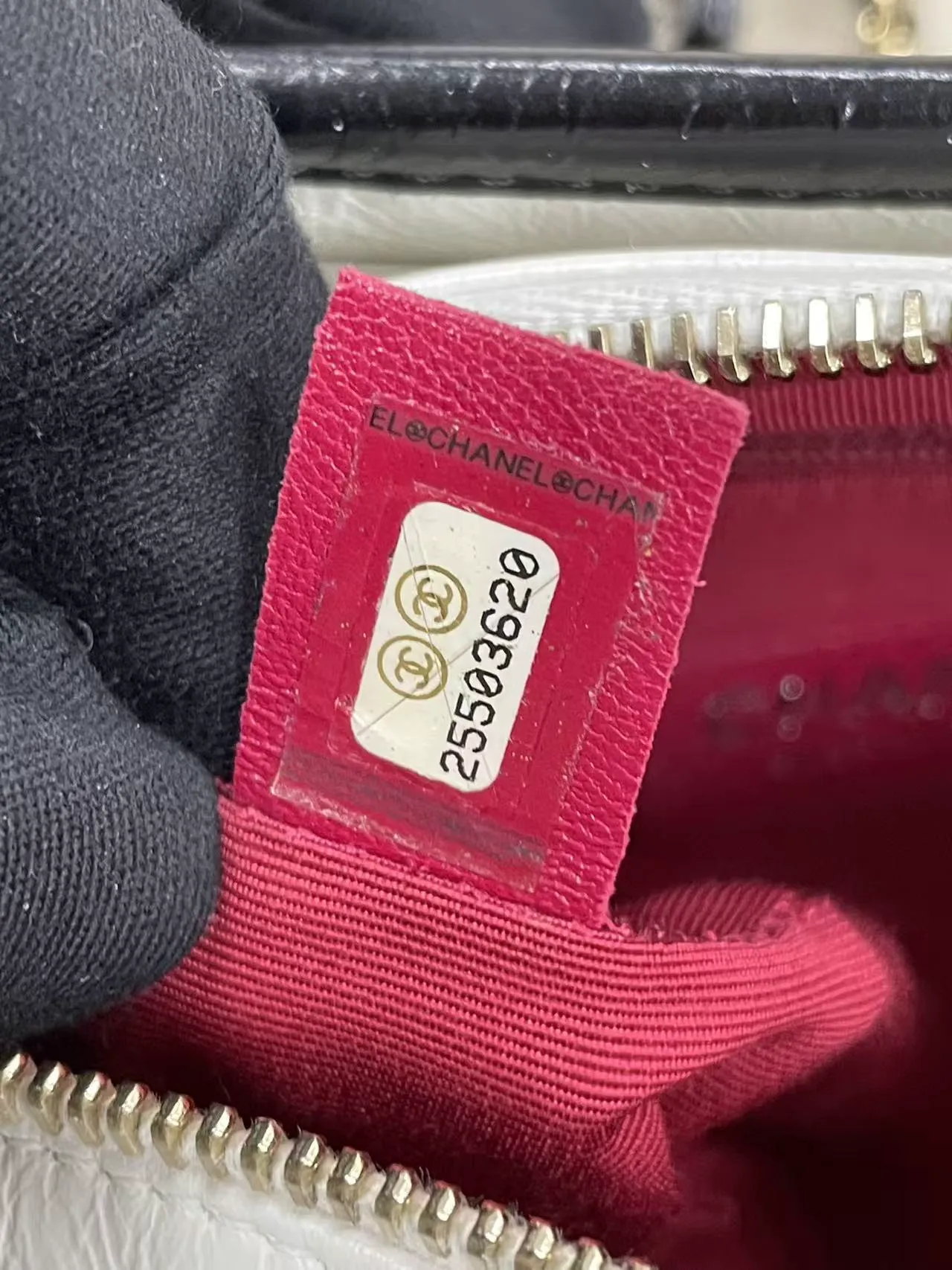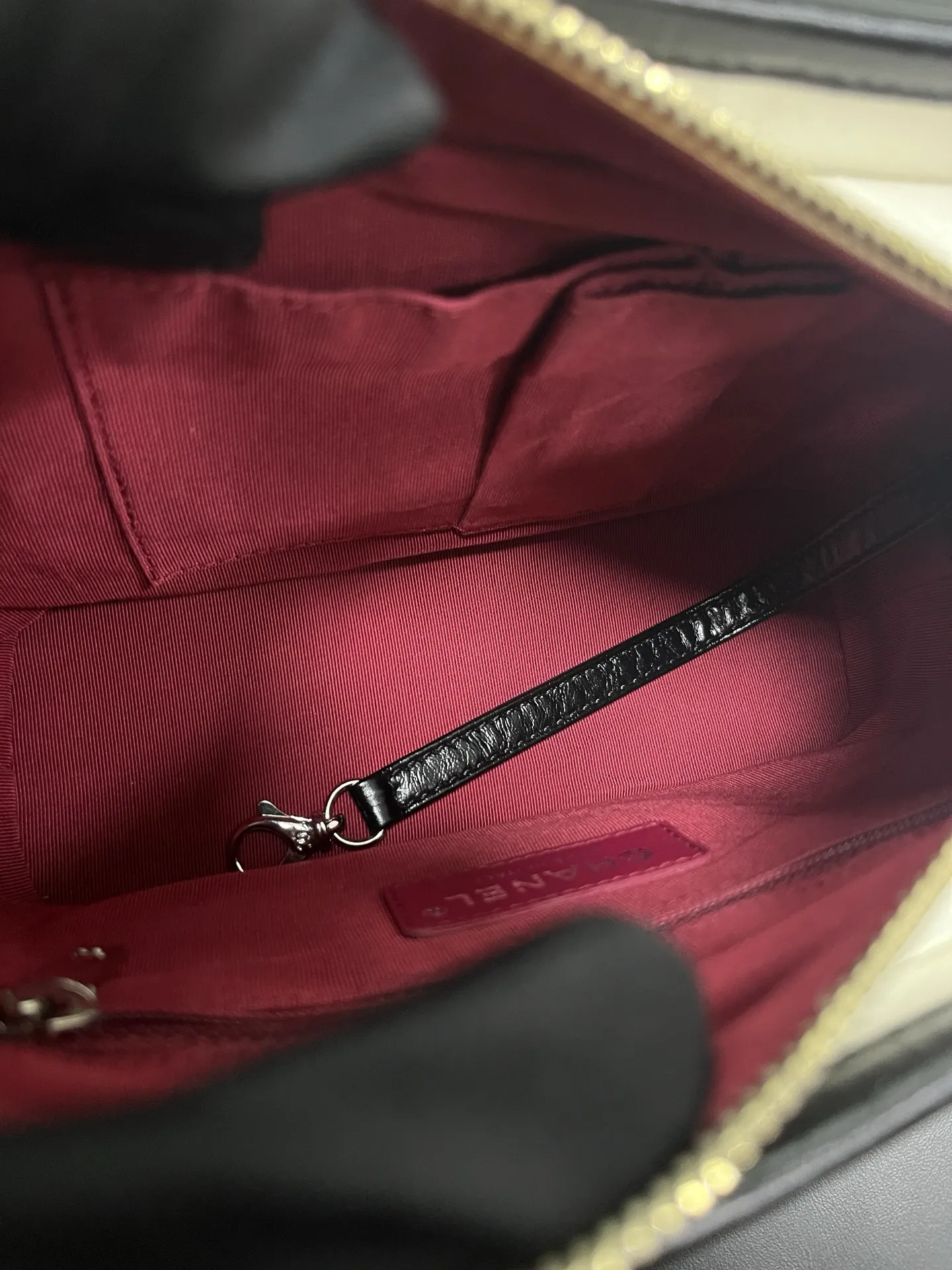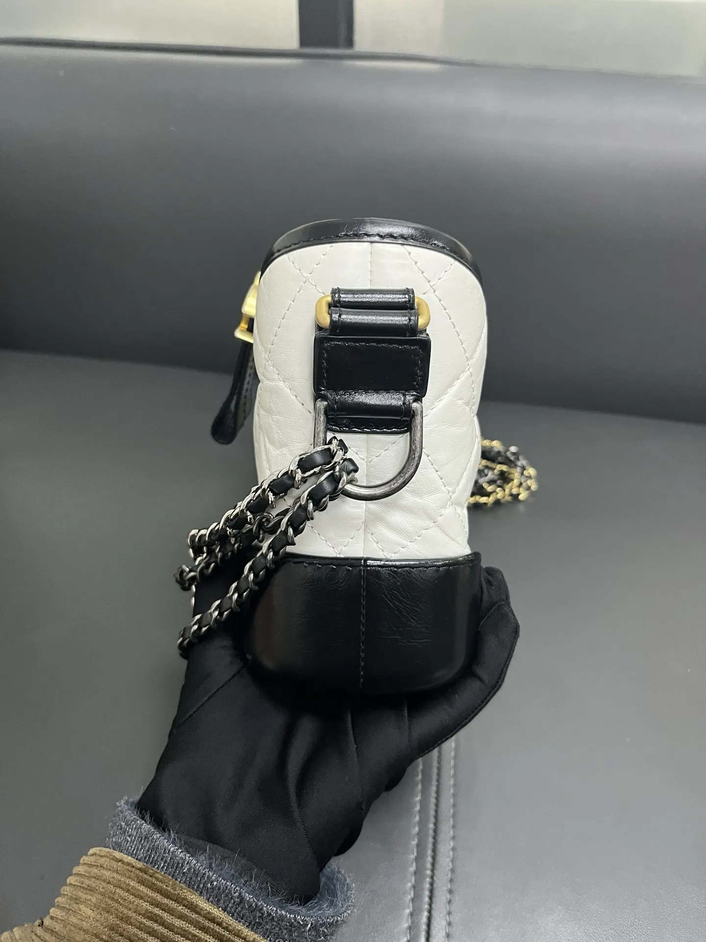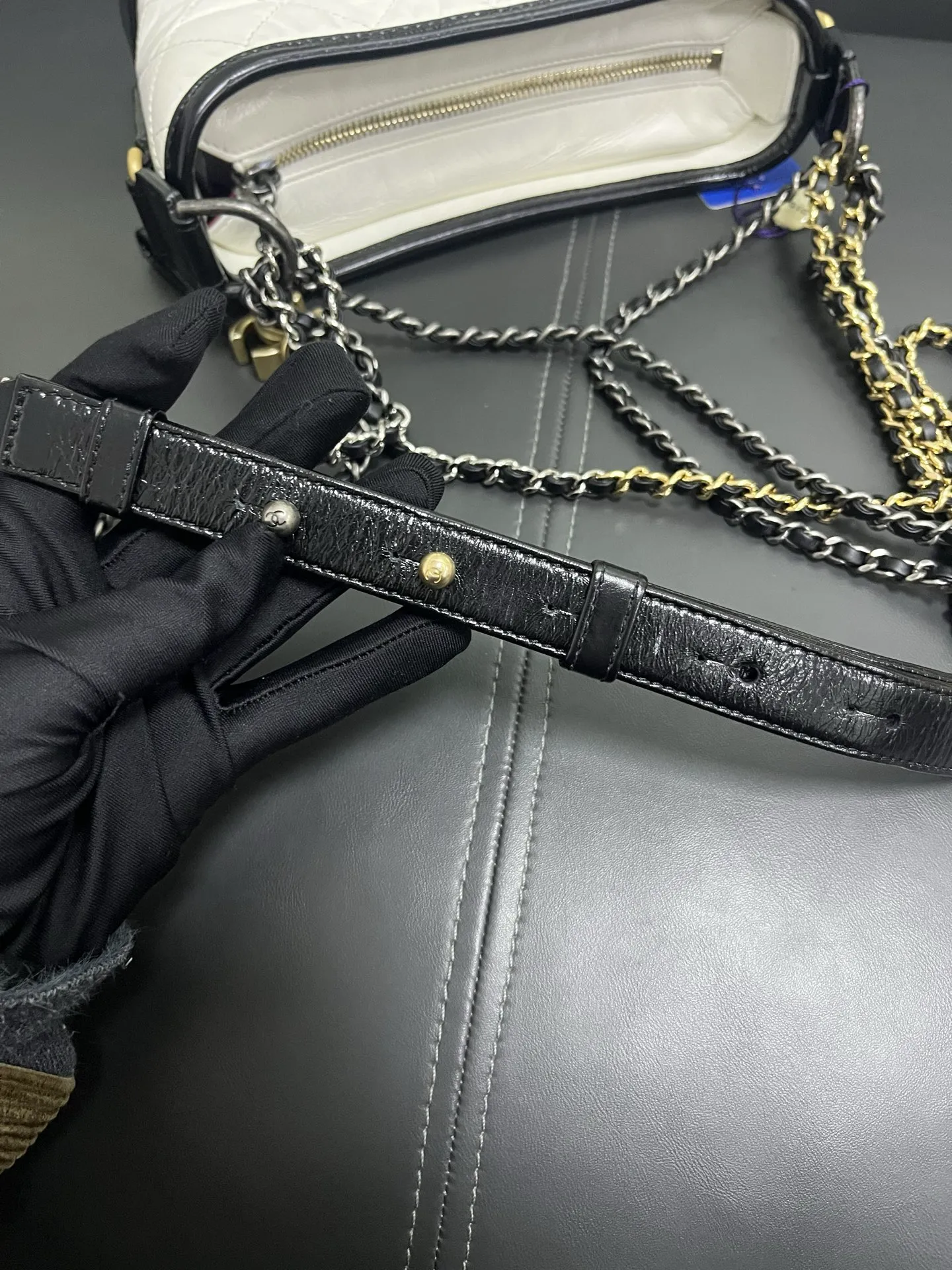 CHANEL Aged Calfskin Quilted Small Gabrielle Hobo in Black and White. This chic shoulder bag is crafted of diamond quilted aged calfskin leather in white, with a sturdy black leather base. The bag features a black leather threaded chain-link shoulder strap, with multiple hardware tones including polished gold, silver, and ruthenium. The top zipper opens to a deep red fabric interior with zipper and patch pockets.