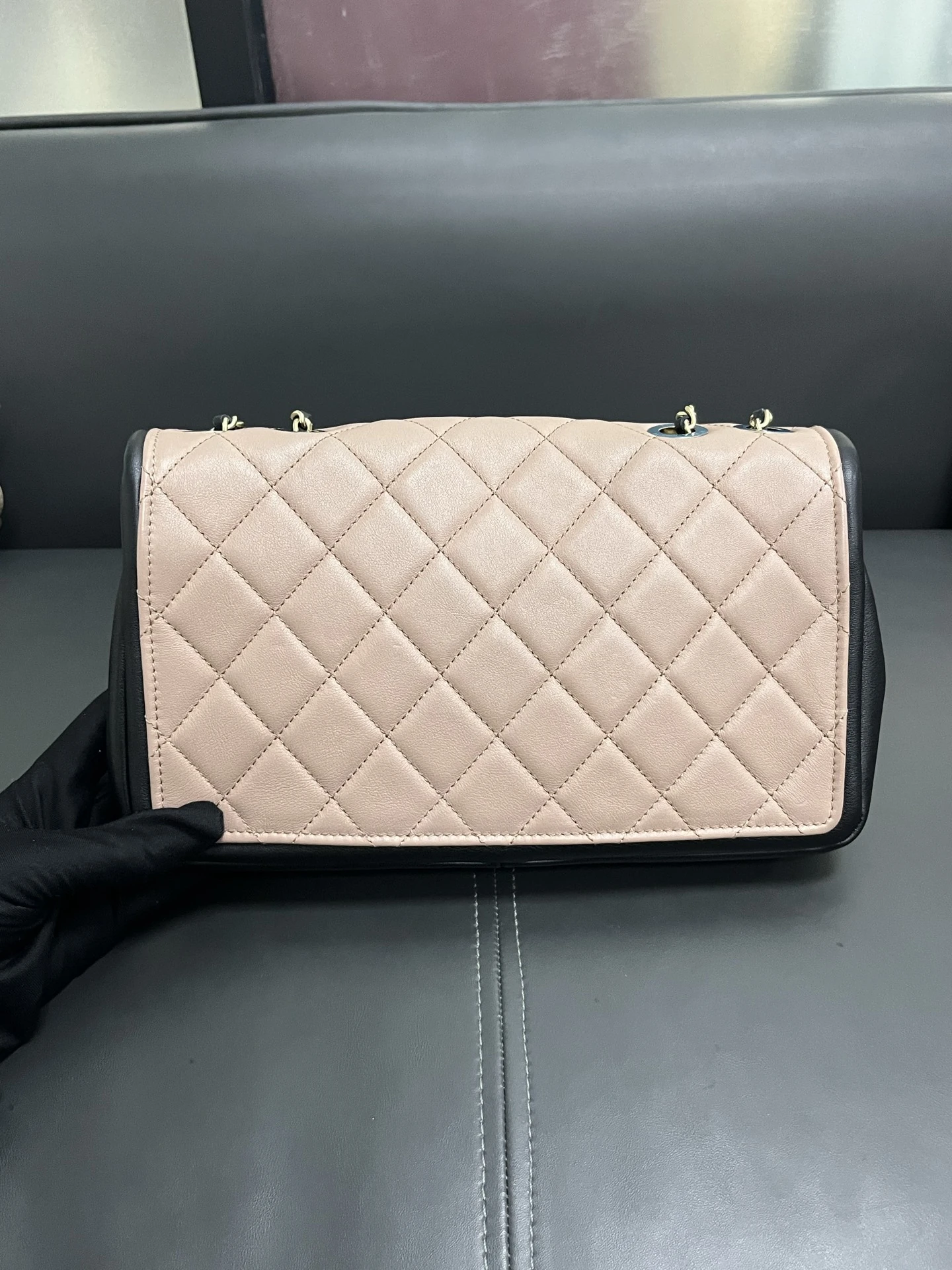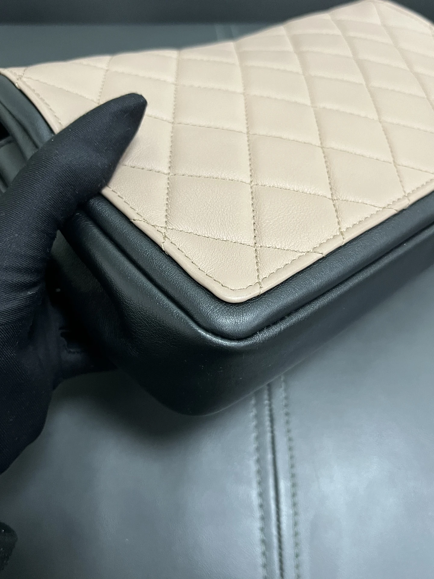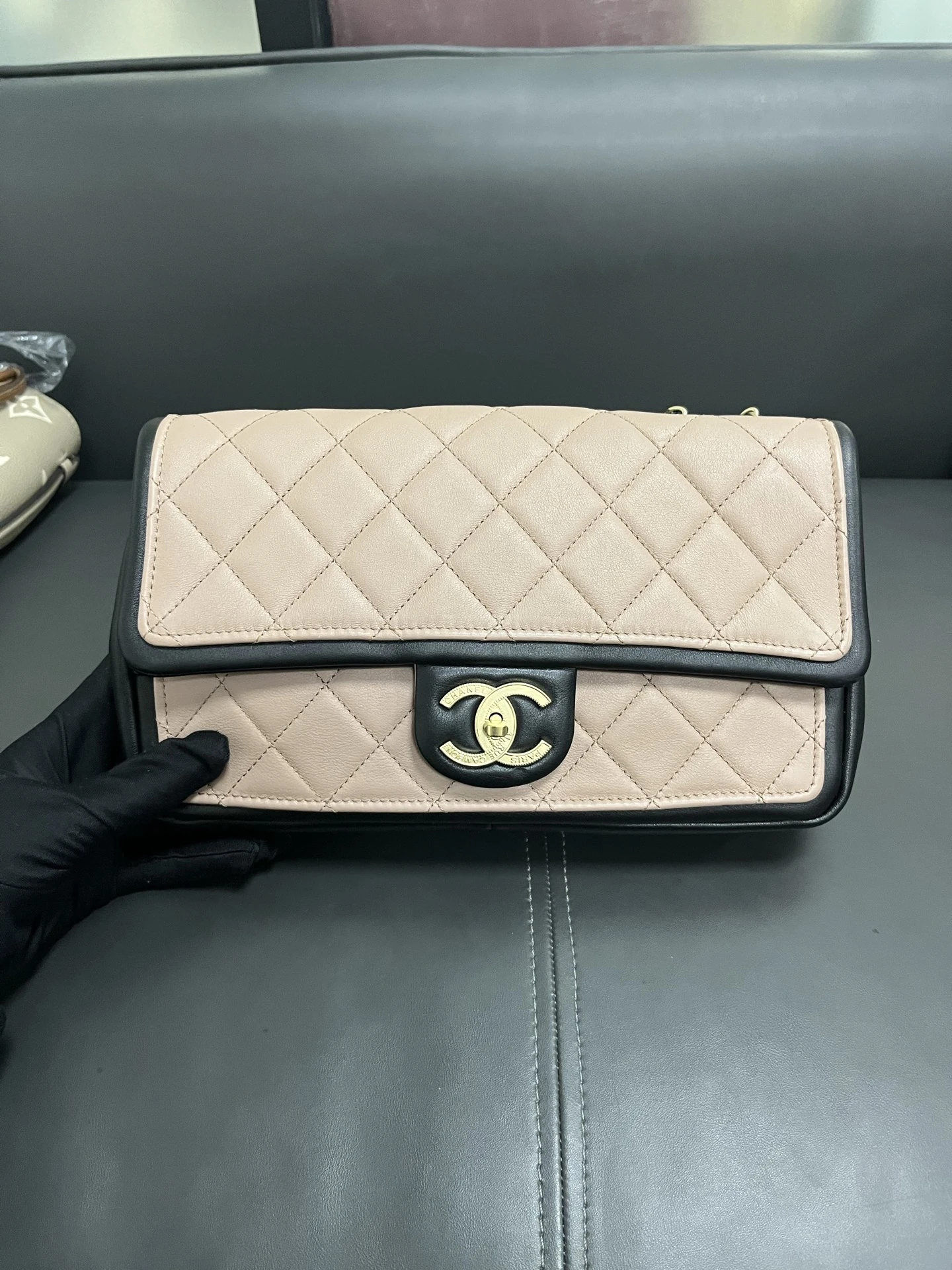 Home/WOMENS/ALL BAGS/CHANEL Graphic Flap Medium Bag Beige Lambskin Leather With Black Trim