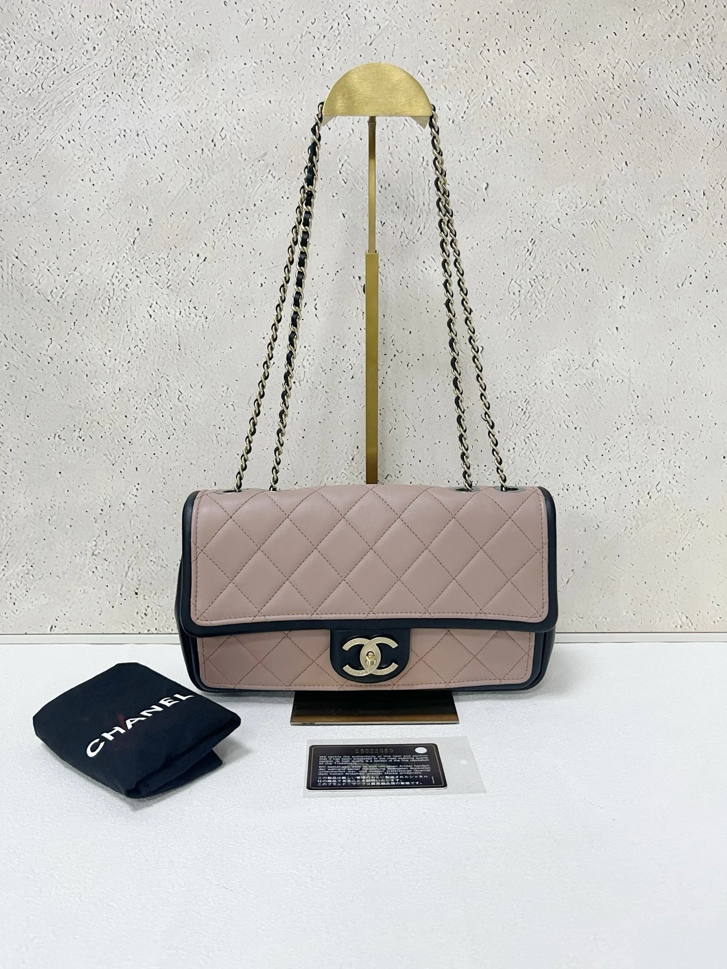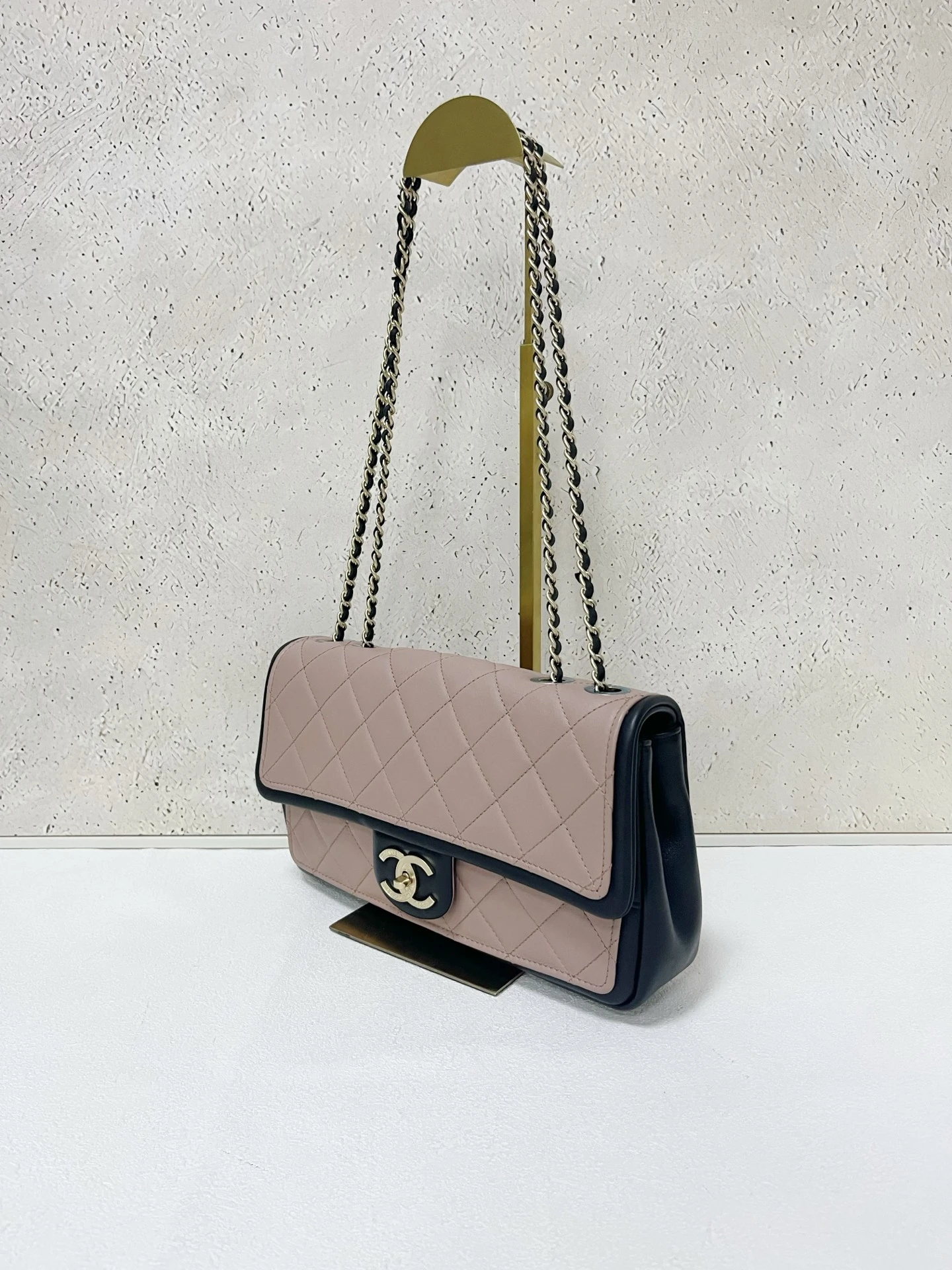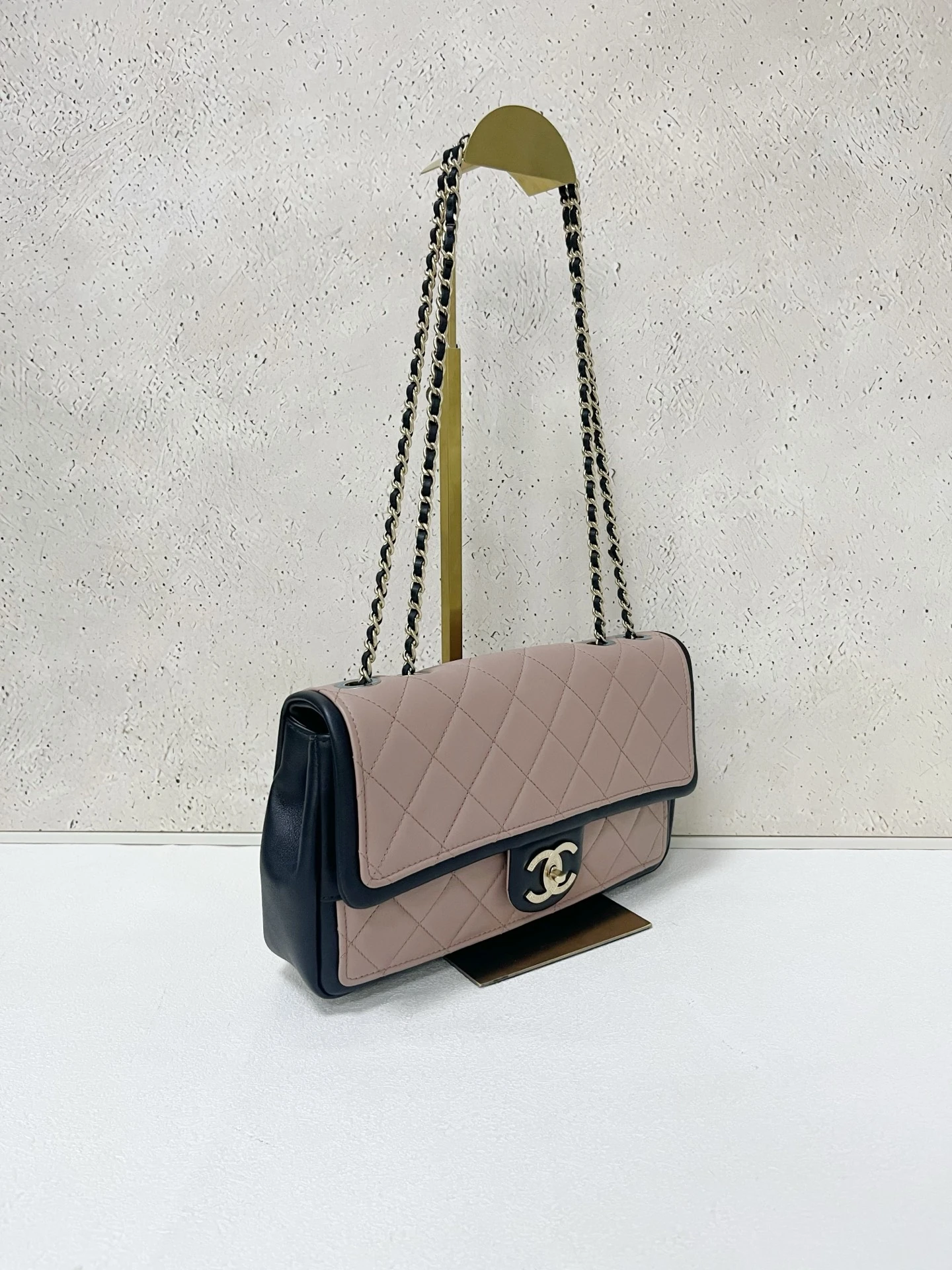 CHANEL medium graphic flap bag in diamond-quilted beige lambskin leather with black trim. Featuring gold-toned hardware, leather-threaded gold chain shoulder strap, and embossed CC turn-lock closure. This opens to a black textile interior with a zipper pocket. Double chain drop 24.5cm.The most iconic Chanel bag — a timeless piece!