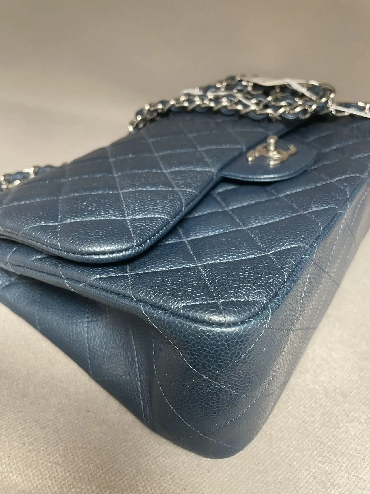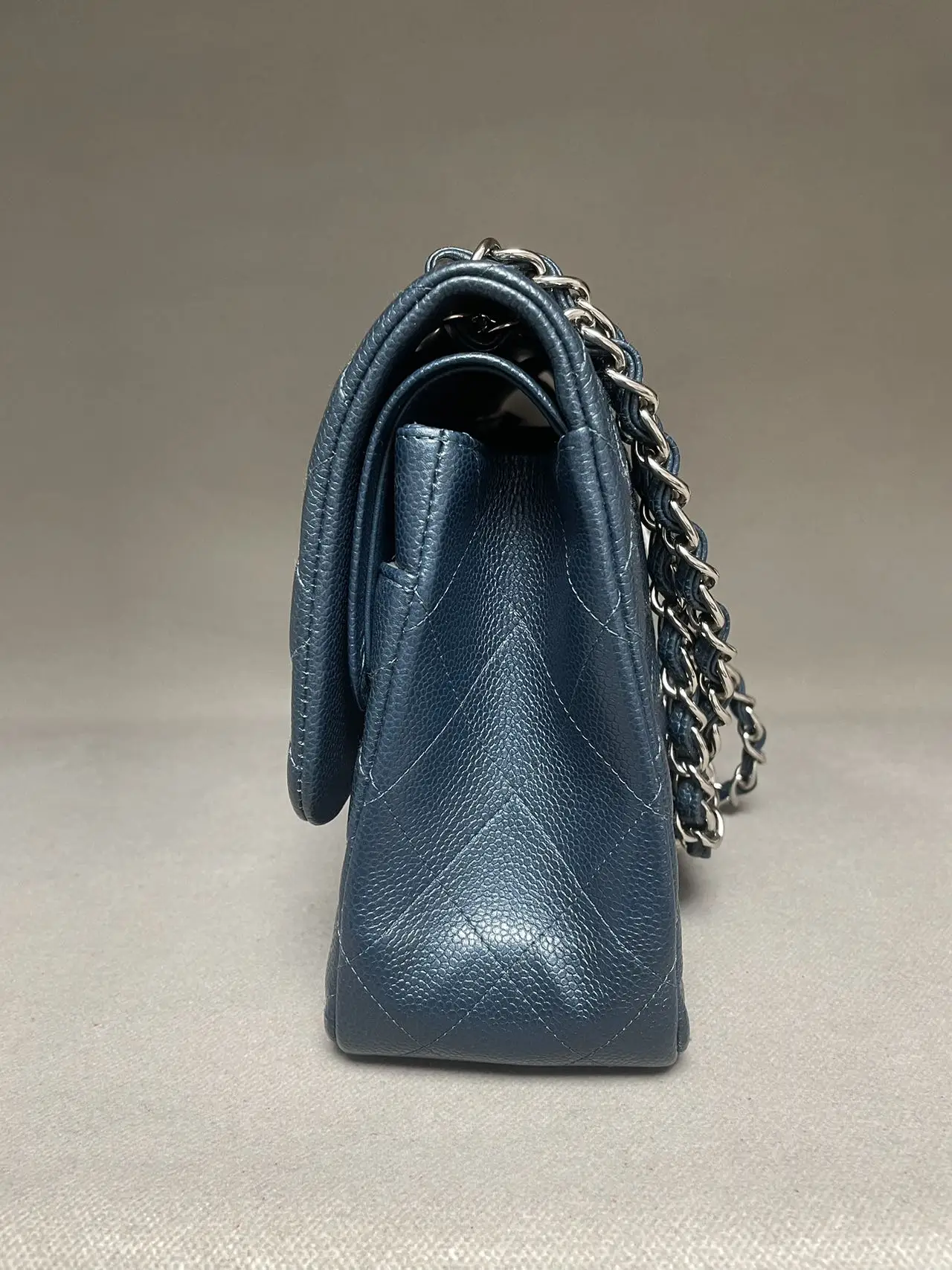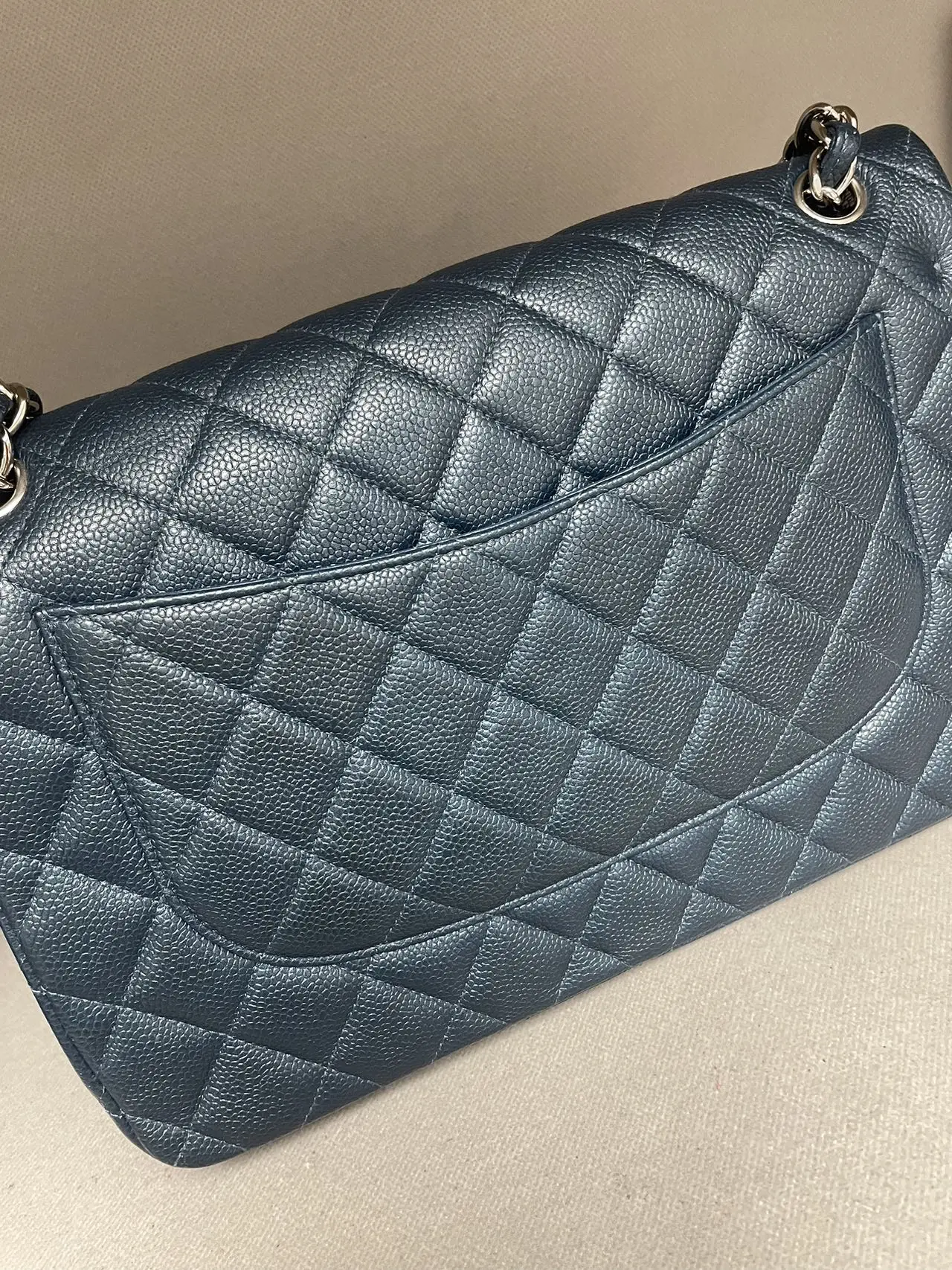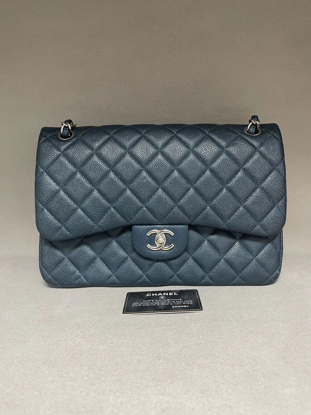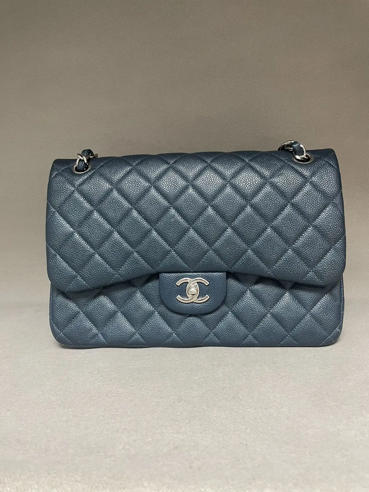 The CHANEL Jumbo Classic Double Flap Bag in blue caviar leather with silver-tone hardware is the ultimate statement of spacious elegance, combining the iconic dual-flap structure, durable diamond-quilted texture, and cool-toned hardware for a bold and timeless presence.