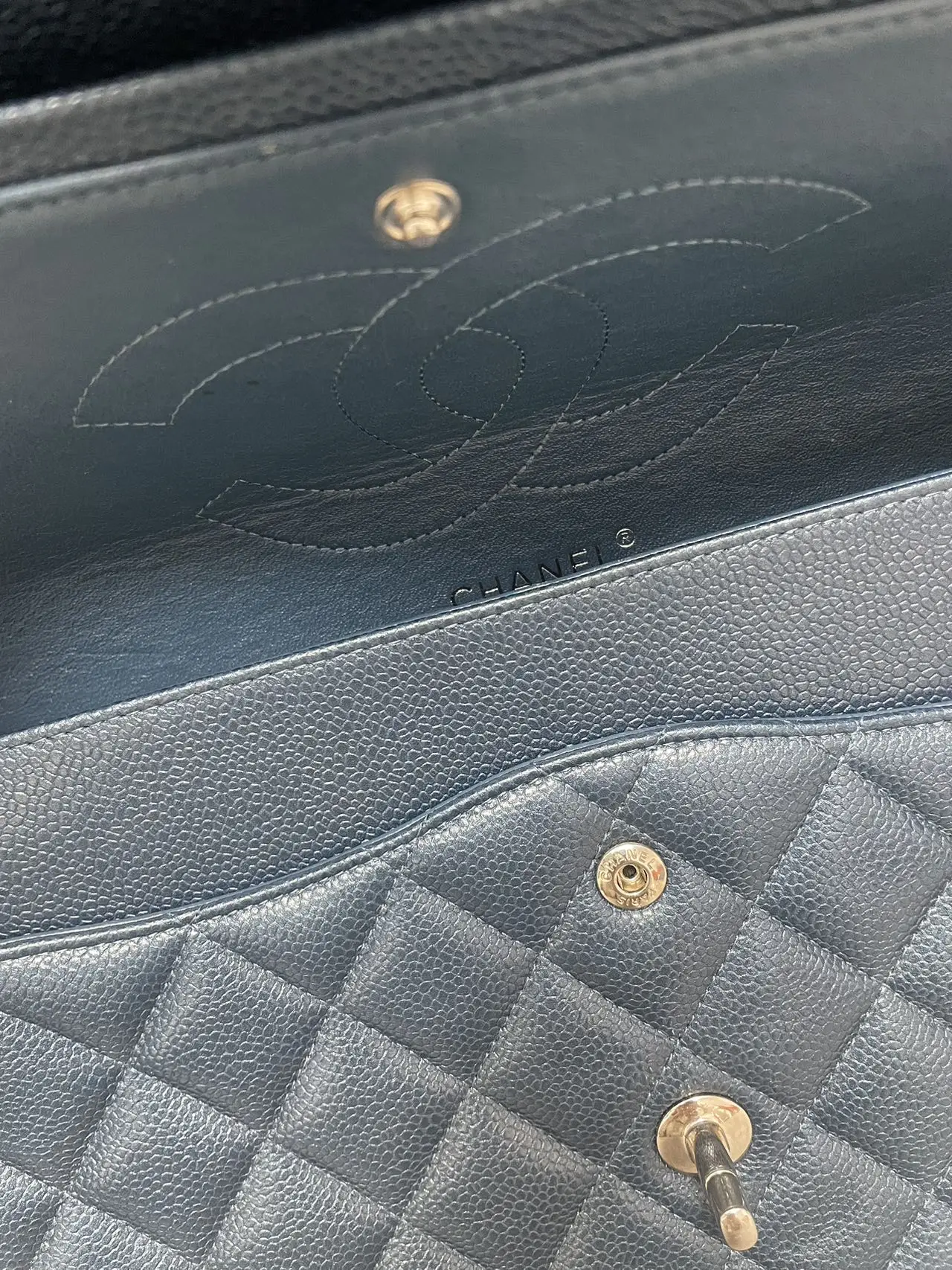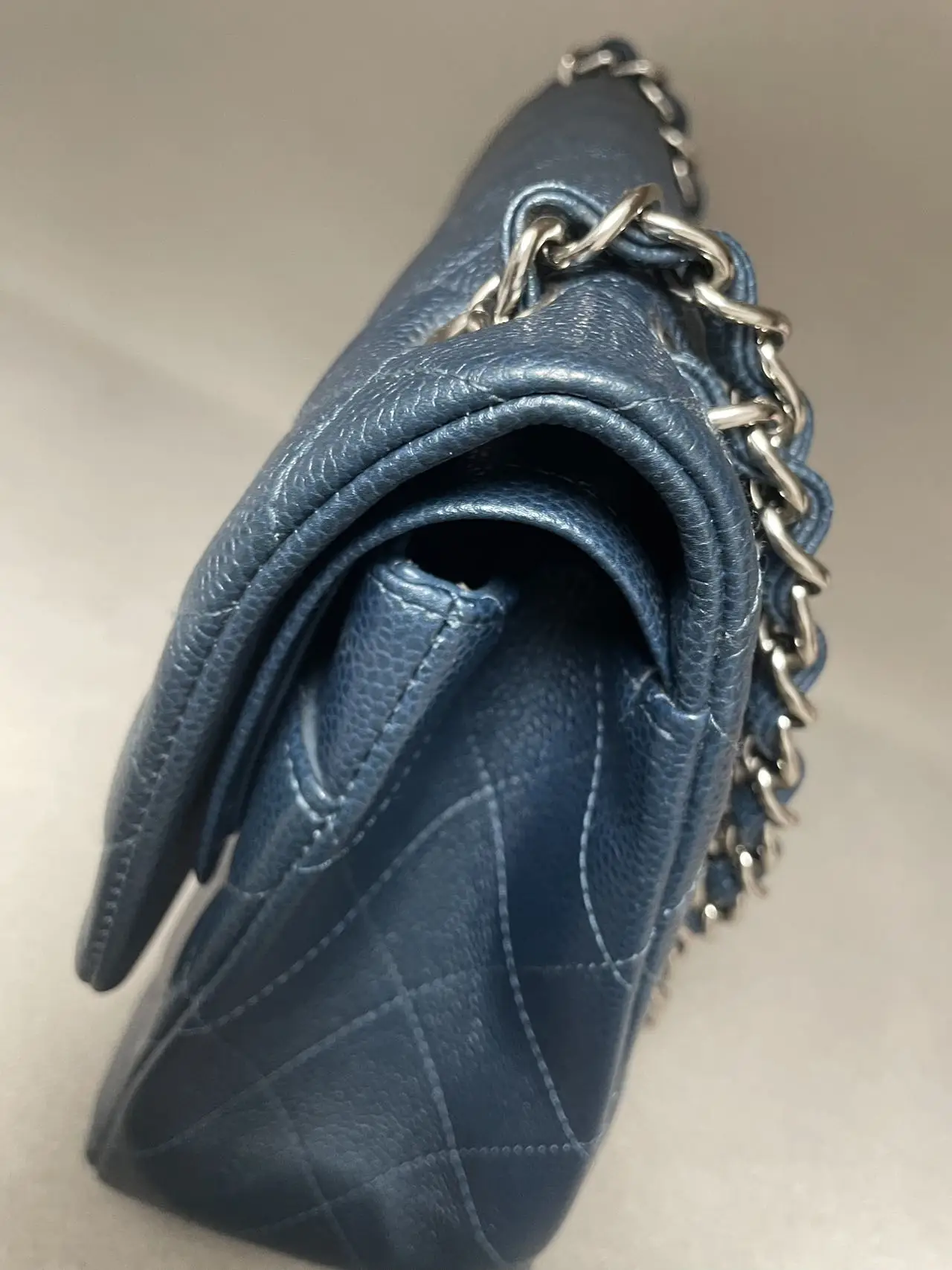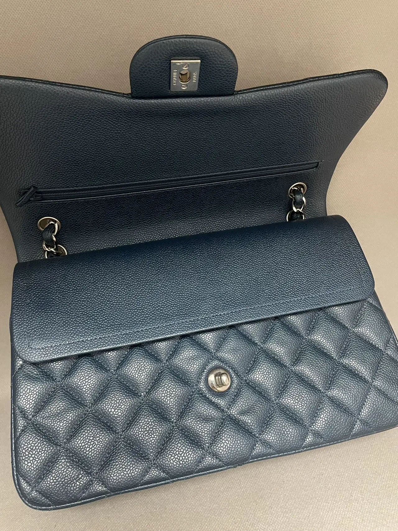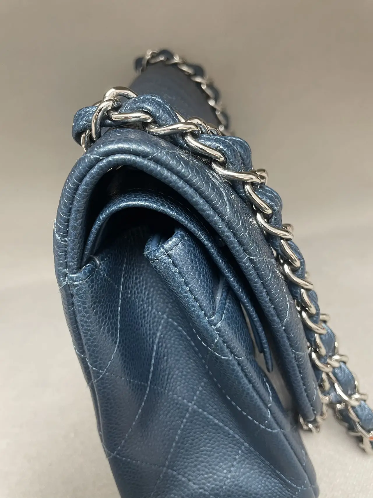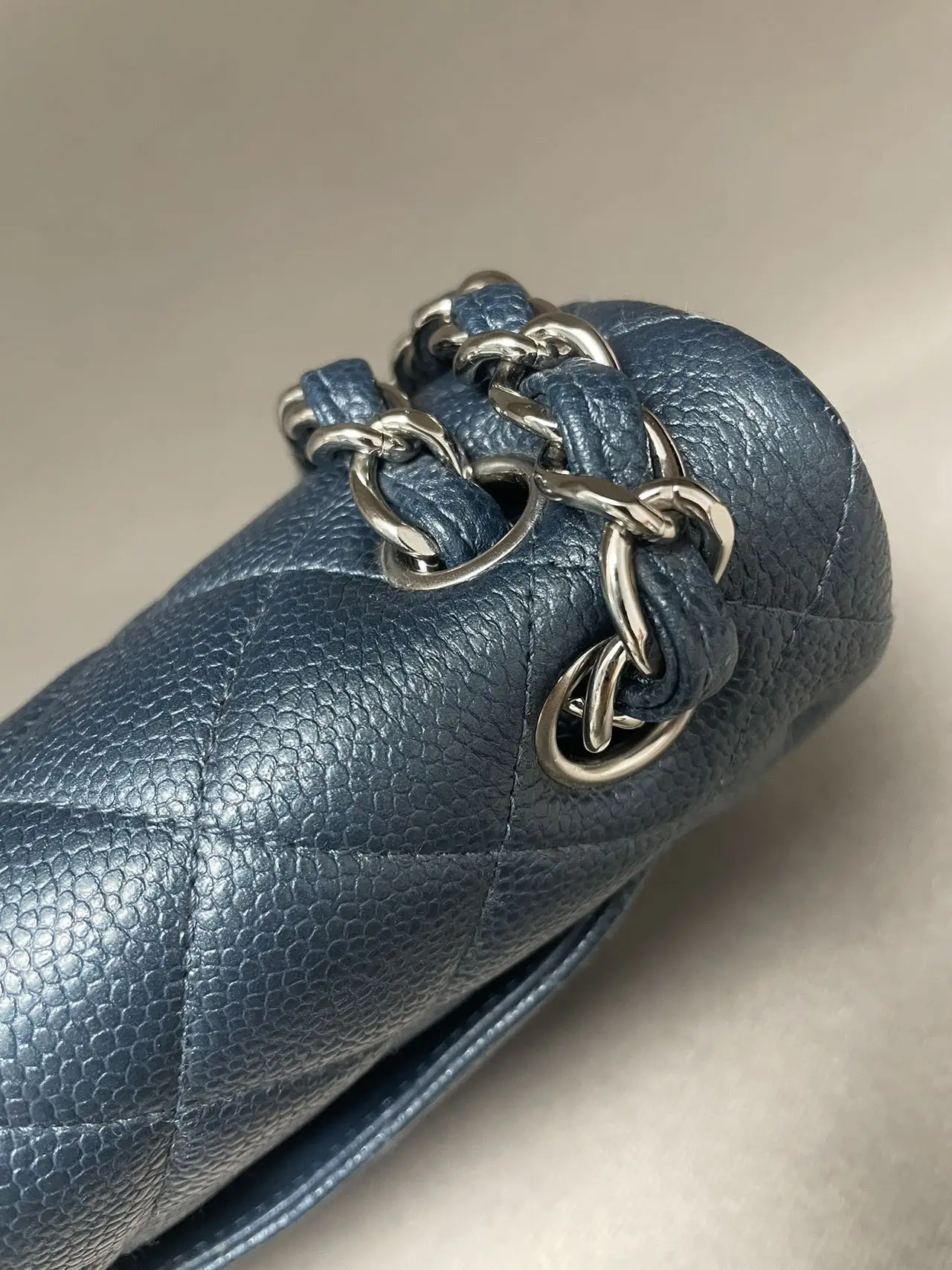 The CHANEL Jumbo Classic Double Flap Bag in blue caviar leather with silver-tone hardware is the ultimate statement of spacious elegance, combining the iconic dual-flap structure, durable diamond-quilted texture, and cool-toned hardware for a bold and timeless presence.