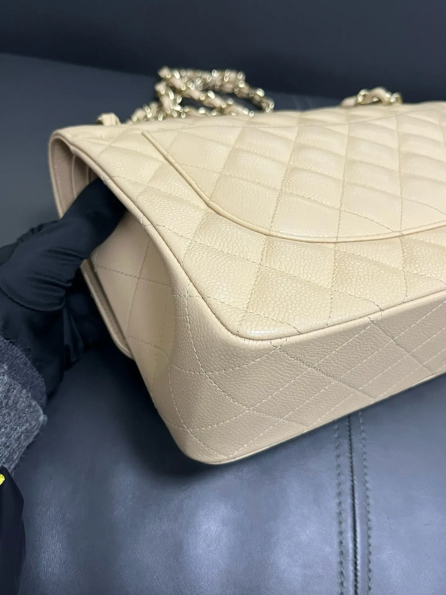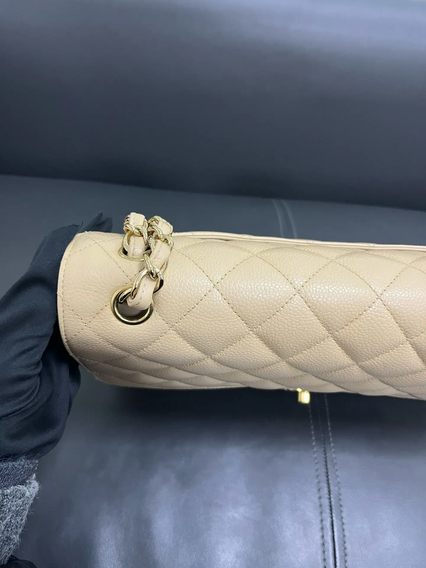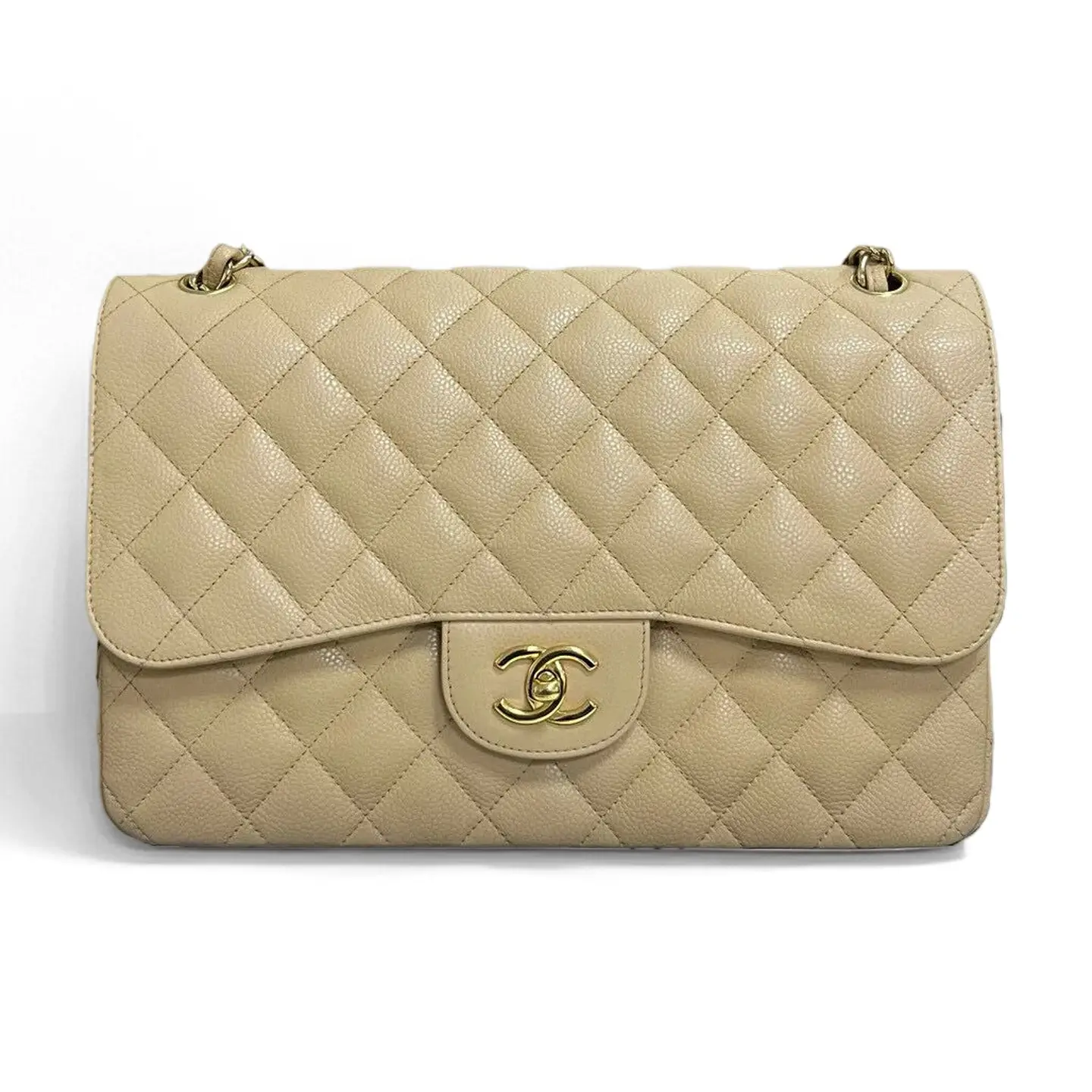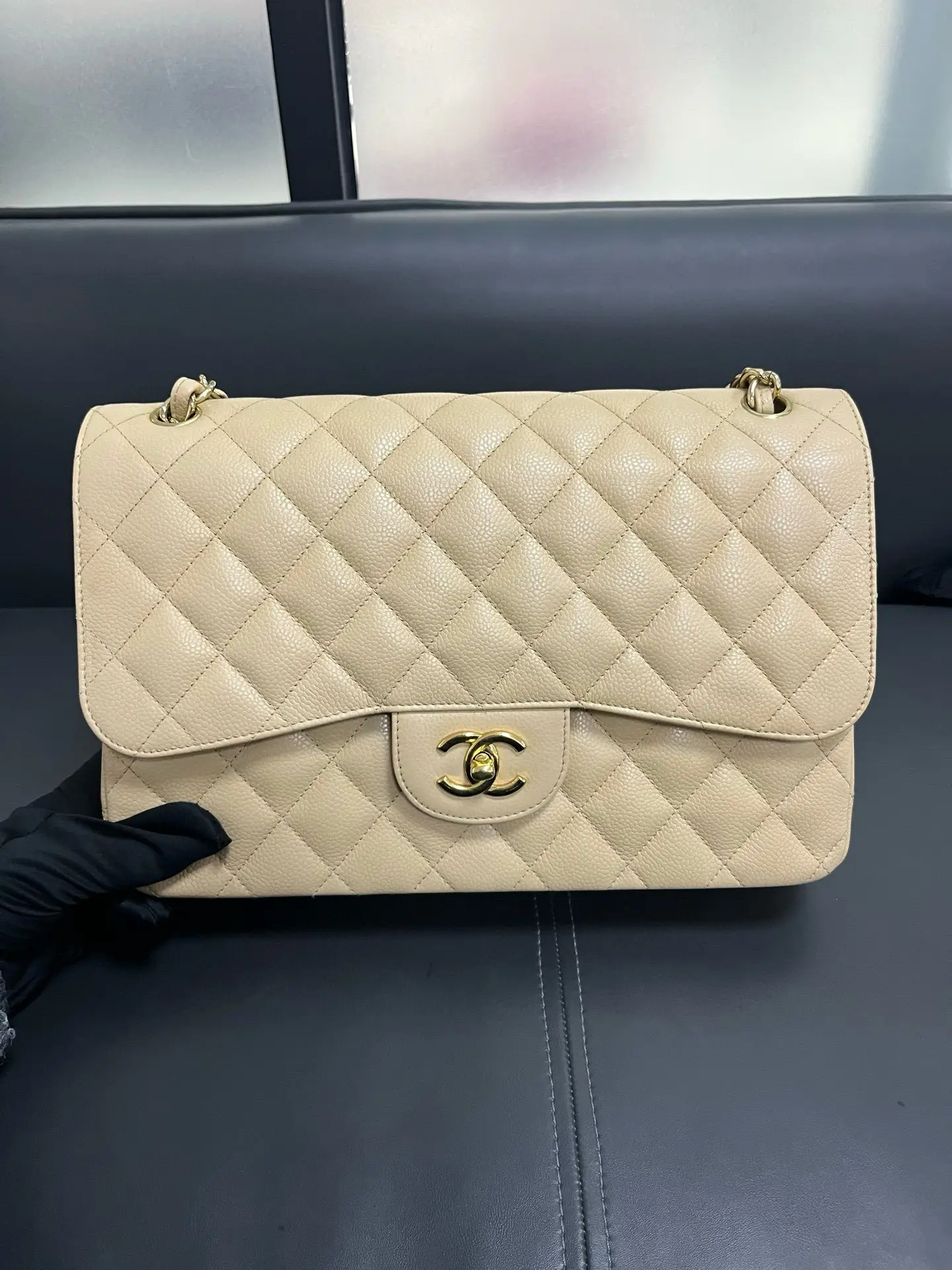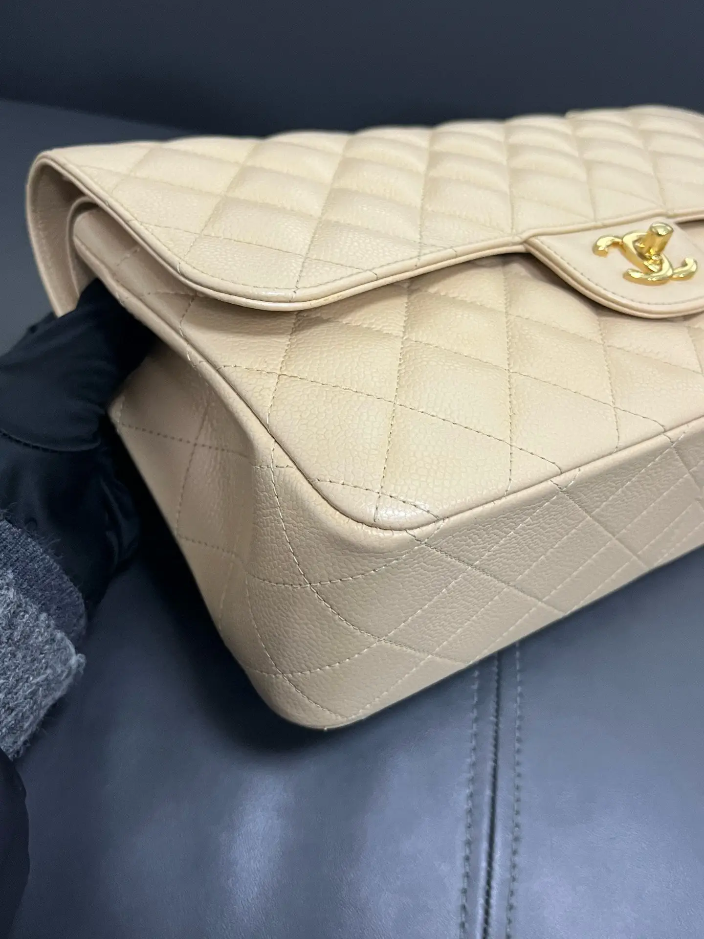 The CHANEL Jumbo Classic Flap Bag in beige caviar leather with gold-tone hardware is the ultimate statement of timeless sophistication, defined by its generously sized yet elegant silhouette, durable diamond-quilted texture, and the warm contrast of its gleaming interlocking CC turn-lock, offering unparalleled presence and versatility.