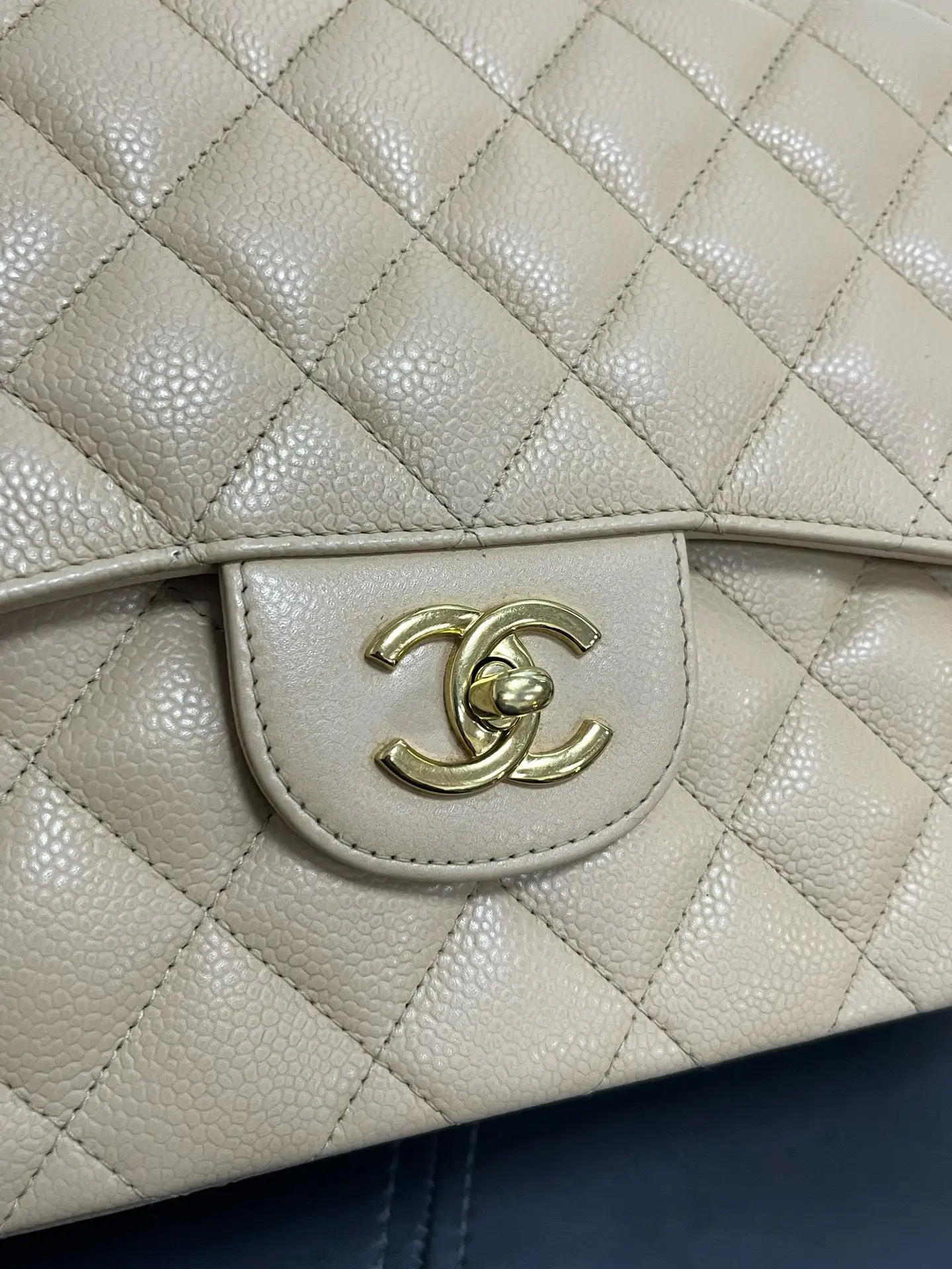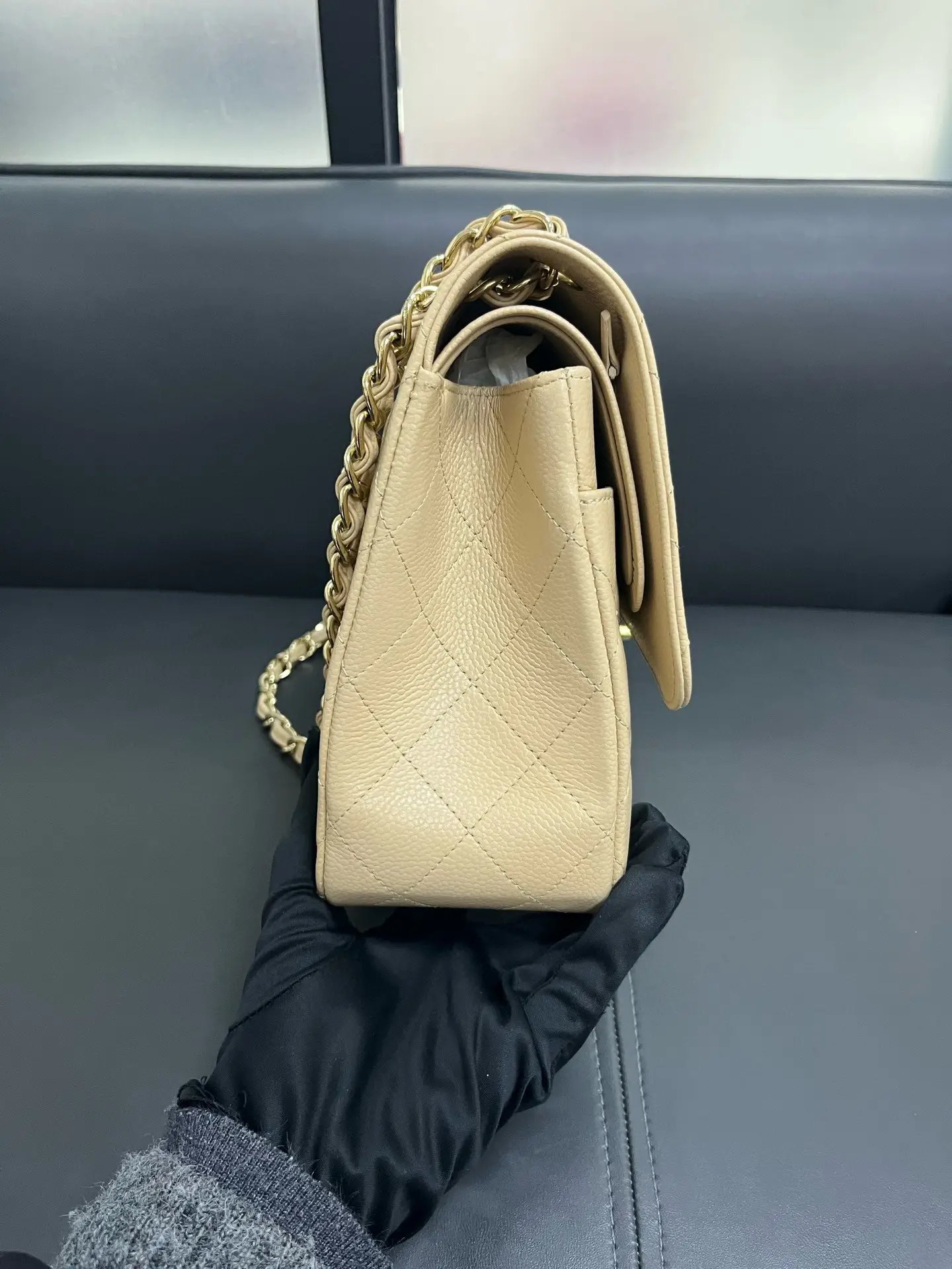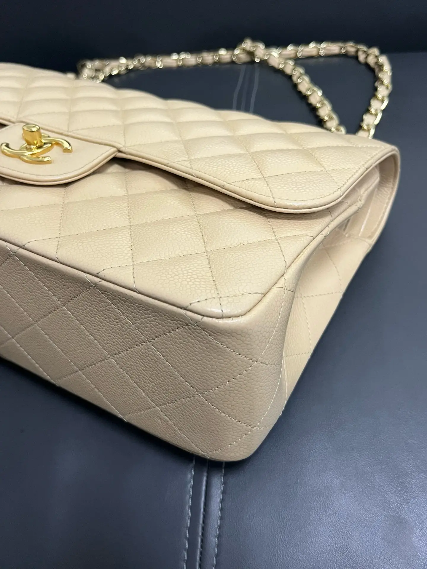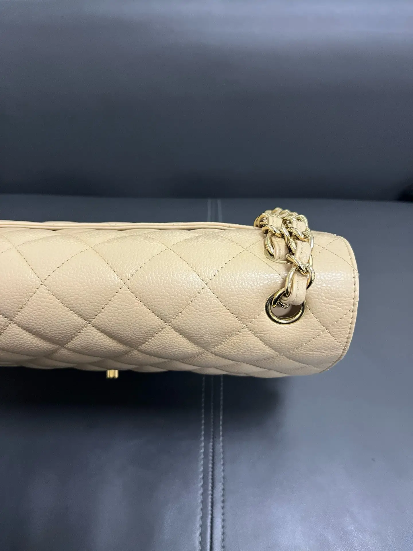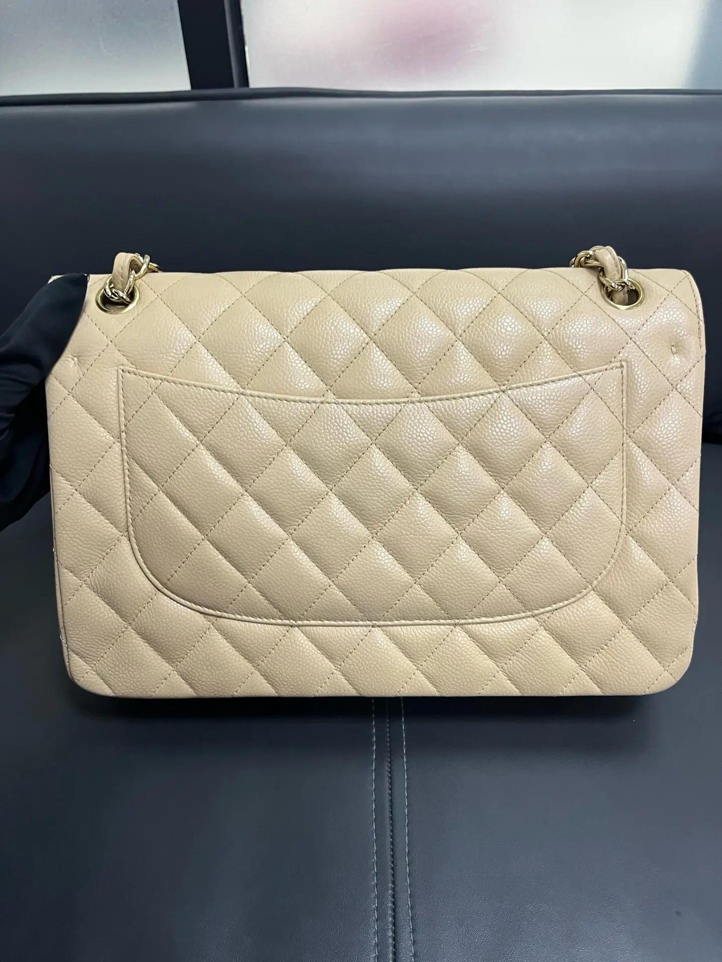 The CHANEL Jumbo Classic Flap Bag in beige caviar leather with gold-tone hardware is the ultimate statement of timeless sophistication, defined by its generously sized yet elegant silhouette, durable diamond-quilted texture, and the warm contrast of its gleaming interlocking CC turn-lock, offering unparalleled presence and versatility.