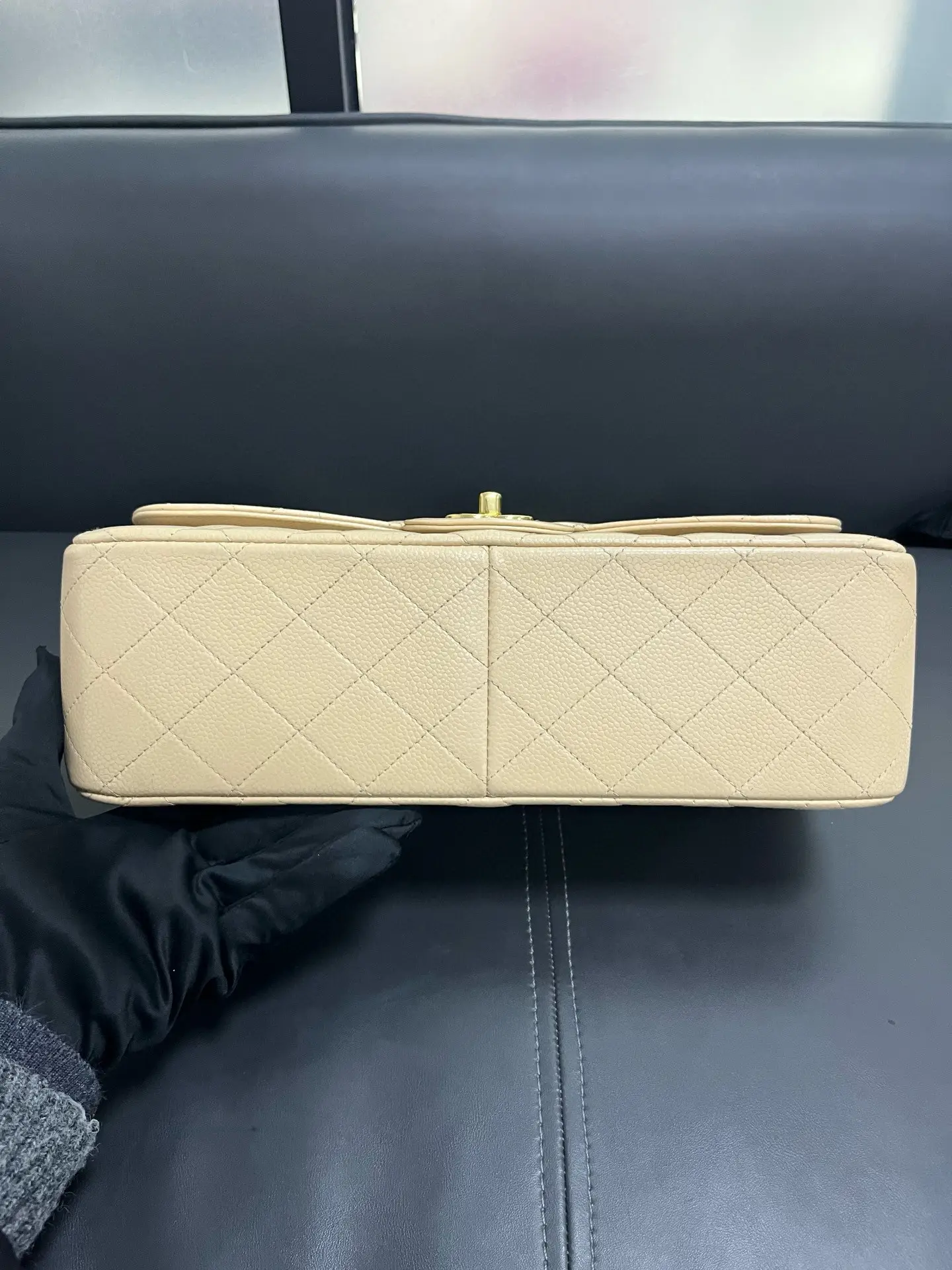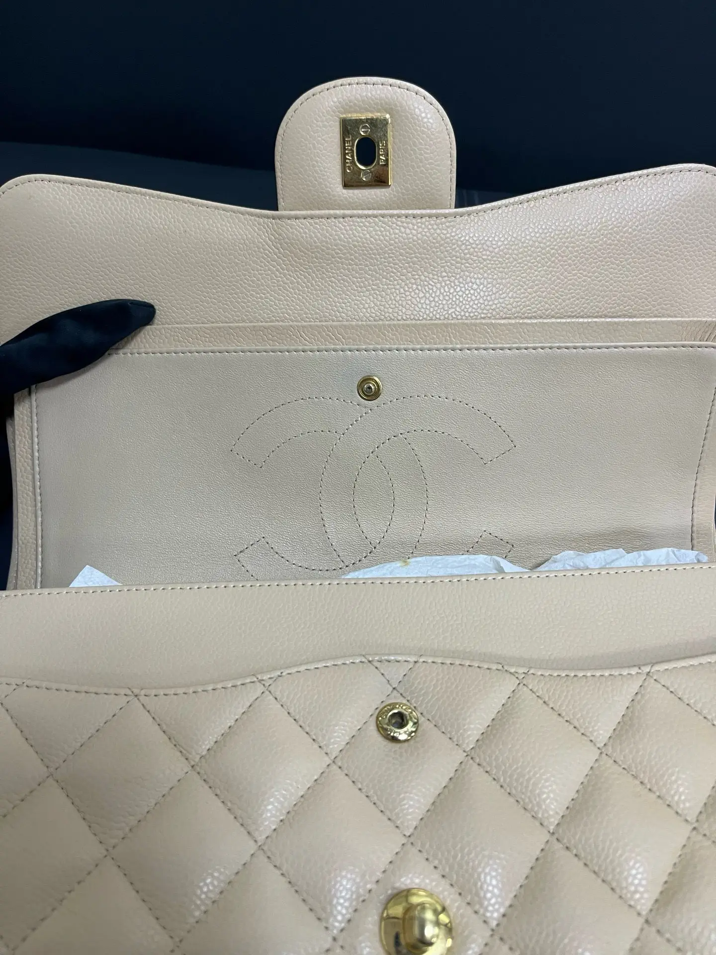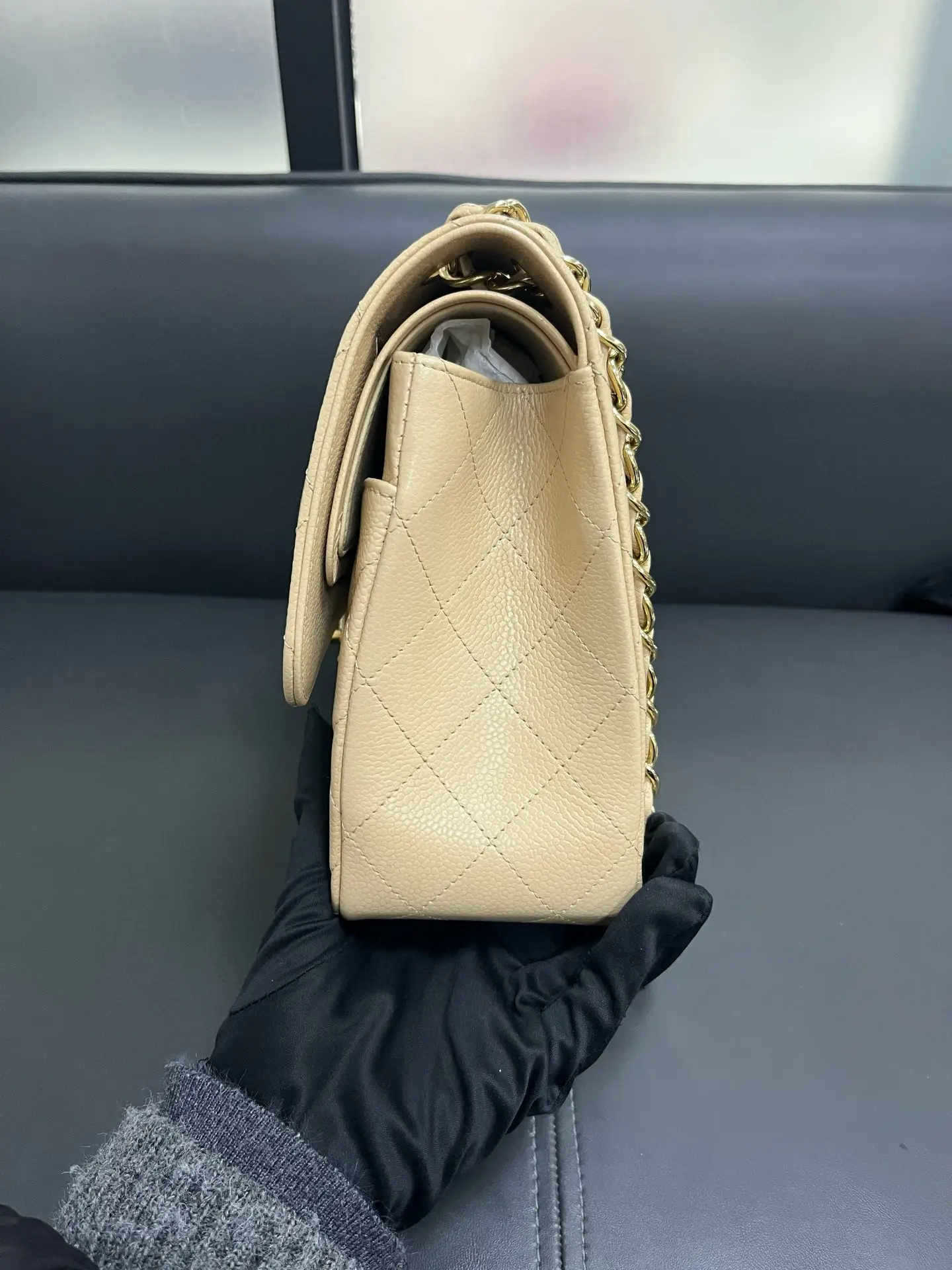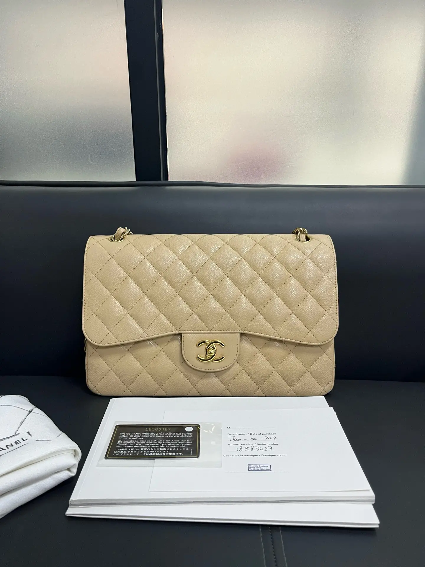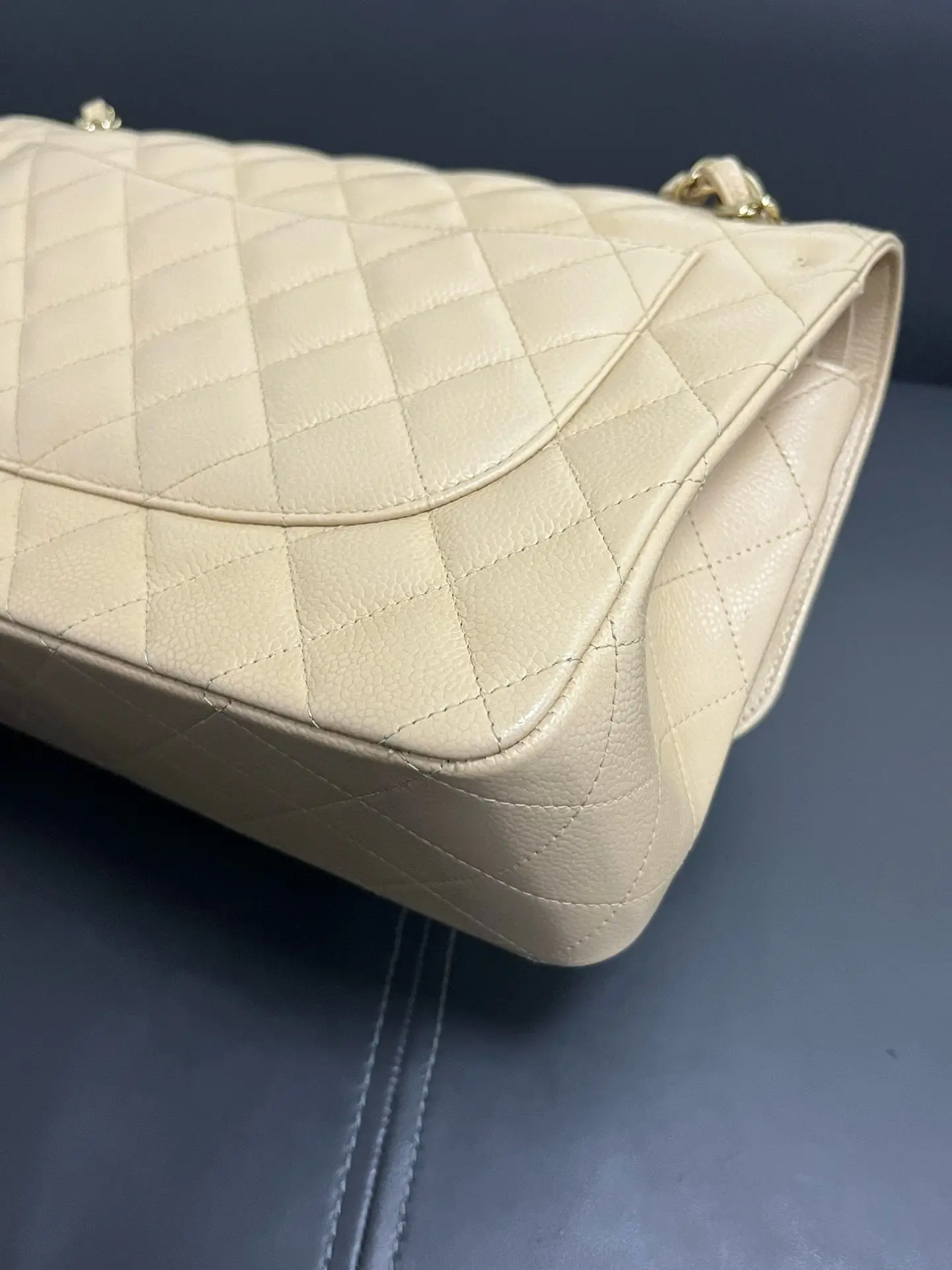 The CHANEL Jumbo Classic Flap Bag in beige caviar leather with gold-tone hardware is the ultimate statement of timeless sophistication, defined by its generously sized yet elegant silhouette, durable diamond-quilted texture, and the warm contrast of its gleaming interlocking CC turn-lock, offering unparalleled presence and versatility.