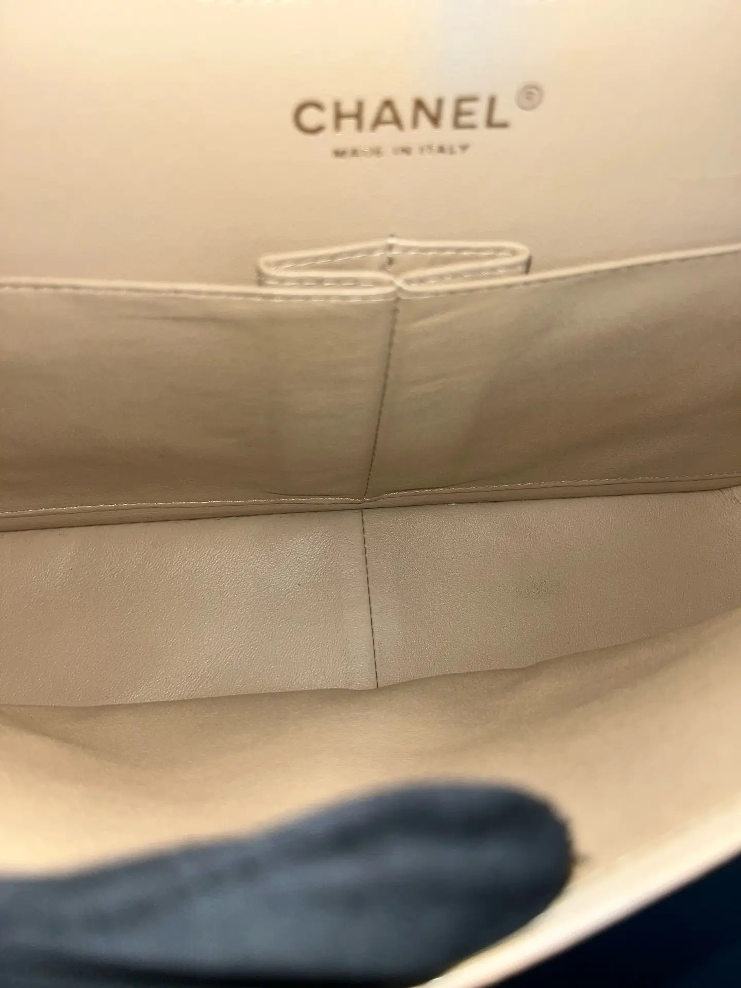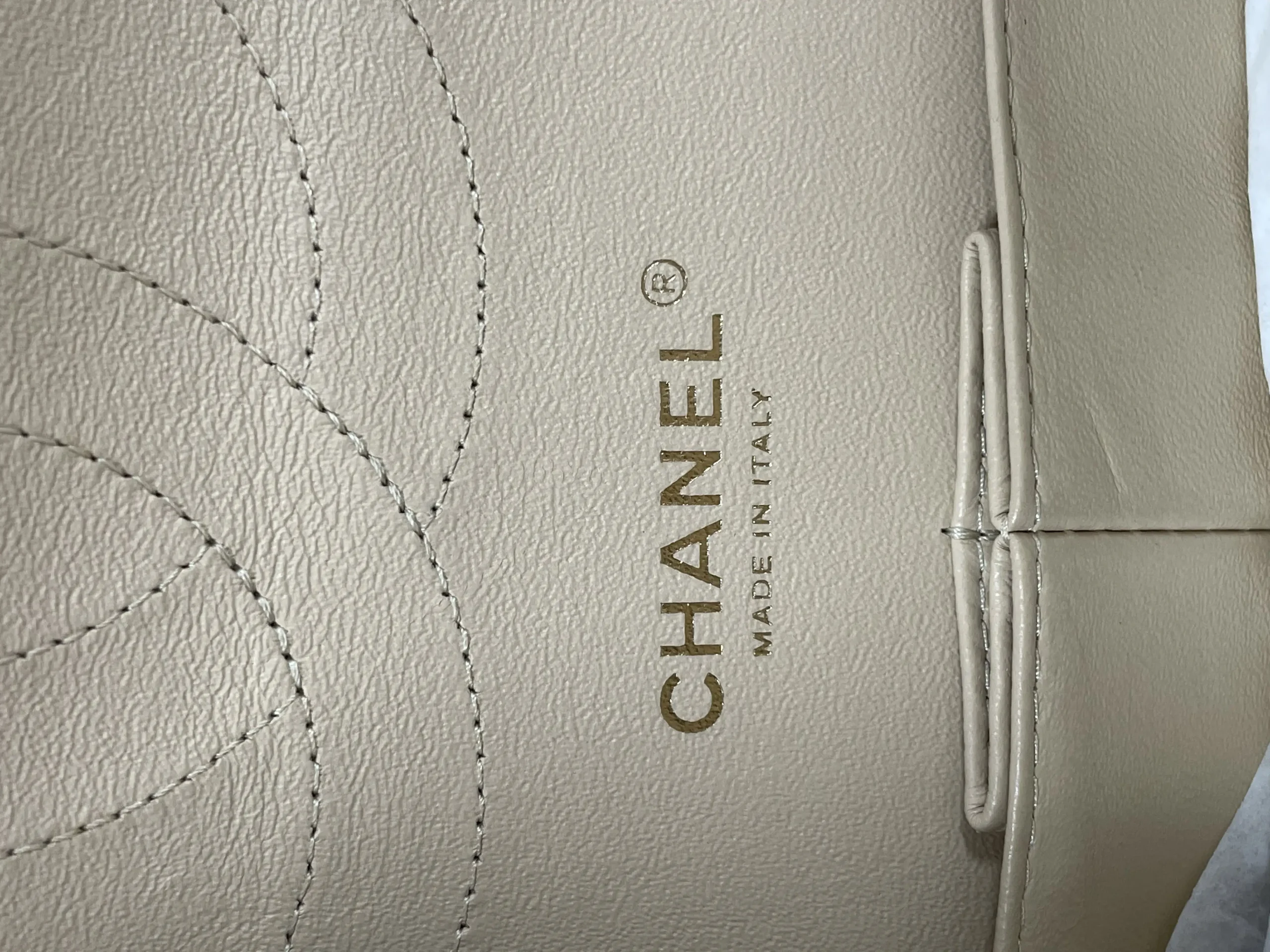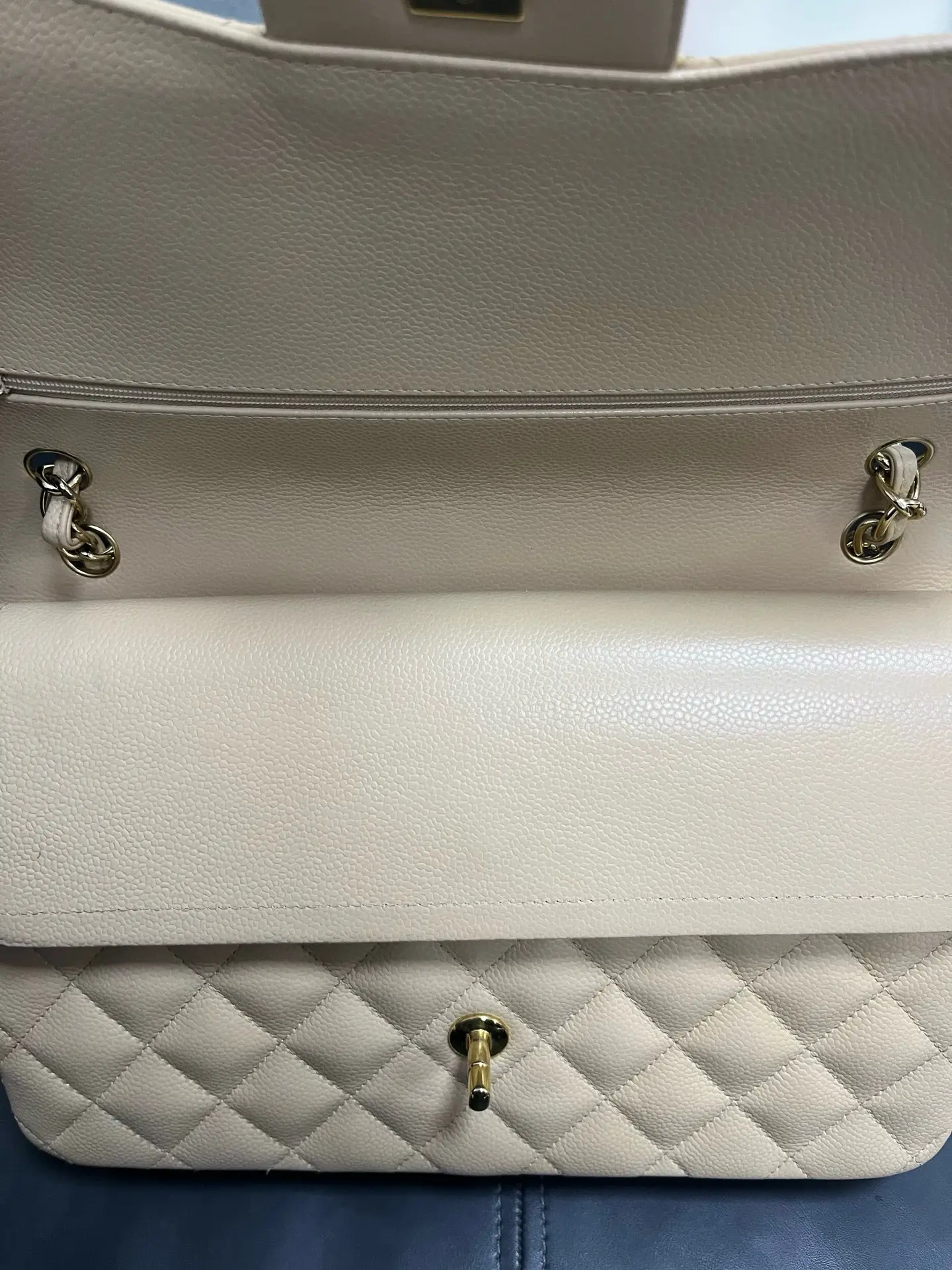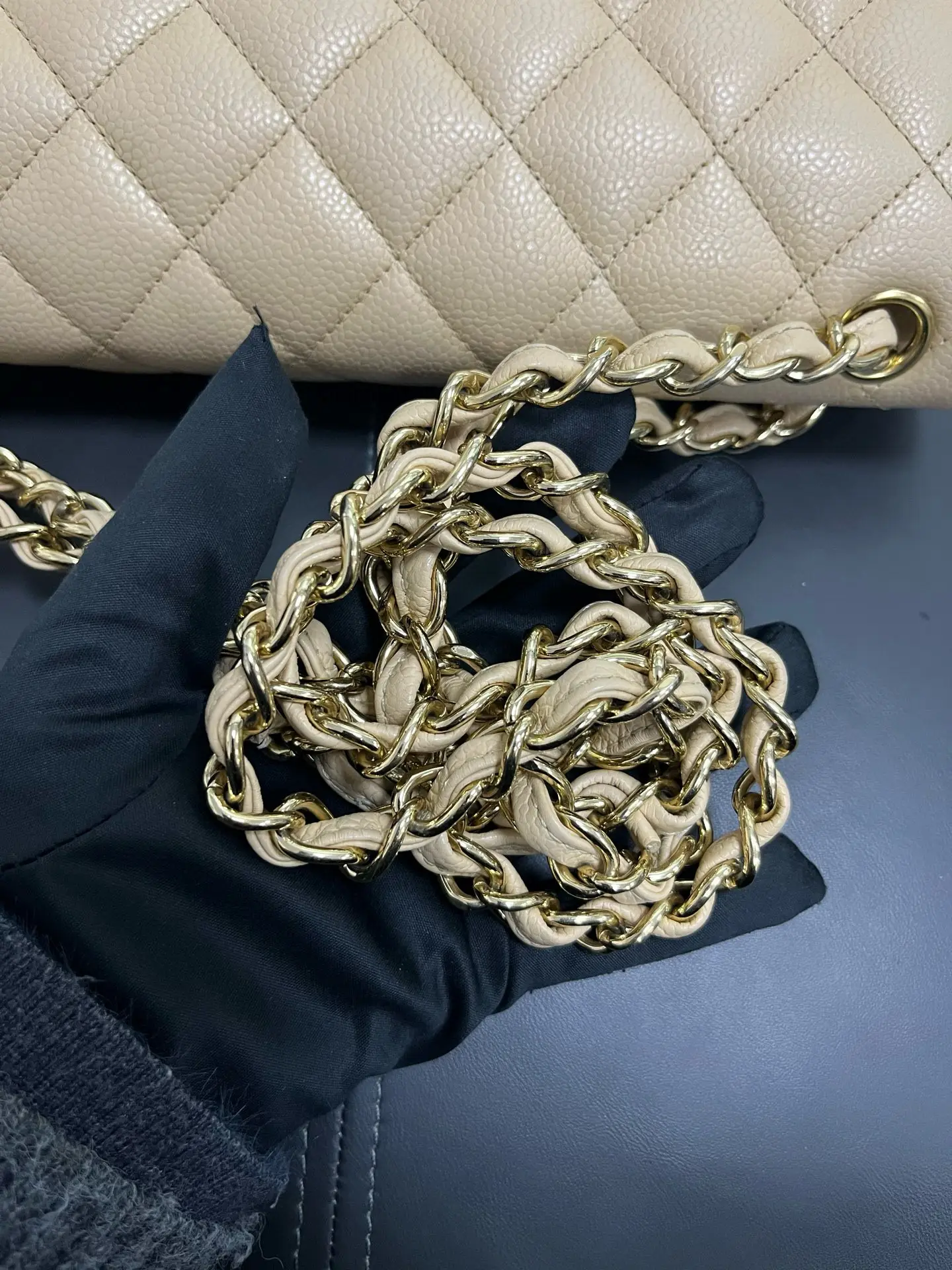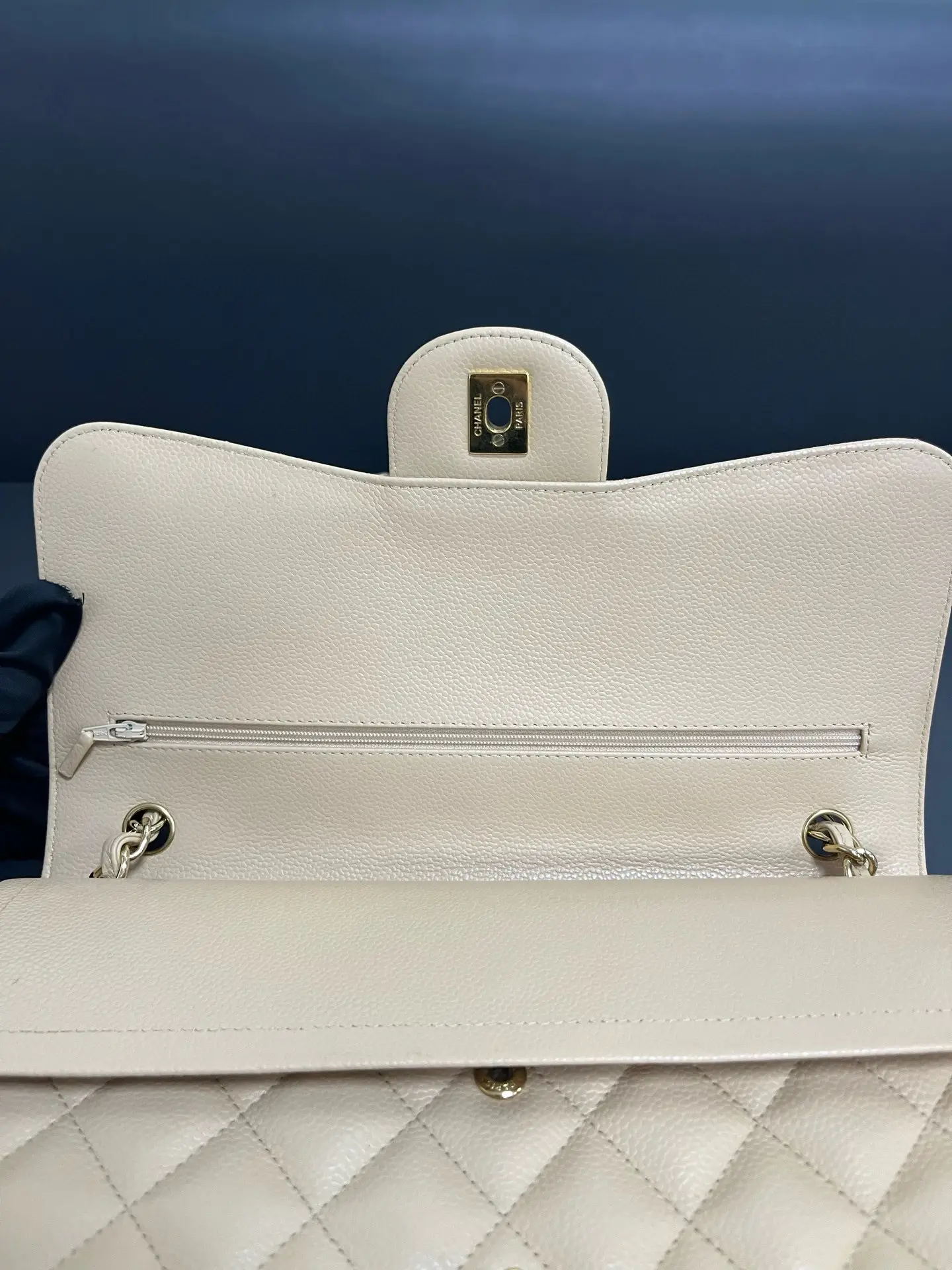 The CHANEL Jumbo Classic Flap Bag in beige caviar leather with gold-tone hardware is the ultimate statement of timeless sophistication, defined by its generously sized yet elegant silhouette, durable diamond-quilted texture, and the warm contrast of its gleaming interlocking CC turn-lock, offering unparalleled presence and versatility.