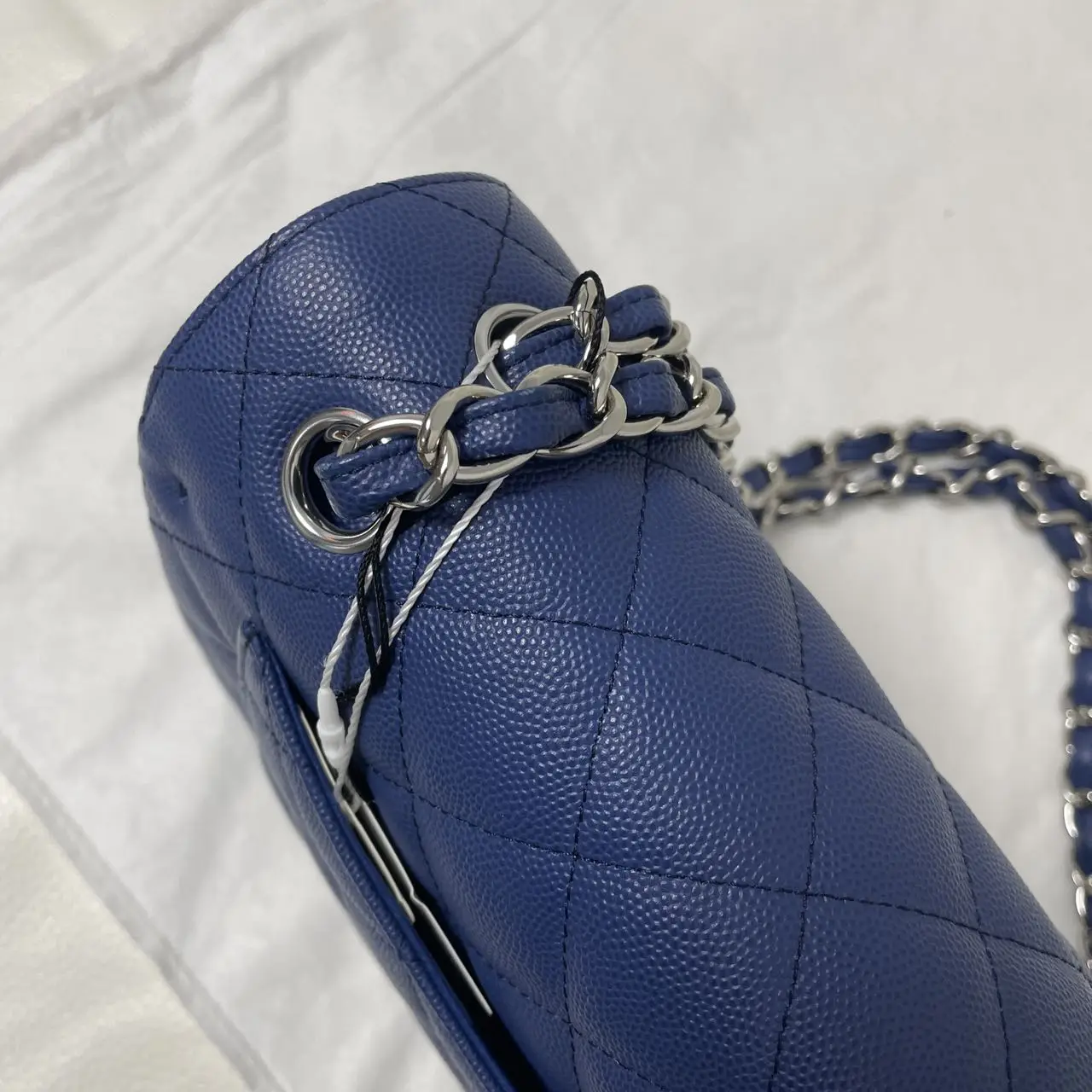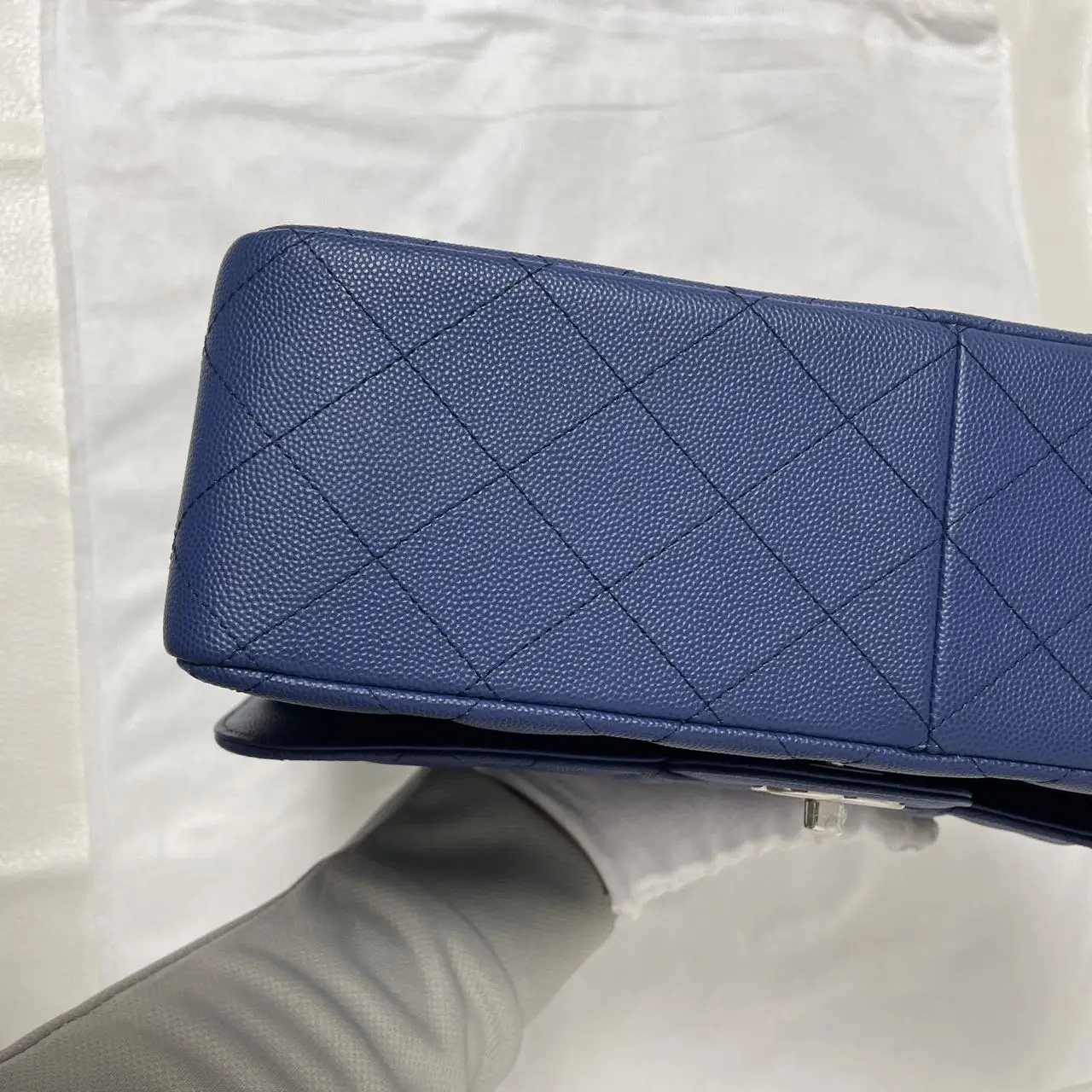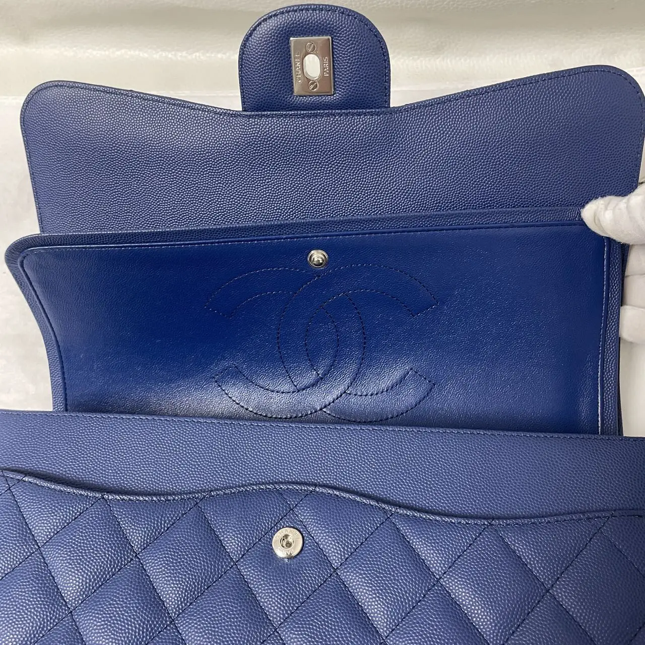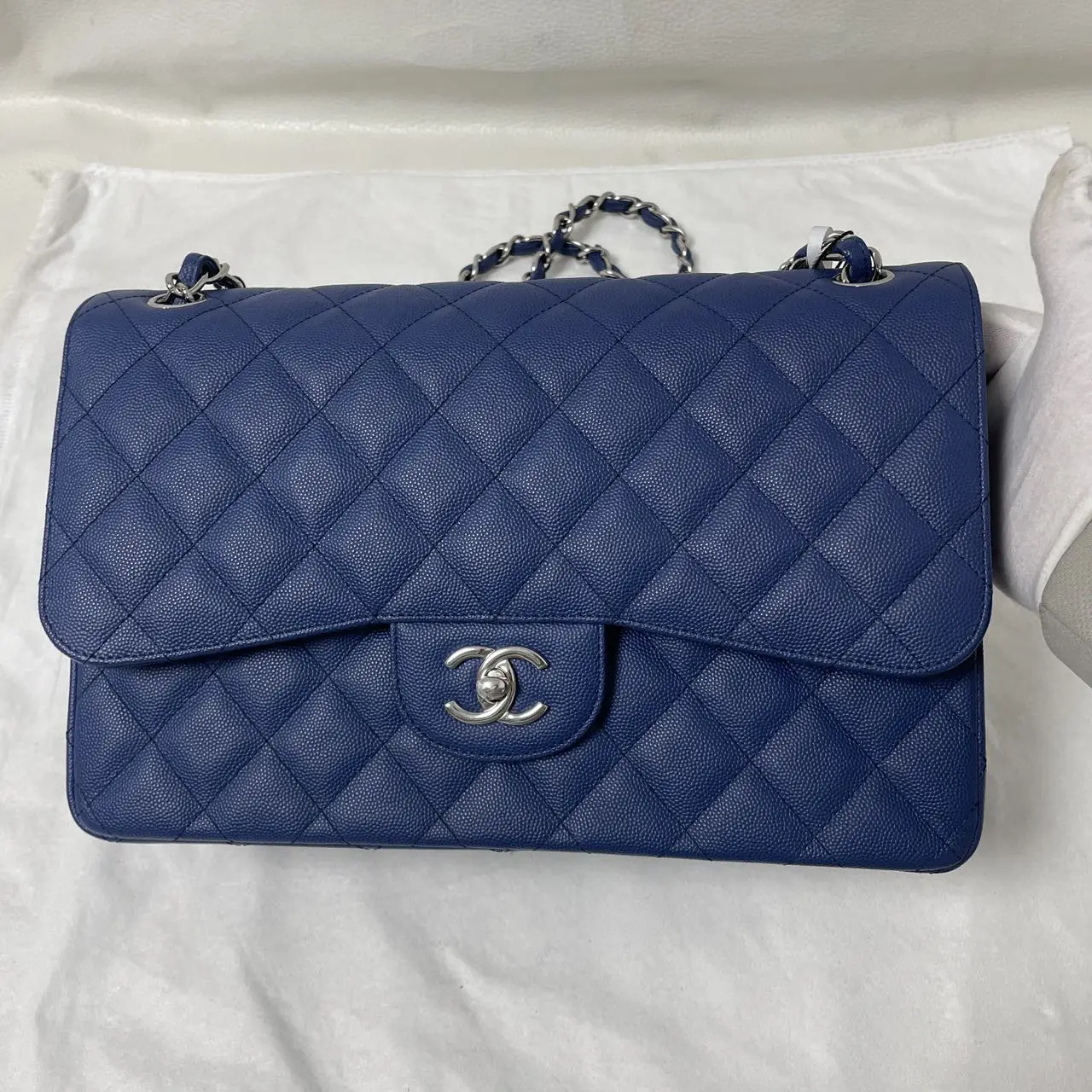 CHANEL Jumbo Classic Flap Navy Caviar is one of the most iconic and timeless handbags in the world of luxury fashion. Crafted from durable caviar leather in an elegant navy shade, this classic flap bag offers the perfect balance between sophistication and everyday practicality. The jumbo size provides generous space while maintaining the structured silhouette Chanel is renowned for. Finished with the signature CC turn-lock and interwoven leather chain strap, it is both instantly recognisable and endlessly versatile. Highly sought after and increasingly rare, this bag remains a strong investment piece that never goes out of style. A true wardrobe icon for collectors and Chanel lovers alike.