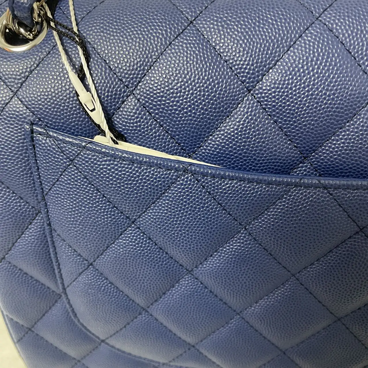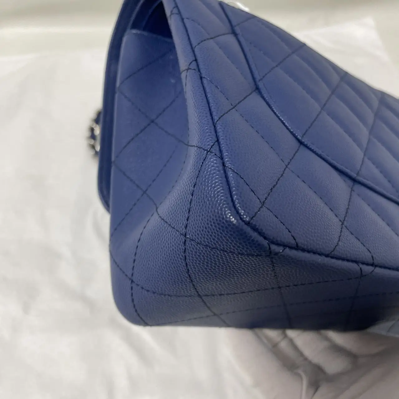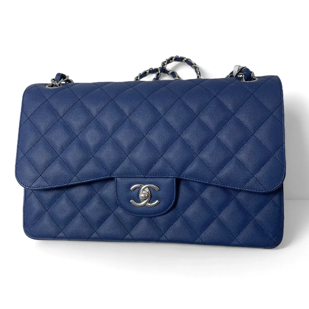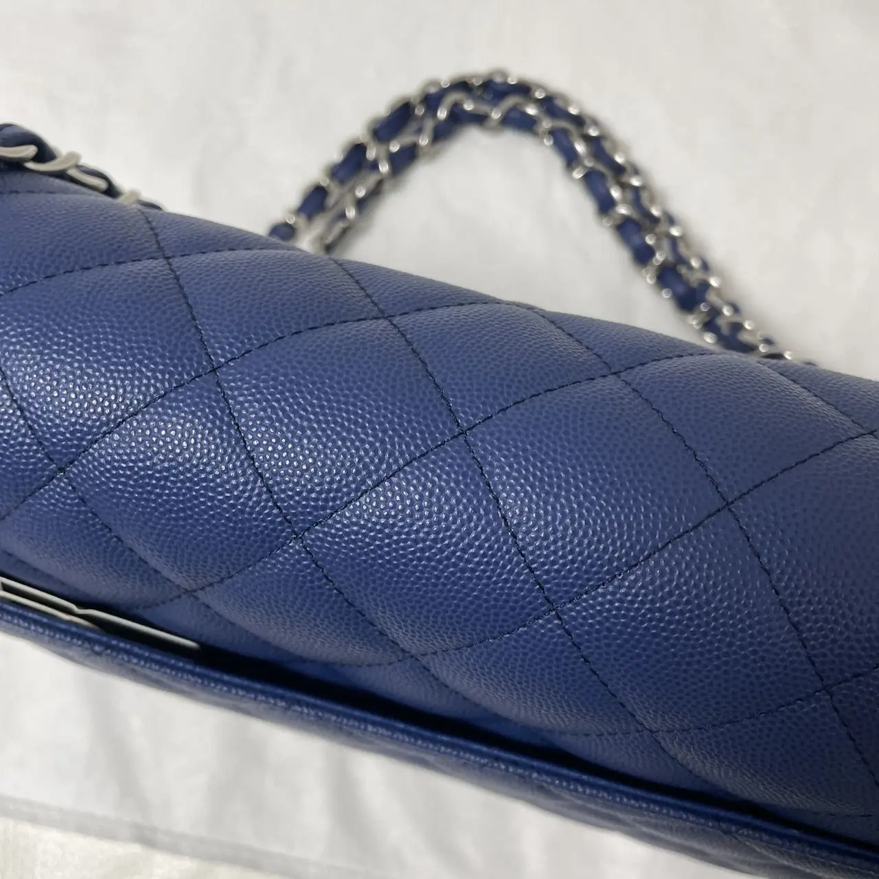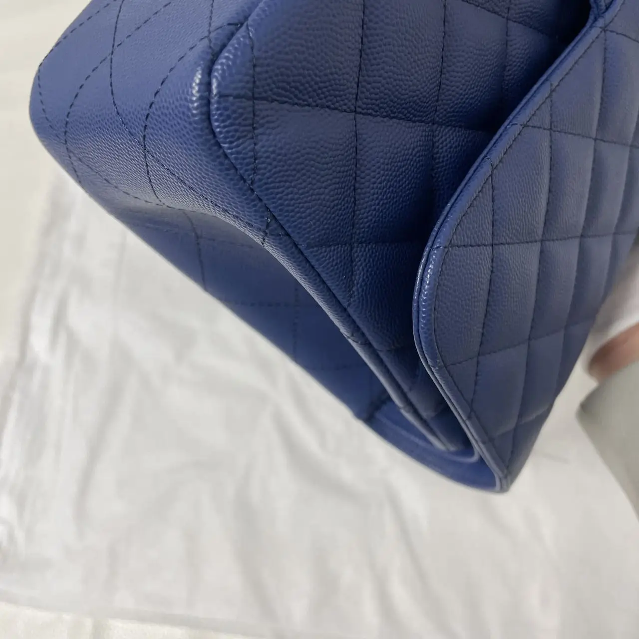CHANEL Jumbo Classic Flap Navy Caviar is one of the most iconic and timeless handbags in the world of luxury fashion. Crafted from durable caviar leather in an elegant navy shade, this classic flap bag offers the perfect balance between sophistication and everyday practicality. The jumbo size provides generous space while maintaining the structured silhouette Chanel is renowned for. Finished with the signature CC turn-lock and interwoven leather chain strap, it is both instantly recognisable and endlessly versatile. Highly sought after and increasingly rare, this bag remains a strong investment piece that never goes out of style. A true wardrobe icon for collectors and Chanel lovers alike.