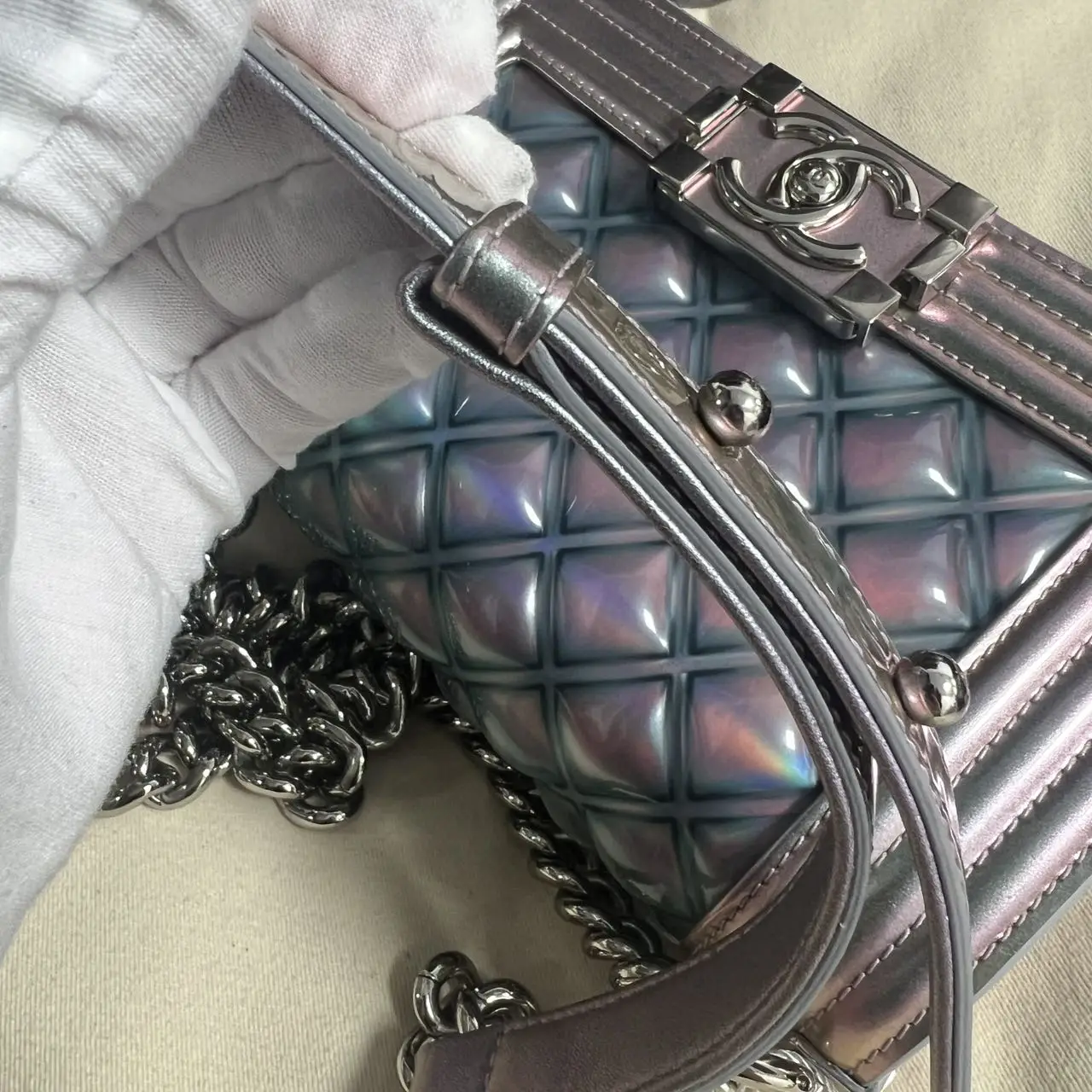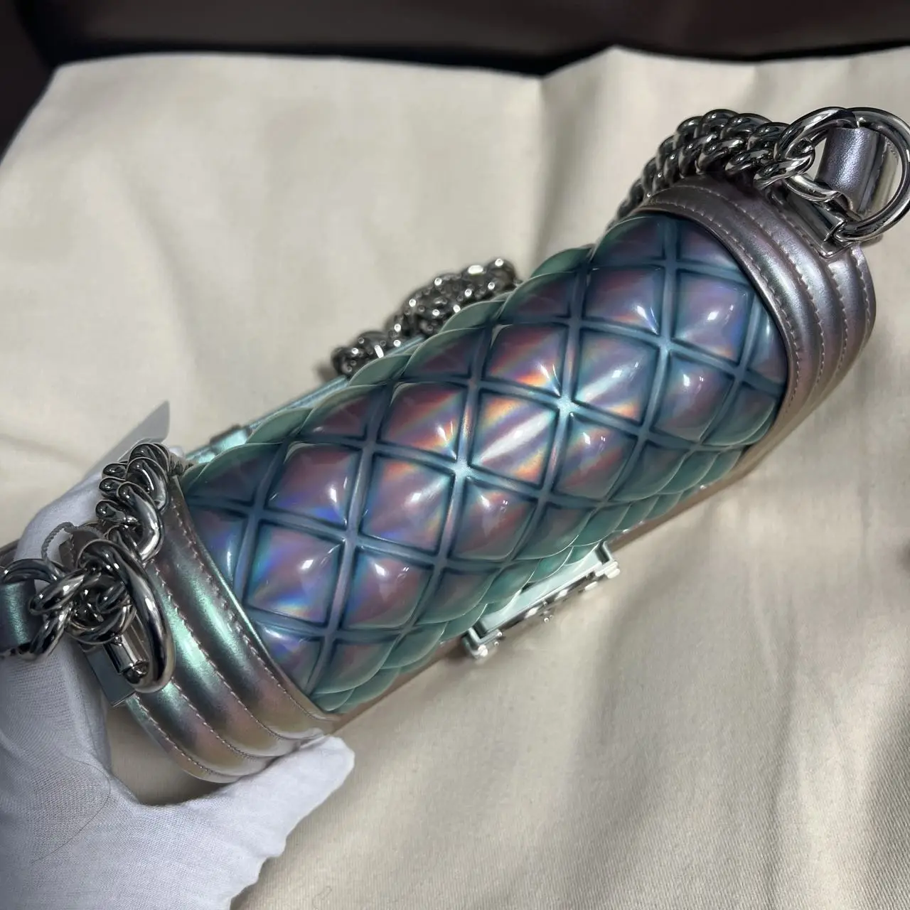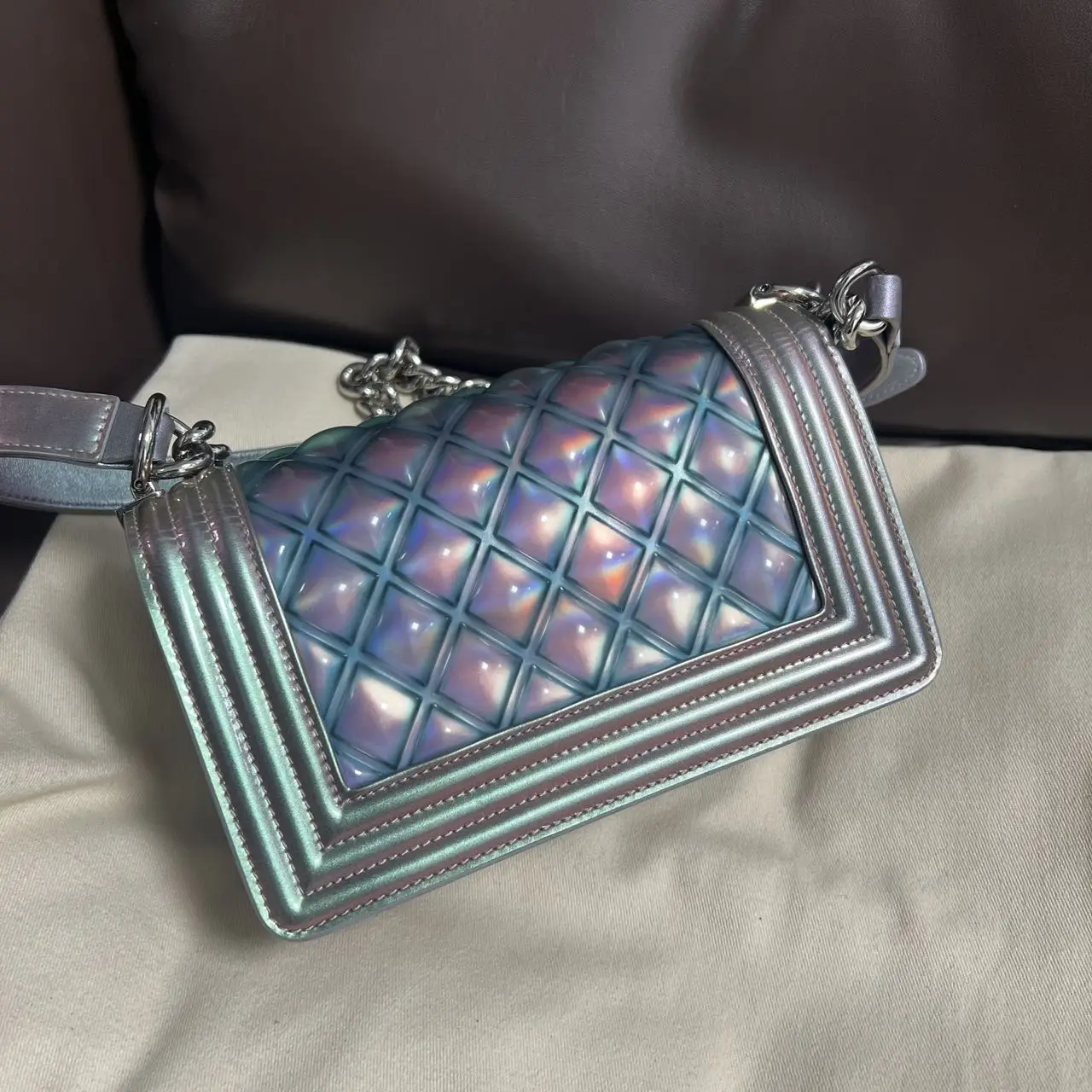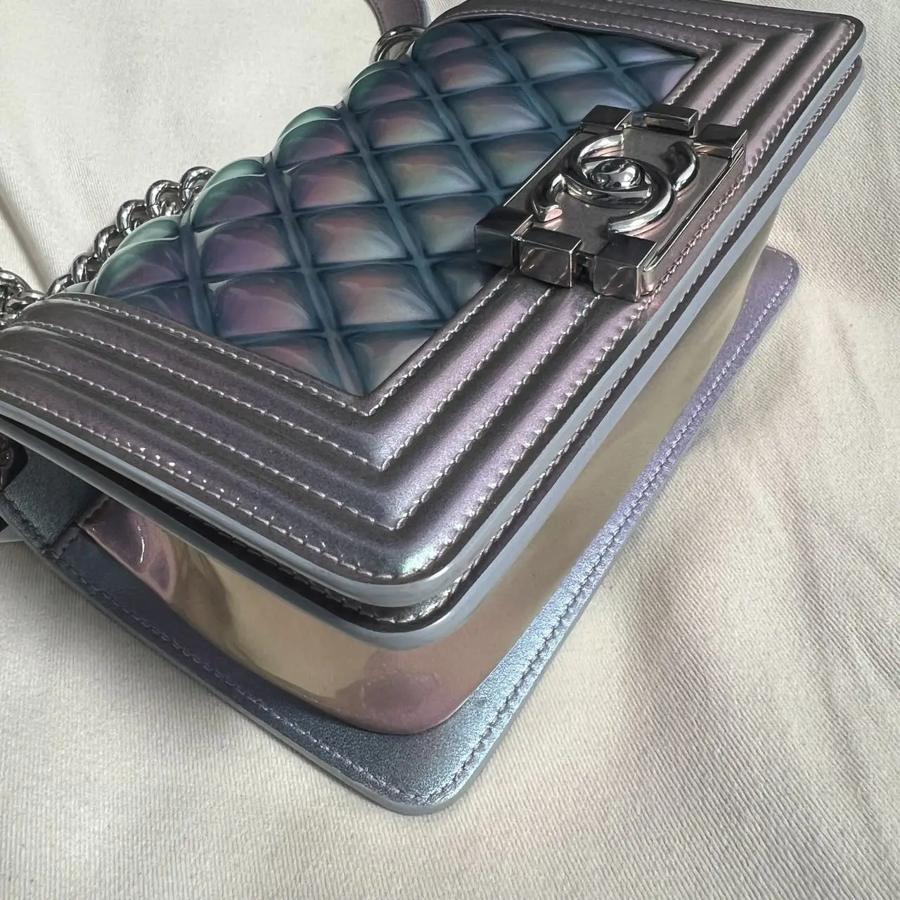 The Chanel Boy bag in iridescent purple quilted calfskin with silver-tone hardware is a captivating piece, where the collection’s signature structured silhouette is transformed by a luminous, color-shifting finish and geometric quilting, creating a modern and ethereal statement accessory.
