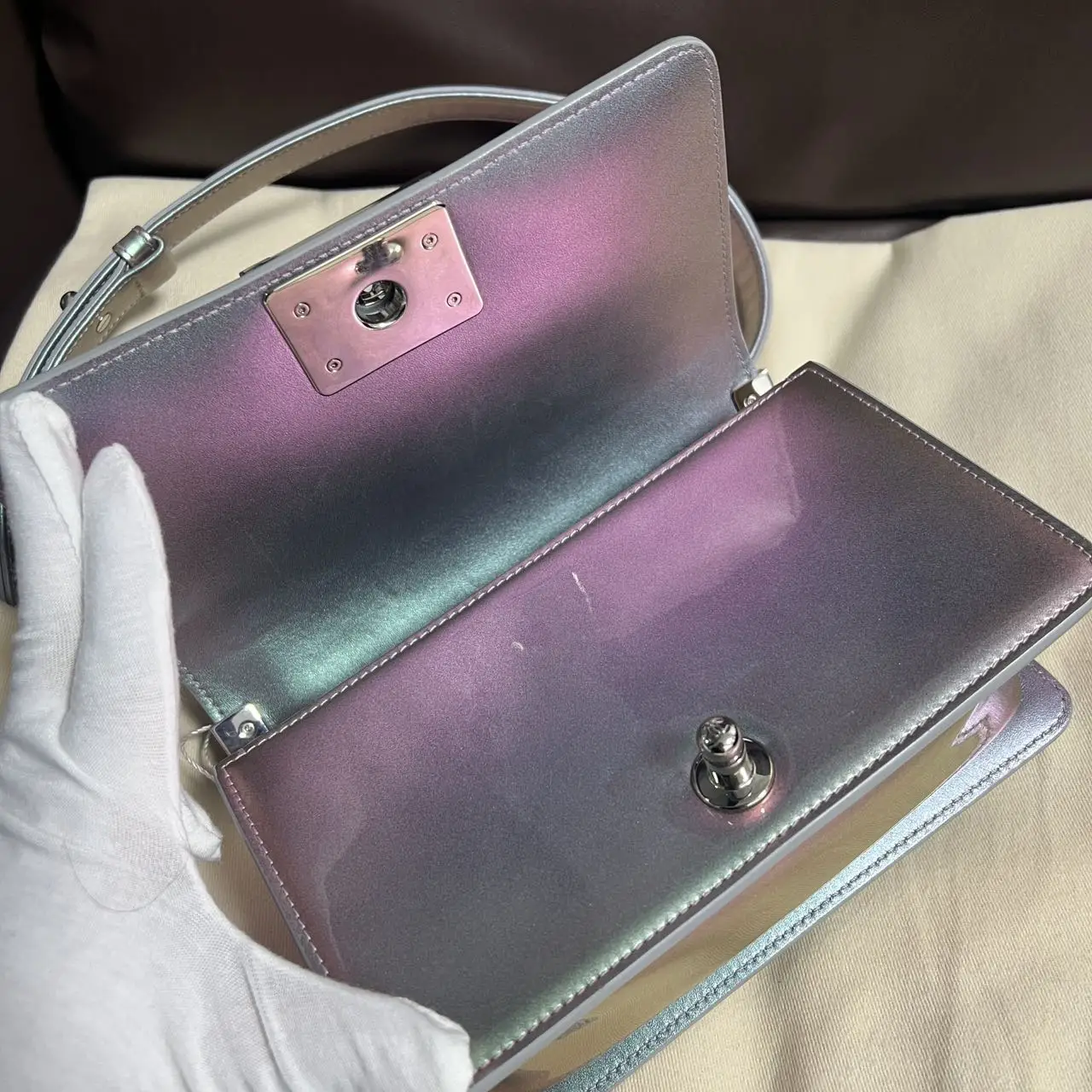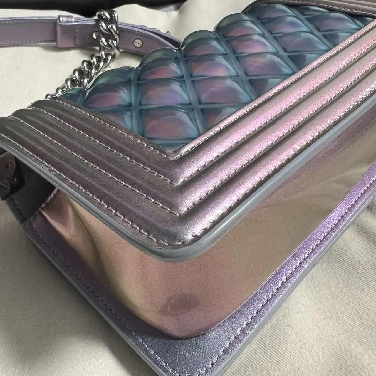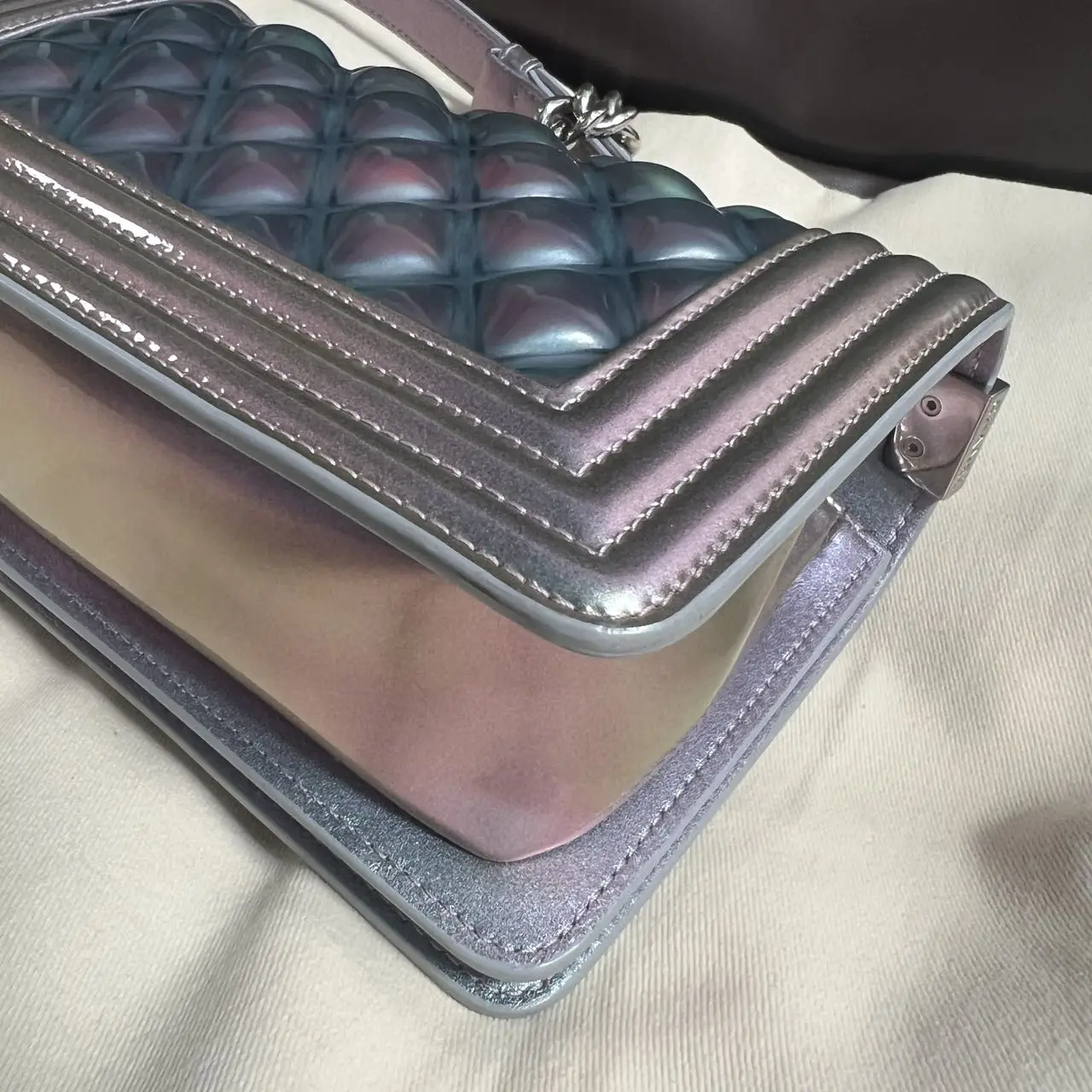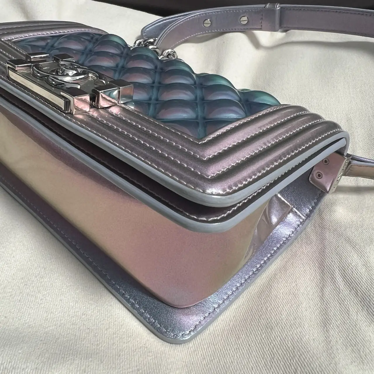 The Chanel Boy bag in iridescent purple quilted calfskin with silver-tone hardware is a captivating piece, where the collection’s signature structured silhouette is transformed by a luminous, color-shifting finish and geometric quilting, creating a modern and ethereal statement accessory.