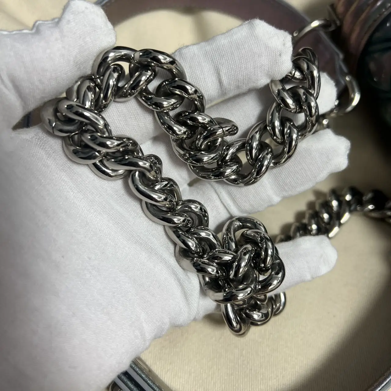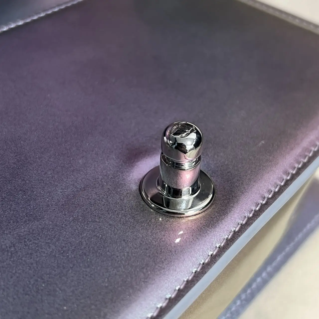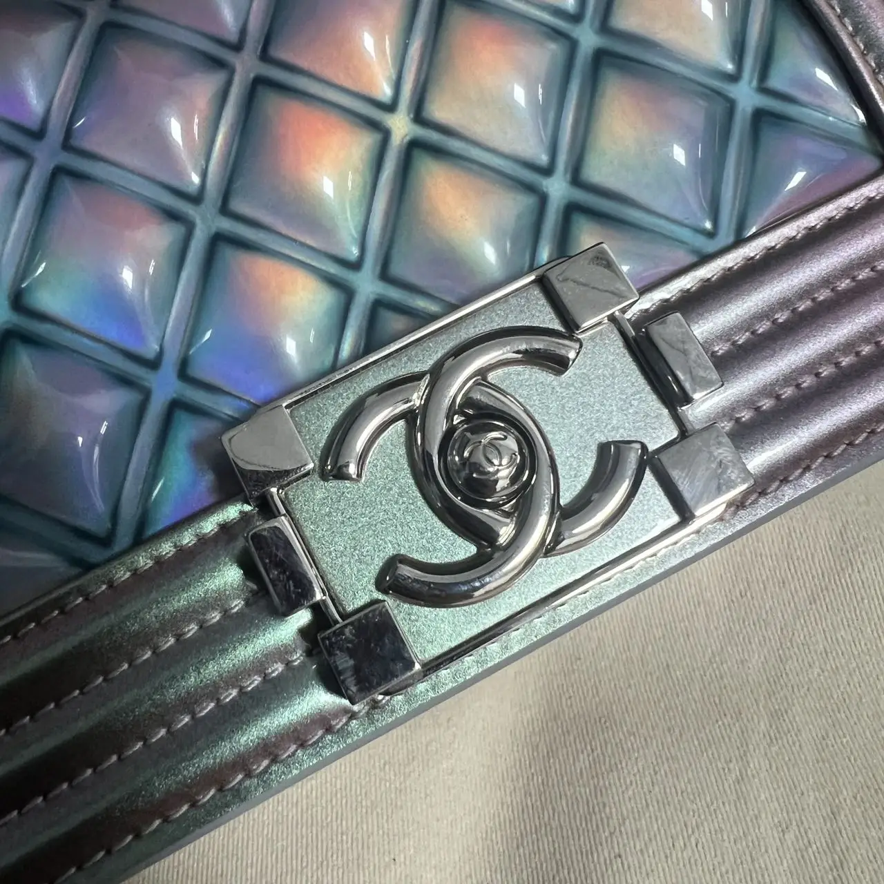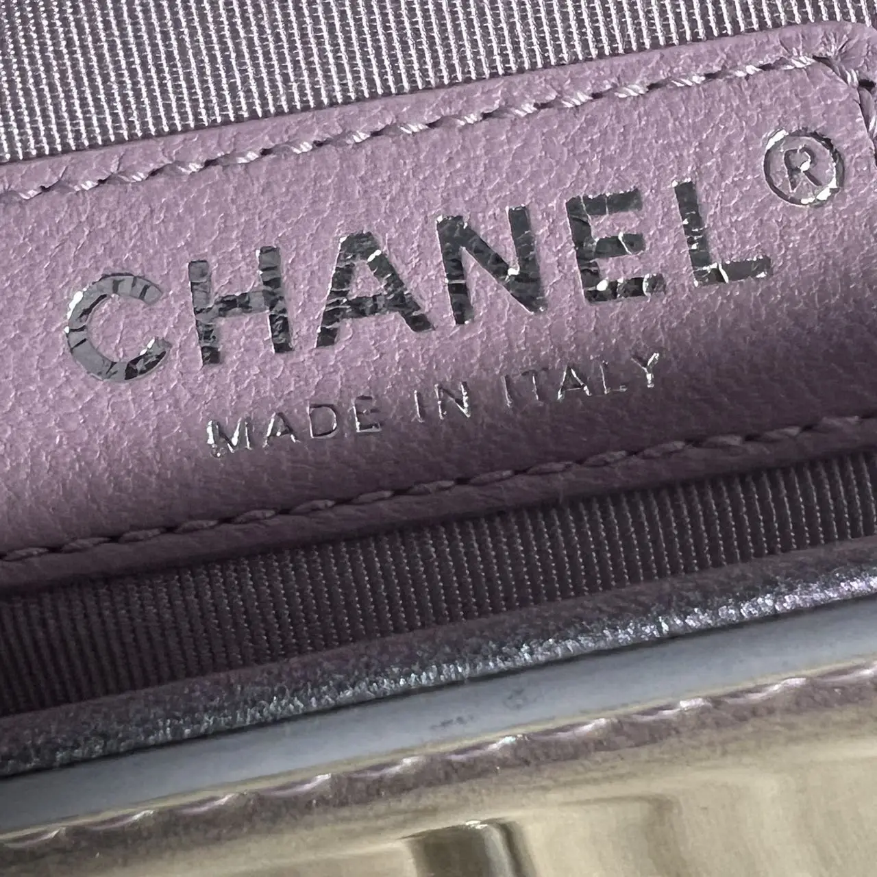 The Chanel Boy bag in iridescent purple quilted calfskin with silver-tone hardware is a captivating piece, where the collection’s signature structured silhouette is transformed by a luminous, color-shifting finish and geometric quilting, creating a modern and ethereal statement accessory.