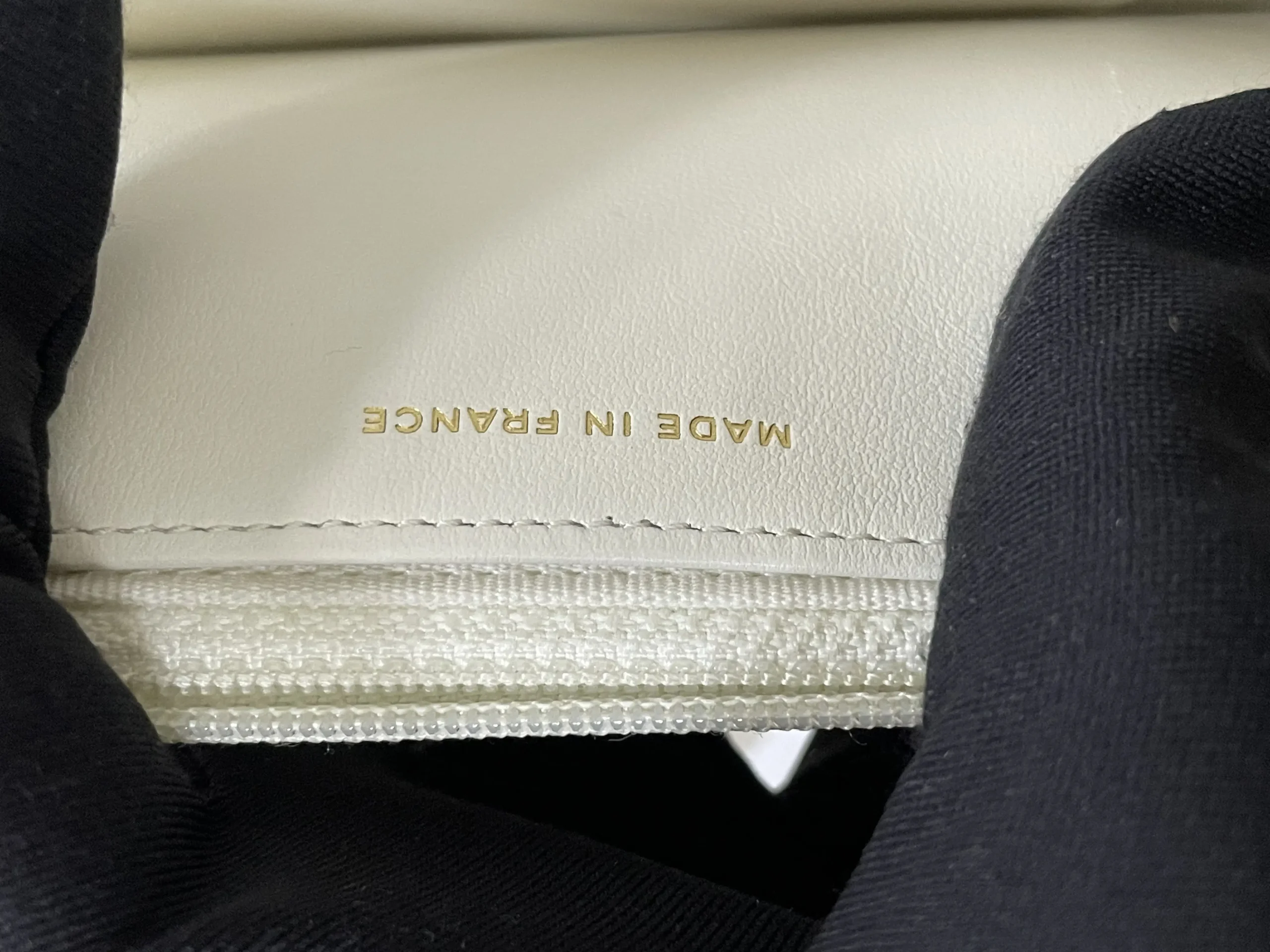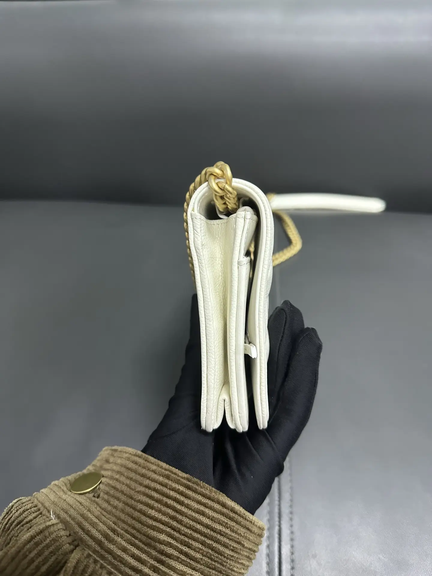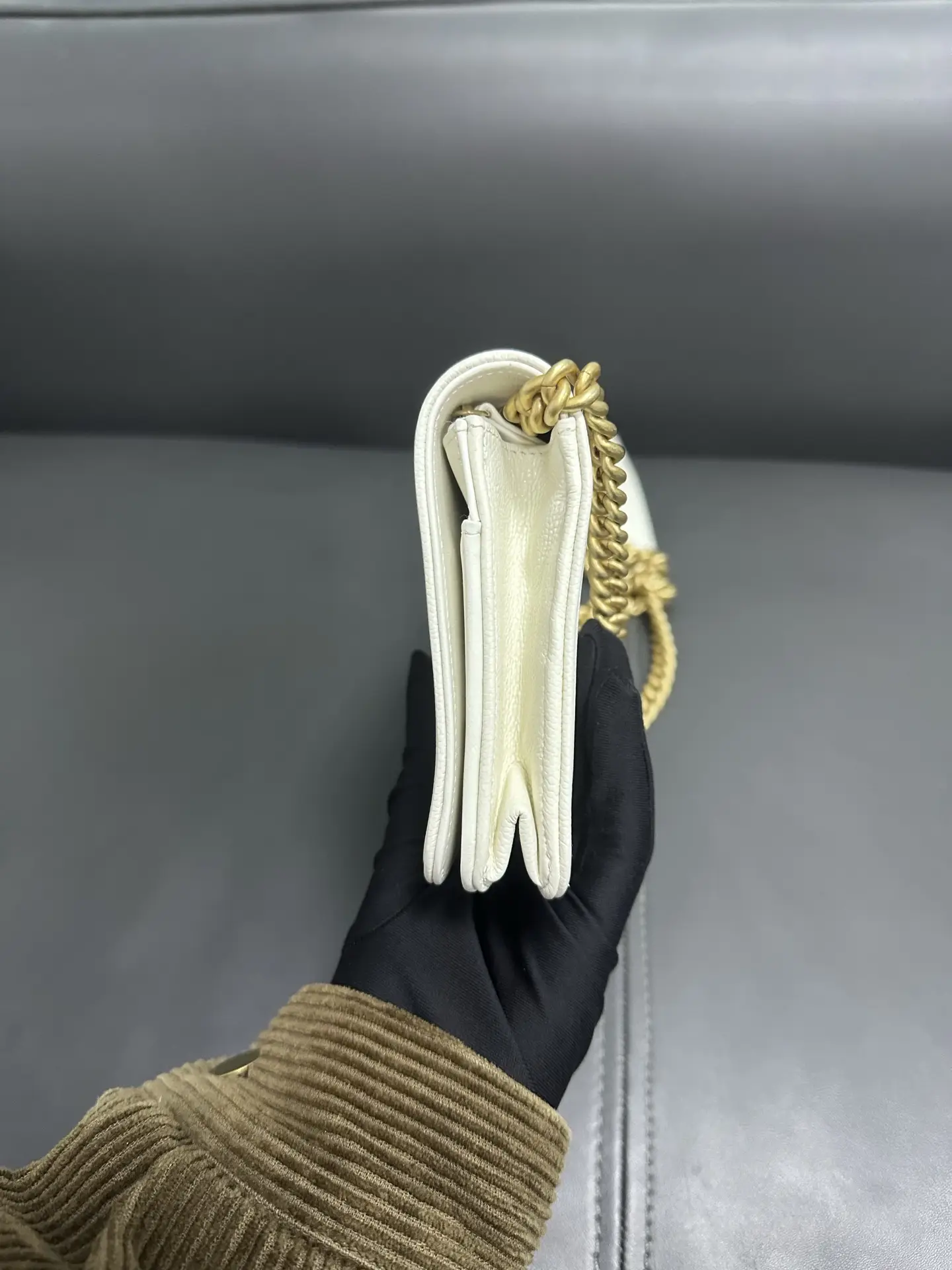 The Chanel Le Boy Wallet on Chain in white caviar leather with gold-tone hardware reinterprets the collection’s signature structured silhouette in a compact format, merging durable texture with the chain-strap convenience of a WOC for a sleek, modern accessory.